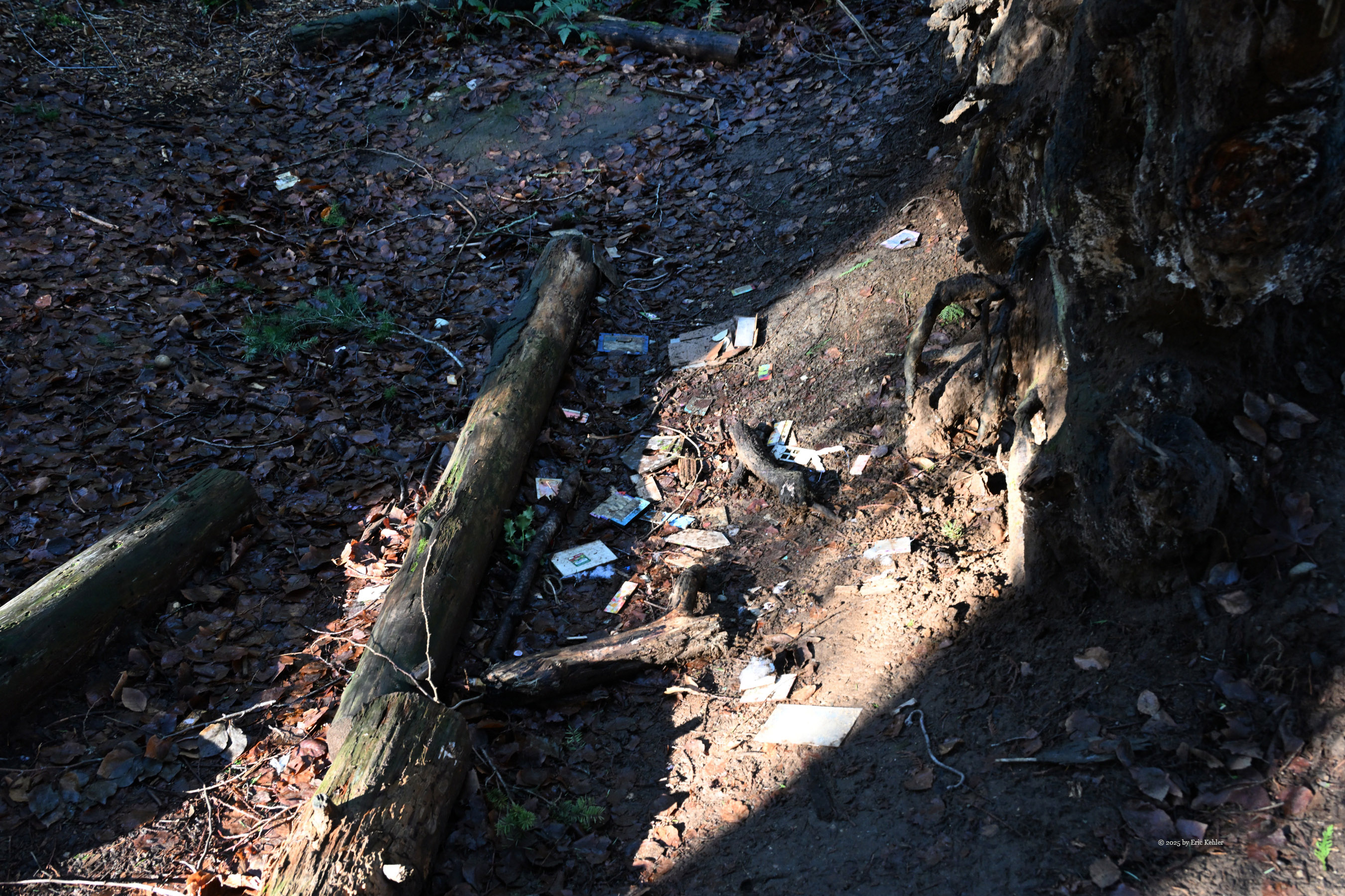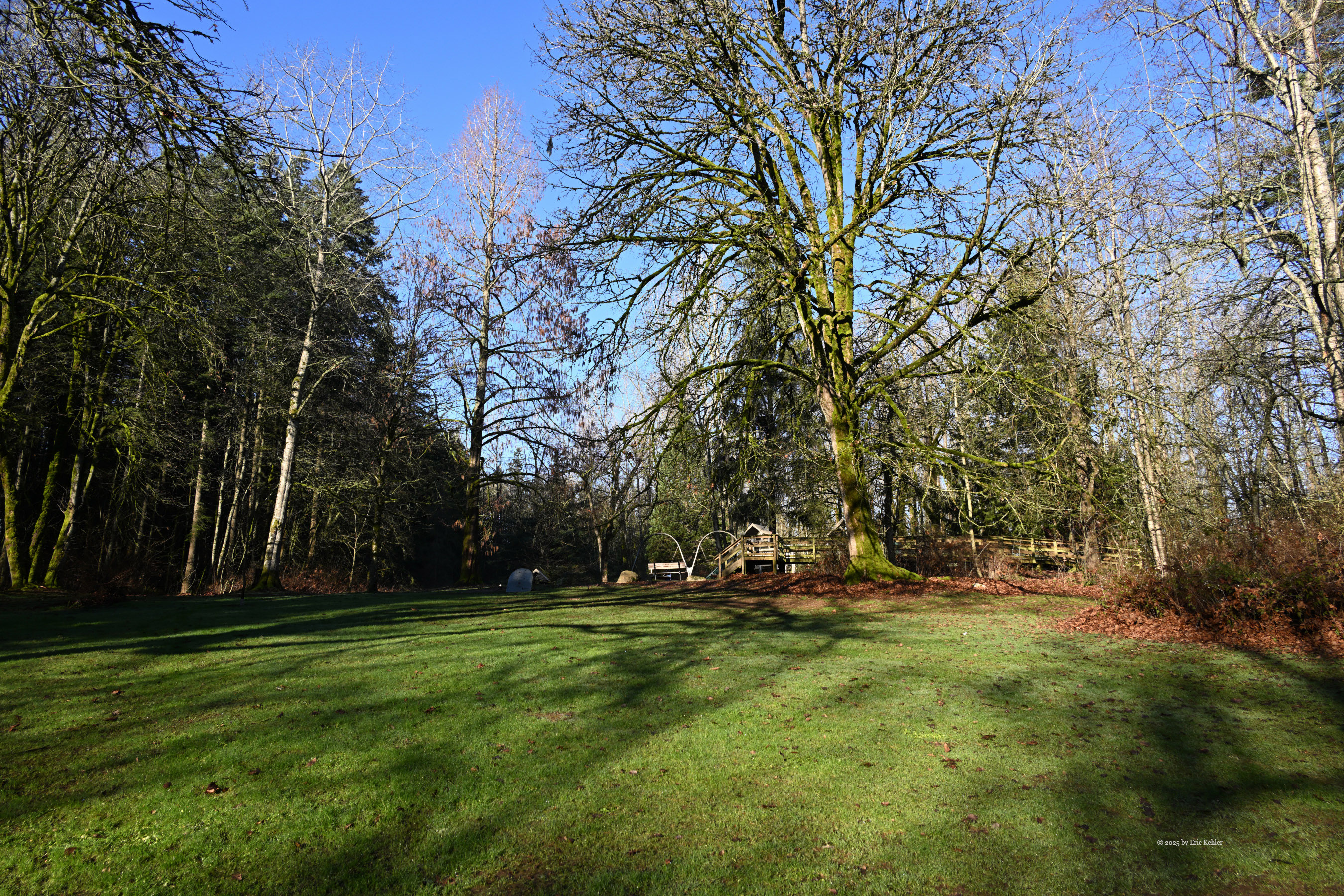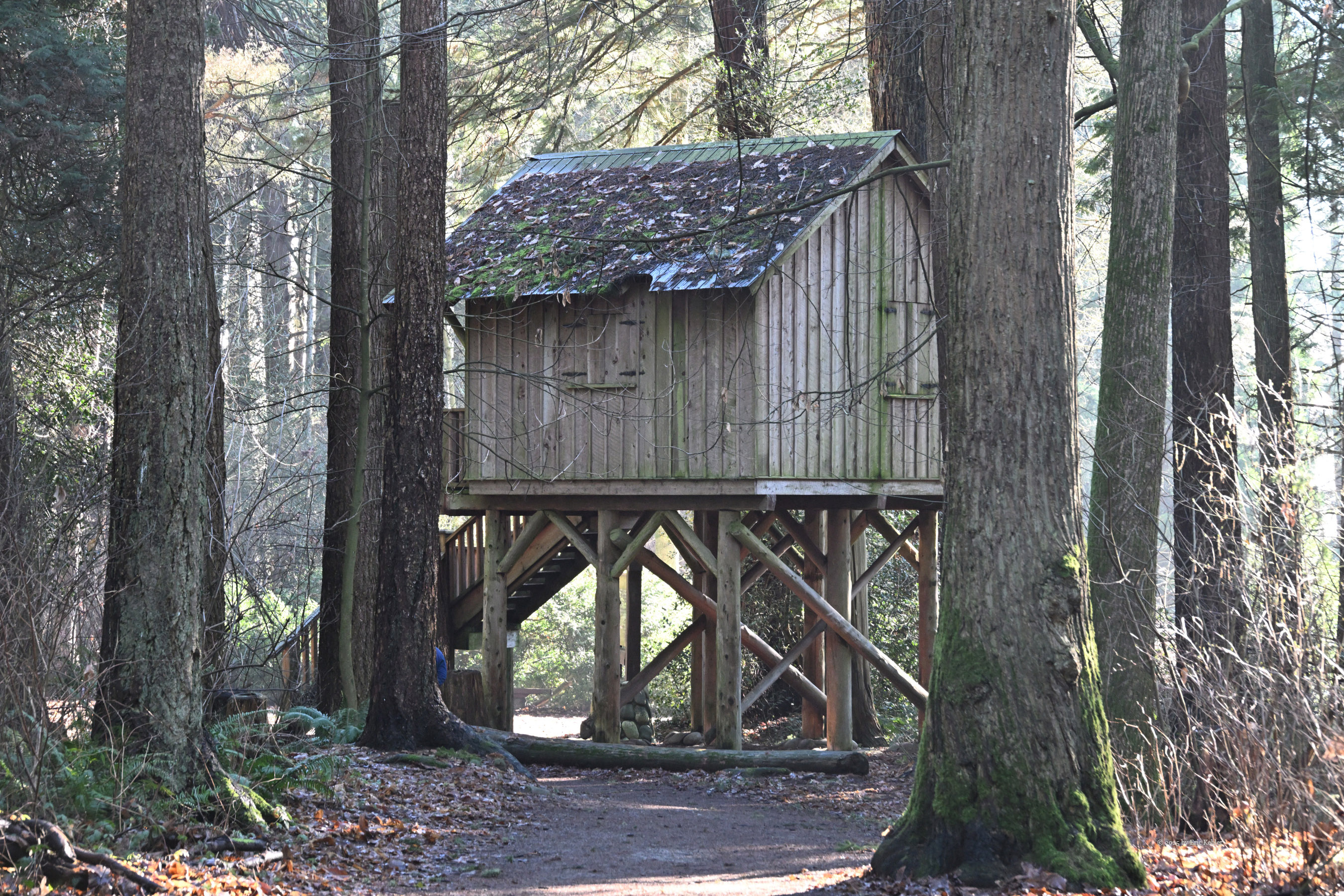 By now the sun had warmed the area enough that the early mists were gone and the air was not so bitter. It made for a nice invitation to take a walk through the park with my camera. I packed up my station and stowed it in my car and then set out to view other areas of the park. I wandered back past where I had operated continuing into the woods and stopped to take a few photos of the scenery. I tried a few different angles of the famous treehouse whose historical value was the reason the park is on the POTA list. The roof is rotting in one area and likely needs some attention before the interior gets wet. I then continued along the trail to the fairy village. Unfortunately, the fairies had gone south for the winter and there were only a couple of houses to be found. I thought that they might have gotten damaged in the windstorms but there were not enough broken pieces to account for them all. Rumours suggest that either the parks people clear them out periodically to make room for more or that well-wishers collect them for the winter and bring them back come spring. I do hope it is the latter as some of those homes were quite pretty and took a lot of work to make. Disappointed in not catching up with the fairies I continued my walk along the trails back to my car. I did pass by the upper tables and sure enough the ground was very soggy. Done with my operating and stroll through the park I returned to my car and set out on the short drive back home.