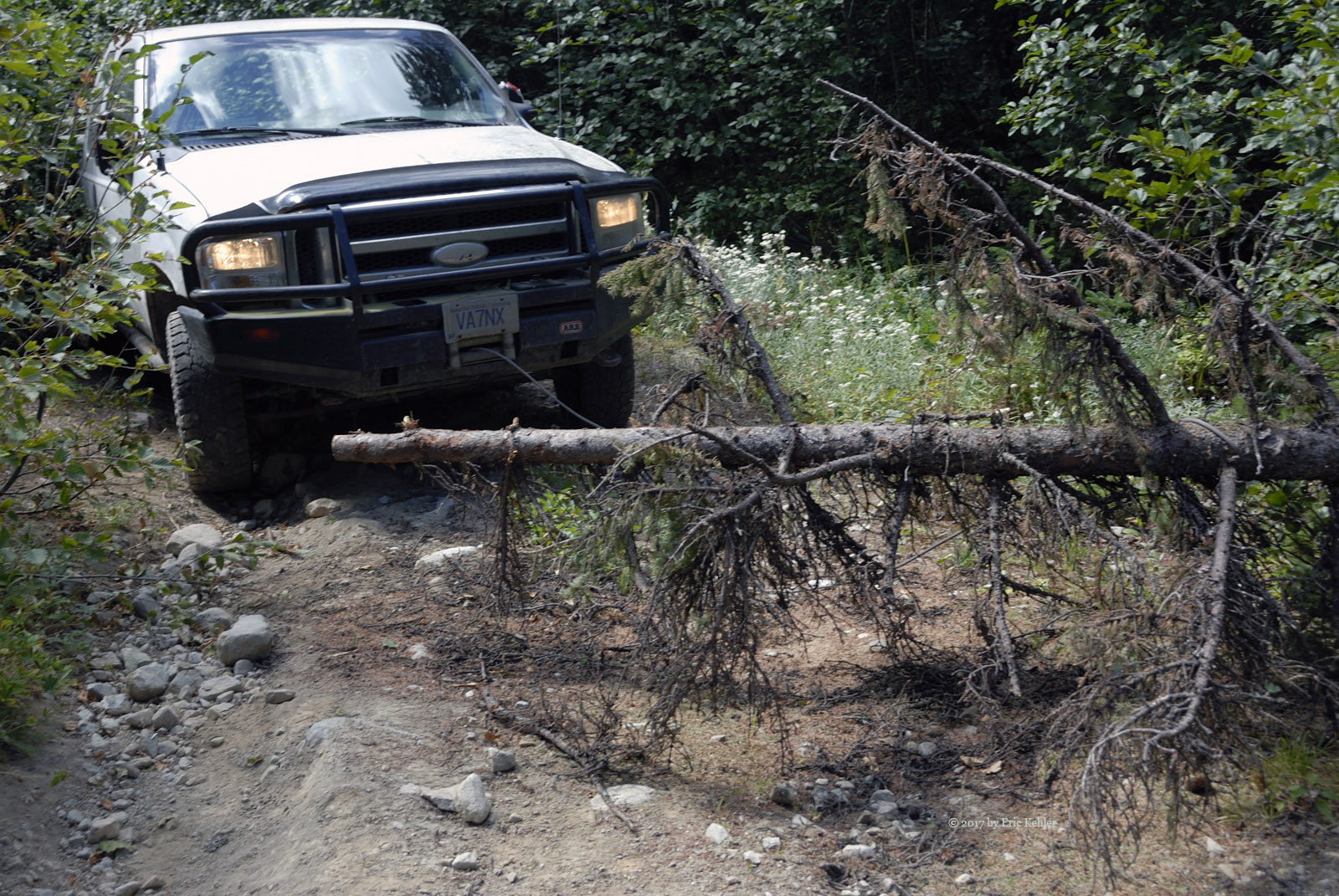 The drive to Falls Lake went very smoothly though the construction on the highway was a bit annoying, we arrived in good time at the lake parking area and there we switched the truck into 4x4 mode and started up the narrow road. Last year the road was quite rutted with water erosion, today it was getting ever worse. The ‘road’ actually left the original road in one spot to get past the deep caverns the water had dug. After getting past the erosion we turned onto an even smaller side road which cut through the trees to the gas line right-of-way above the road. This road is extremely steep and gravel covered, it requires switching down into low 4x4 mode and about half way up the steepest portion we encountered a fallen tree! Well we couldn’t get past with it there, so I attached the winch to the tree and dragged it. I was hoping to snap off the upper portion but instead the whole tree came along. That got it cleared and then I started back up the slope to the level area far above.