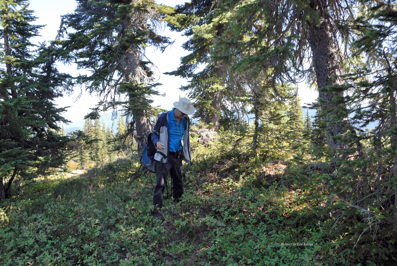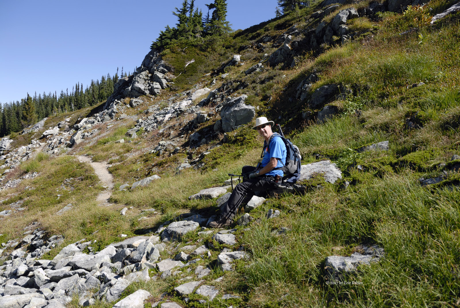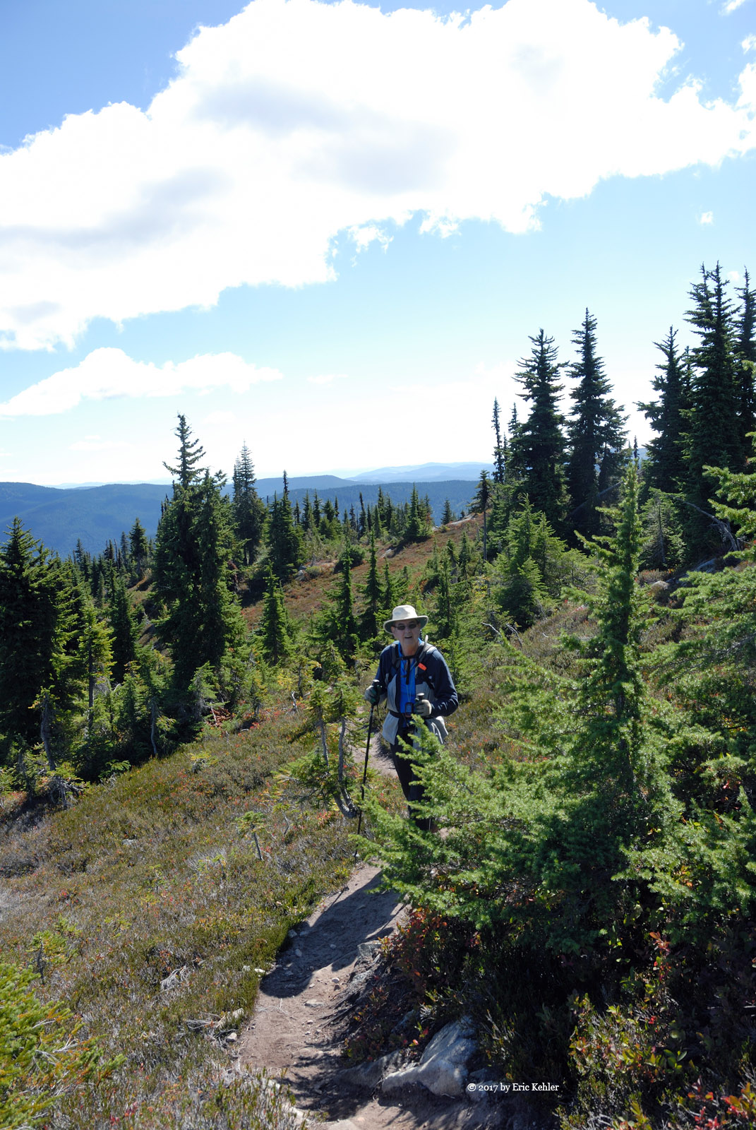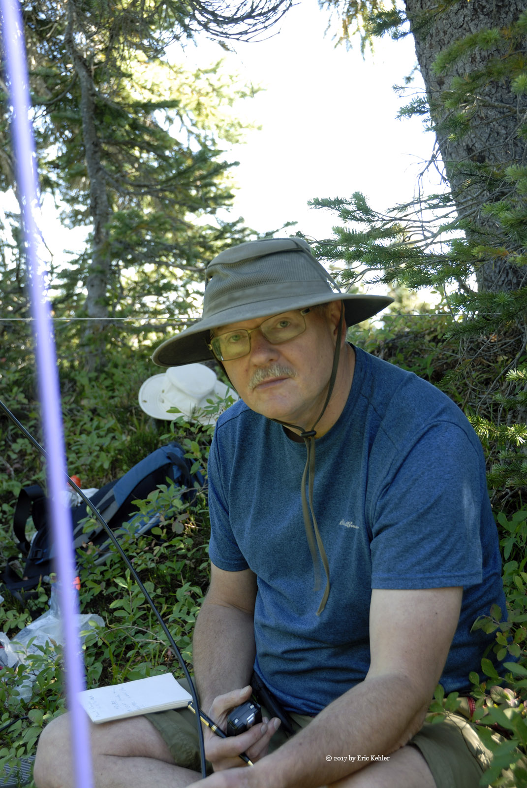 The bulk of the trail meanders along the ridge skirting the steeper sections and sub-peaks until it finally reaches the true summit. Here the trail looks quite challenging from the distance. Fortunately it is easier to walk than it looks. We arrived at the summit and sat and enjoyed our lunch before setting up our radios for contacting other amateurs in the Summits-on-the-air program. Ralph soon had 7 CW contacts in his log, I struggled to get 2 voice, both of these were with hams in the Princeton area! Well I tried for some time to get two more but was not able to reach anyone. So we packed up and started the return journey.