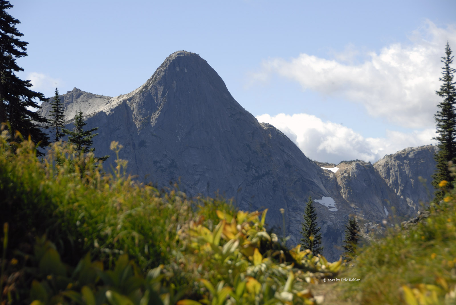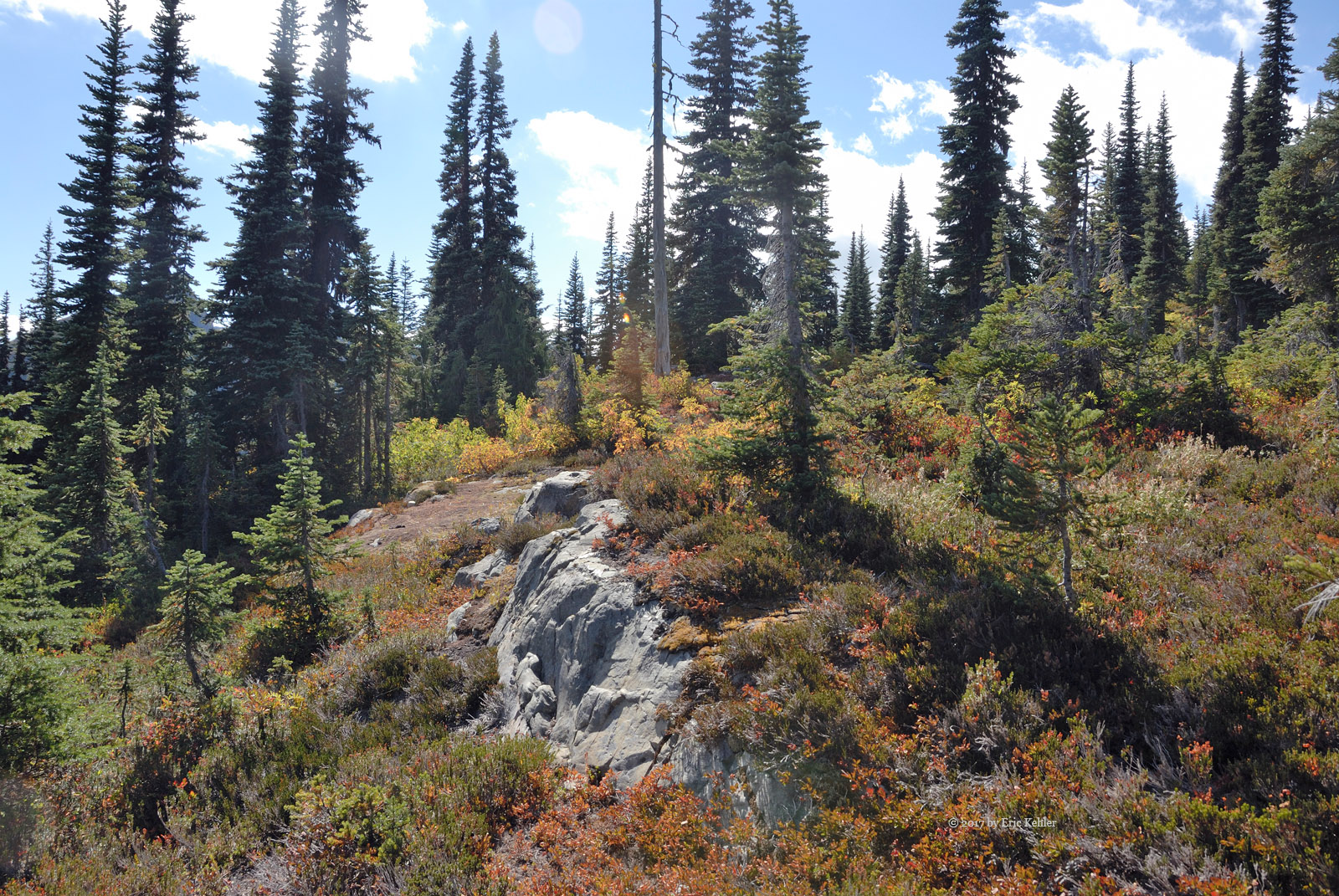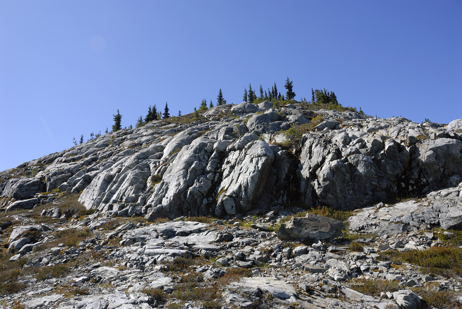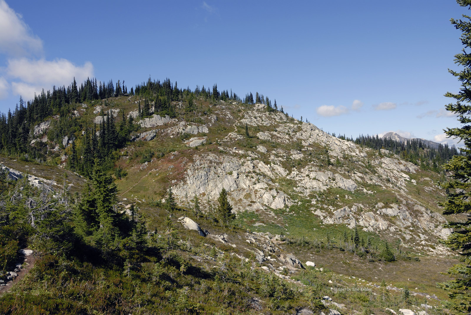 Once parked I checked under the truck to ensure no grass was near the exhaust system and then Ralph and I got ready for the hike. We locked up the truck and made for the trailhead a 150 feet below us. Then climbing a steep bit of rock we were on the well-travelled trail to the summit. We made decent time up the initial steep section of the trail, the cool air and almost hidden sun allowed us quick work in this area. Once on the ridge the sun wouldn’t bother us as much. We were fortunate that the clouds kept the sun at bay for most of our initial climb.
