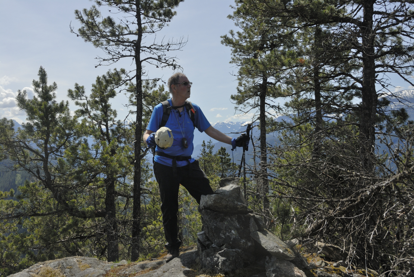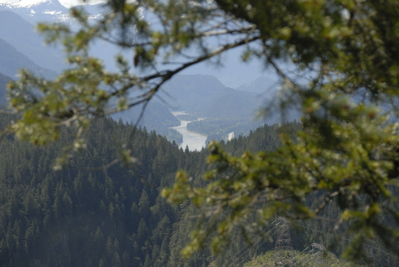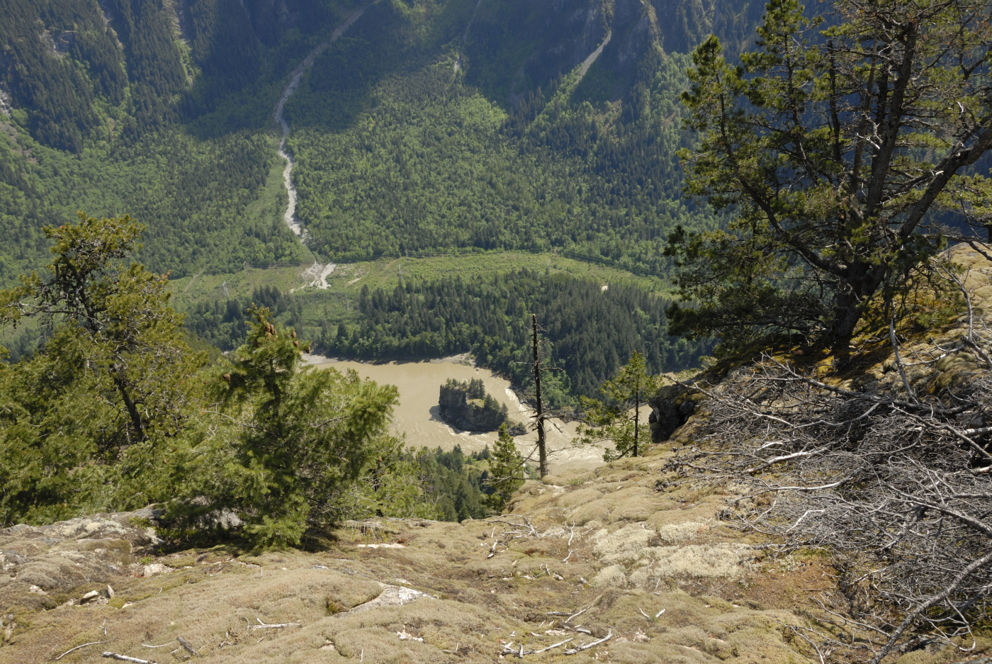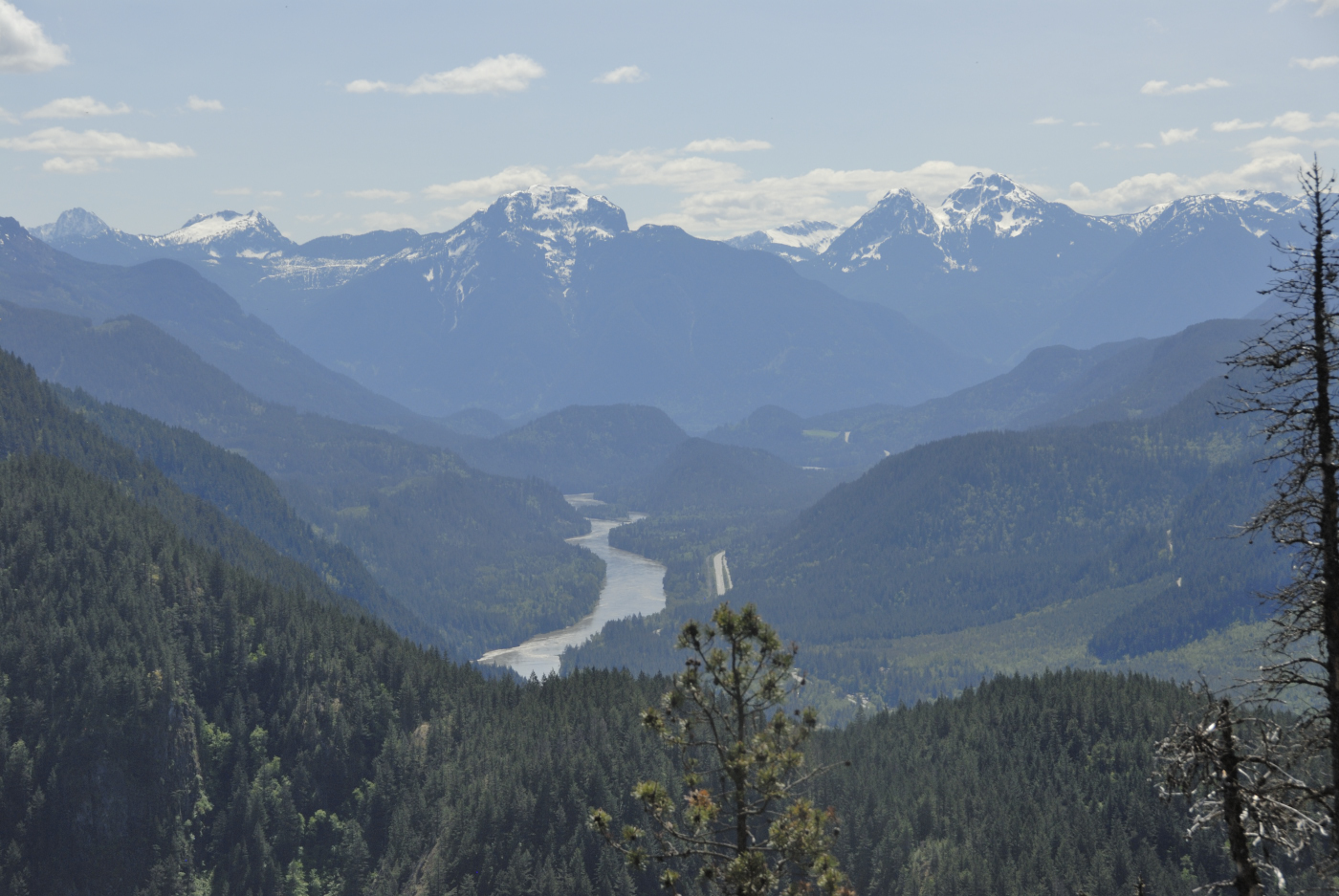Meanwhile I assembled my 2m yagi and latched it to a tree behind Ralph. I then plugged the 2m amplifier I borrowed from Ralph into his lithium battery and I started calling. I kept that up for over a half hour but got no response. I tried a few frequencies and the only response I got was the automated one from the Hope repeater. Well, I guess I wasn’t making a contact, fortunately Ralph did and so the summit was activated again this year. I then grabbed my camera and gathered a few photos from the summit. The Fraser Canyon is very narrow here but affords a few lovely sights even if they are limited in direction.