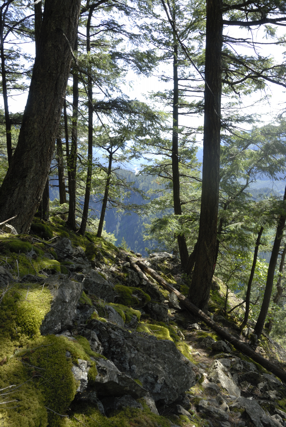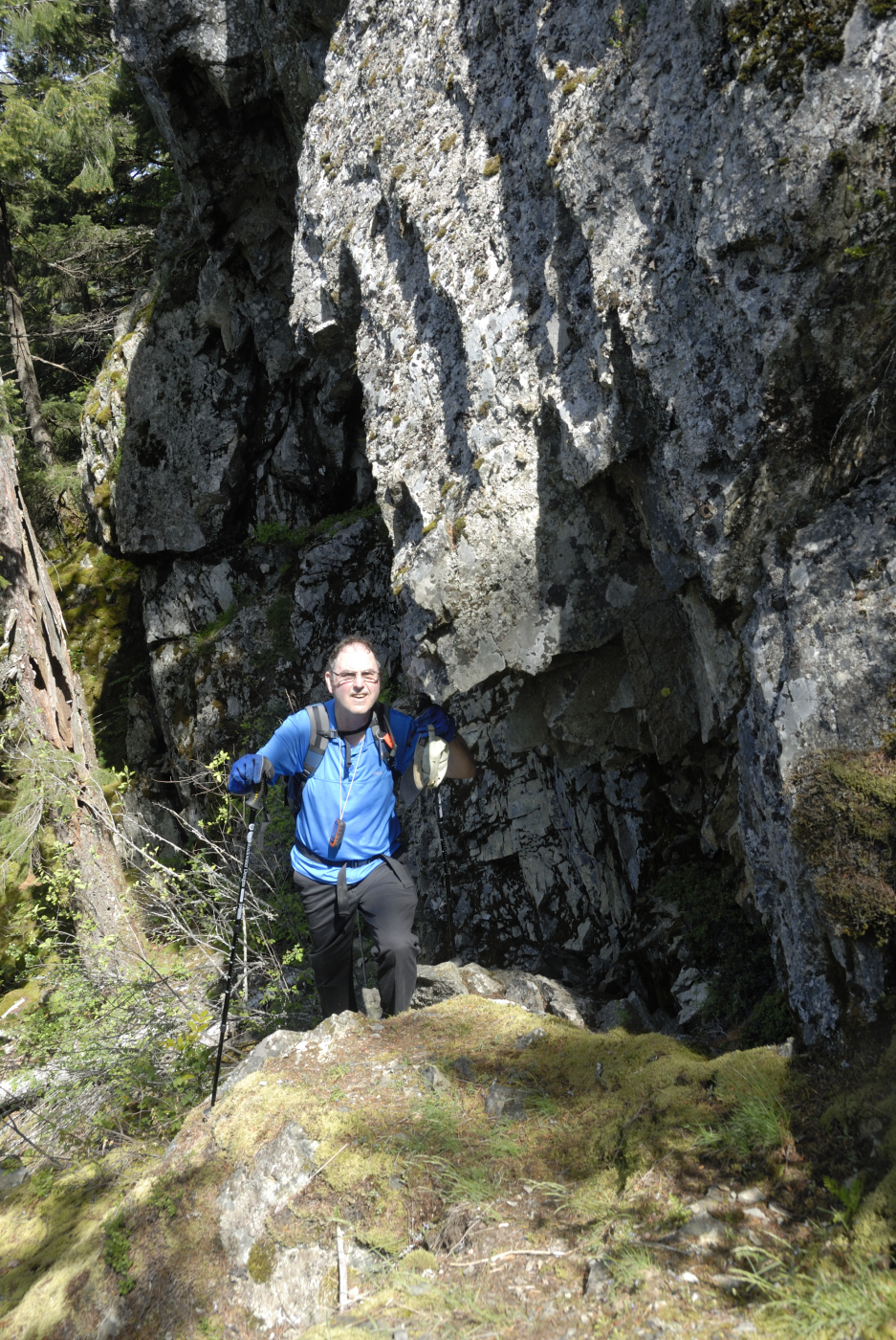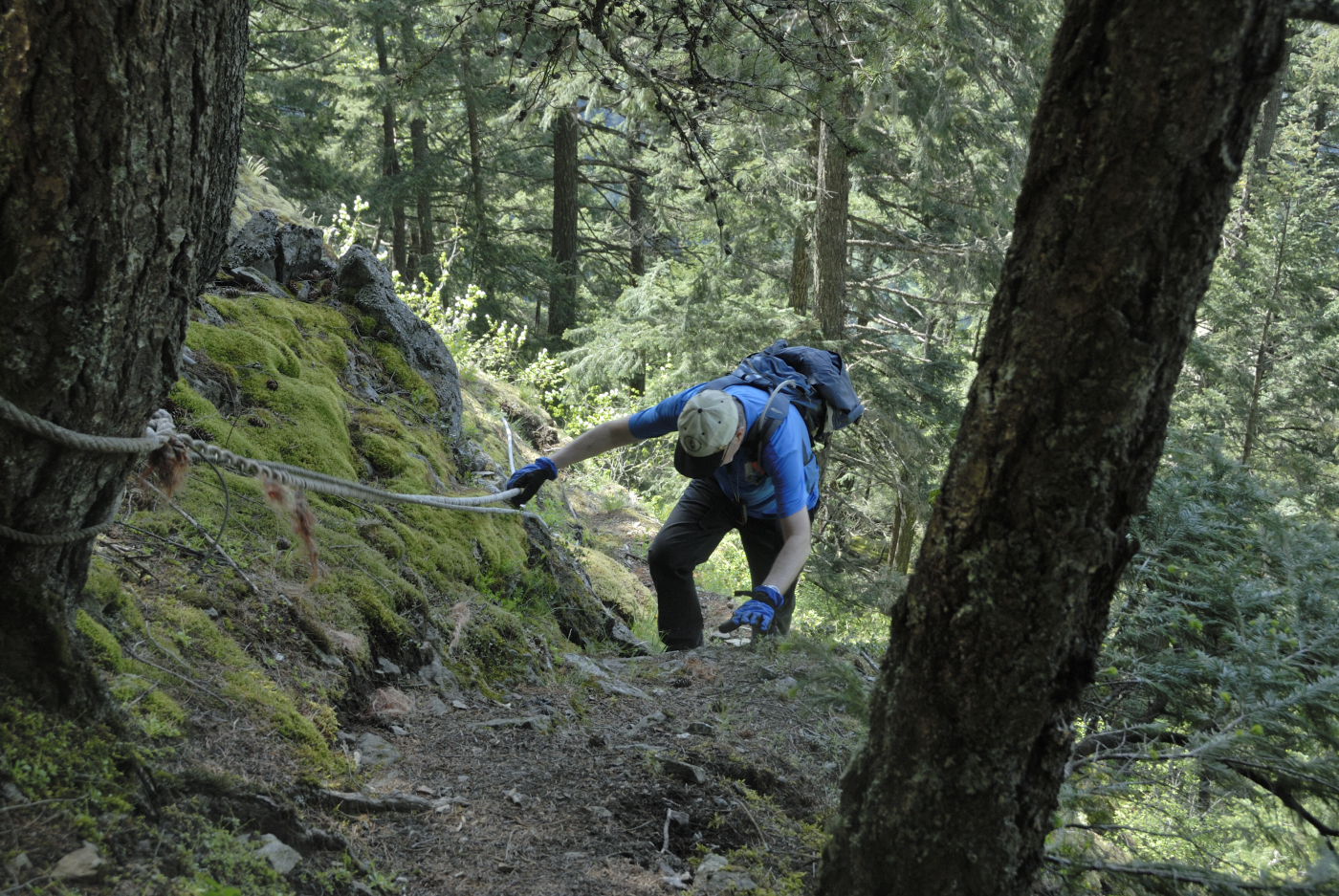 Soon we reached the first very steep section where a long rope has been placed. It works well and is quite needed as the rock is slippery even when dry. Once over this section the trail meanders through trees and mosses for a while and then a second rope section is reached where the challenge is repeated. Not too much further a third rope segment is encountered. This one is quite different however. Here the ropes help you hang on to the rock face as you make your way across it. Going up isn’t too bad but I find this section to be quite challenging on the way down.