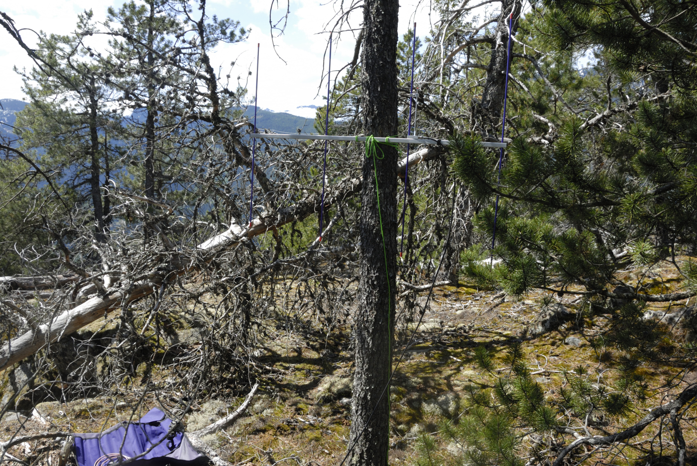 Once across the rock the rest of the trail passes quickly as one reaches the broad summit area marked by a cairn hiding a small geocache. Now that we had arrived on the summit Ralph and I stopped and ate our lunch it being 12:20 with almost two and a half hours of strenuous hiking behind us. My beef sandwich never tasted better, and the fruit salad delicious. Once rested we scouted for a tree to support Ralph’s vertical antenna. I found a spot that would also offer some shade and there Ralph tossed a line over a tree. He missed the intended one but snagged the one next to it which was actually a bit higher and so we decided to use that tree for the support. I helped haul up the line and soon we had the antenna deployed and Ralph put out his first call. He very quickly got a station in Alaska. Over the next hour he managed to complete calls with 4 more stations.