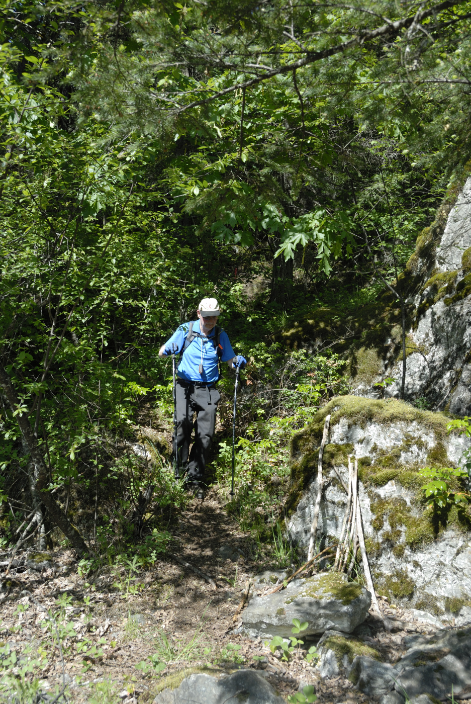 Once done with pictures and Ralph’s attempts, we packed up the gear and said our goodbyes to the summit. The trail down though less tiring, is actually harder as one has to pick their steps more carefully than on the way up. This was particularly true as we neared the end section of the trail where a steep switchback had loose sides and here Ralph’s pole slipped sending him cartwheeling through the air. I was a bit ahead of him and heard a cry, when I turned around I saw Ralph midair doing a summersault before he splatted on the slope below where he should not have been. He was fortunately not seriously hurt, only a scraped knee and elbow. It was also fortunate that he came to a stop after only one flip as the slope kept going and I joked that he was trying to make a quick descent to the river below us for a swim in the hot sun. After resting where he landed and me looking over the situation, he picked himself up and continued on his way as if nothing ever happened. Now last time on this trail Ralph twisted his ankle just a few meters from the trail-end, so this time he did better, even if it could have been far worse.