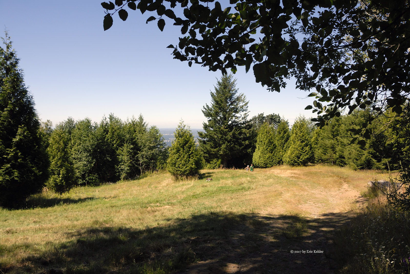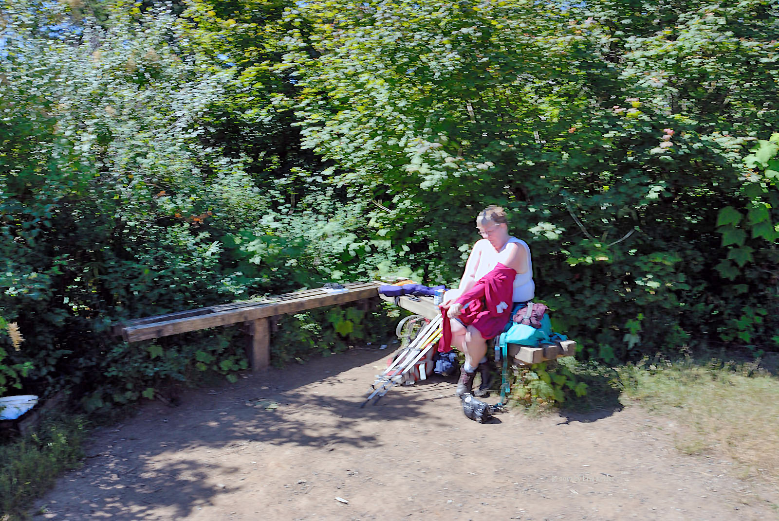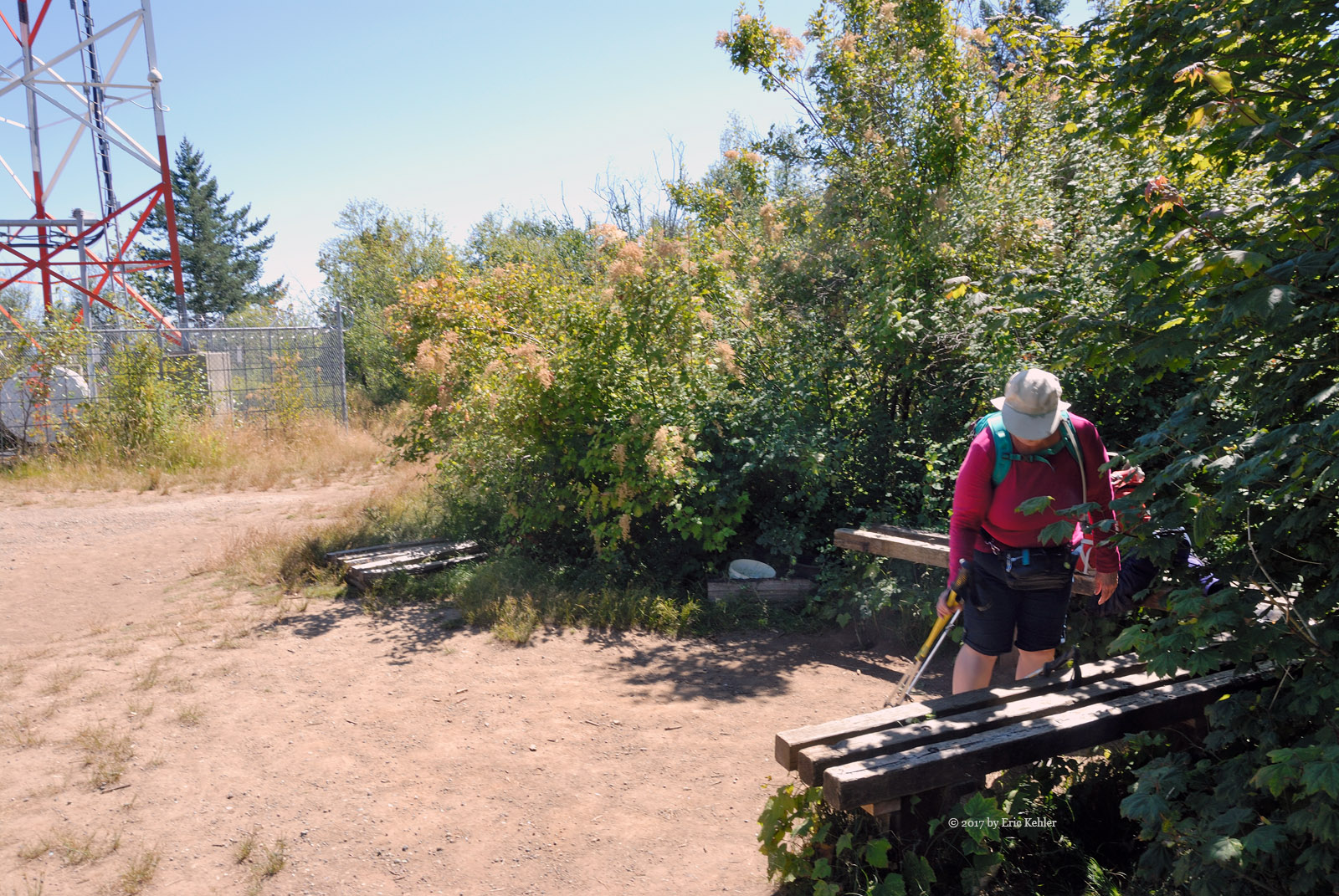 The walk along the old road was fairly easy to navigate being in good shape for hiking. It was well used and we encountered many other hikers on the trail. The road wasn’t all that steep for the most part but there were a few short sections that required a bit of effort. Now the one challenge with this route is the many crisscrossing trails used by the swarms of bikers using the slopes. We encountered quite a few as we traversed the route. Some were sailing along at ease, others were really slogging it out to reach the top! Getting past the bikers and the funny named side trails, one was able to enjoy one of the benefits of this hike - it is in the trees for most of the distance. So the travel was not overly hot. As we neared the summit the road crossed an open alpine meadow where we enjoyed some views of the valley. Continuing past the open area the trail again was engulfed in trees but very soon reached the summit and a cell tower. Here there was a nice bench where one could sit and setup my radio gear.