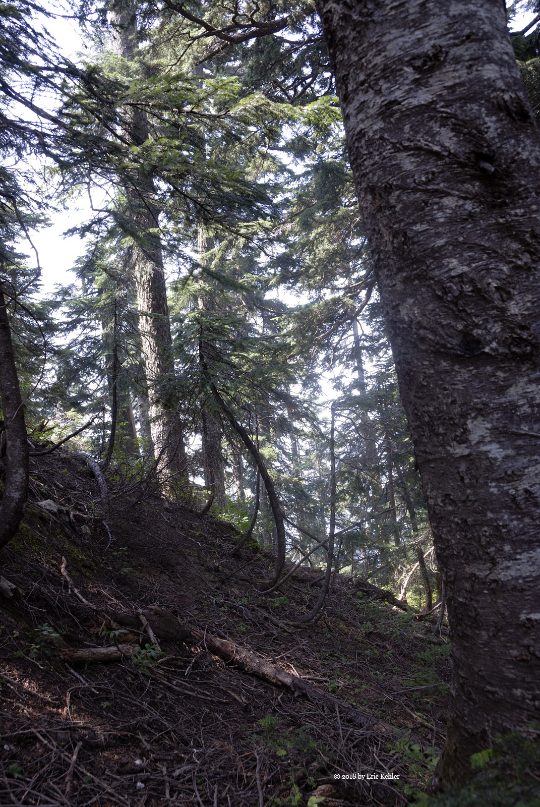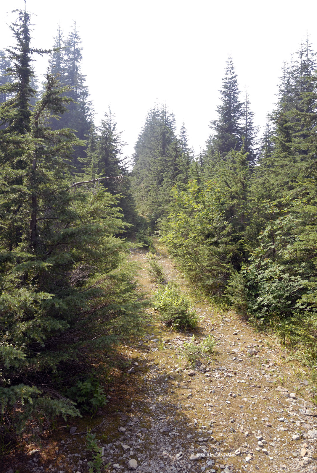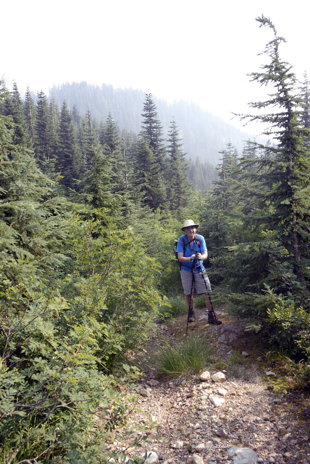 A short way along the road it opened up and the area would have been a good spot to park. Well I wasn’t sure what to expect so I guess parking where I did added about 500m to the hike. But the walk along the road went quickly and was quite easy. When we arrived at start of my track we were standing at the top of a drop, so we continued along the road another 100m as it descended a bit, then we cut across a small meadow for the forested ridge that we would be following. So far it was going quite well. The first bit of the route was through mature trees with little undergrowth but even here the dead branches were a bit of a nuisance. Then we broke out of the trees into more open areas with thick clumps of black huckleberry which we had to push through. It was slow going as we made our way up the ridge alternating between the trees and the clumps. The smoke in the air didn’t help either.