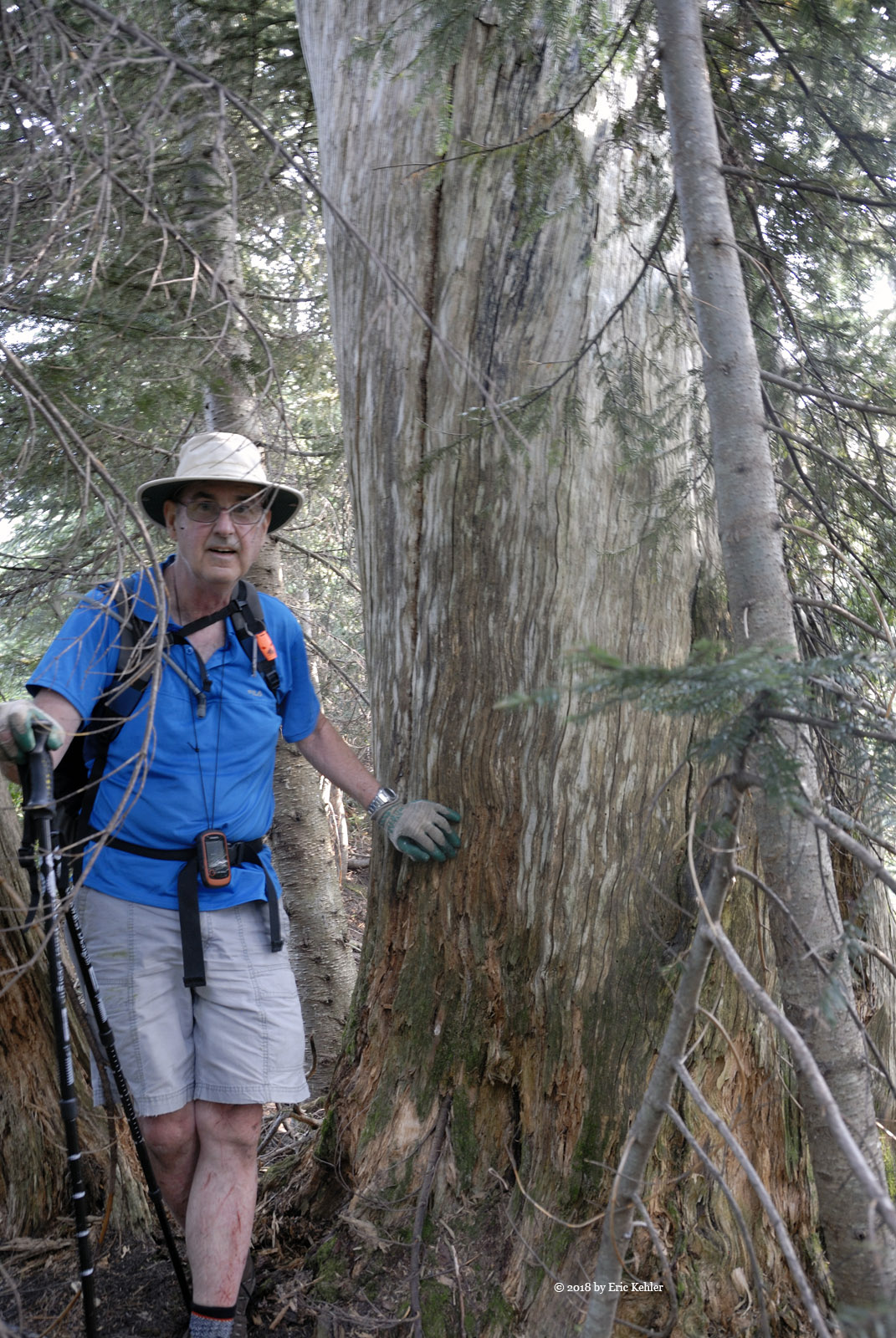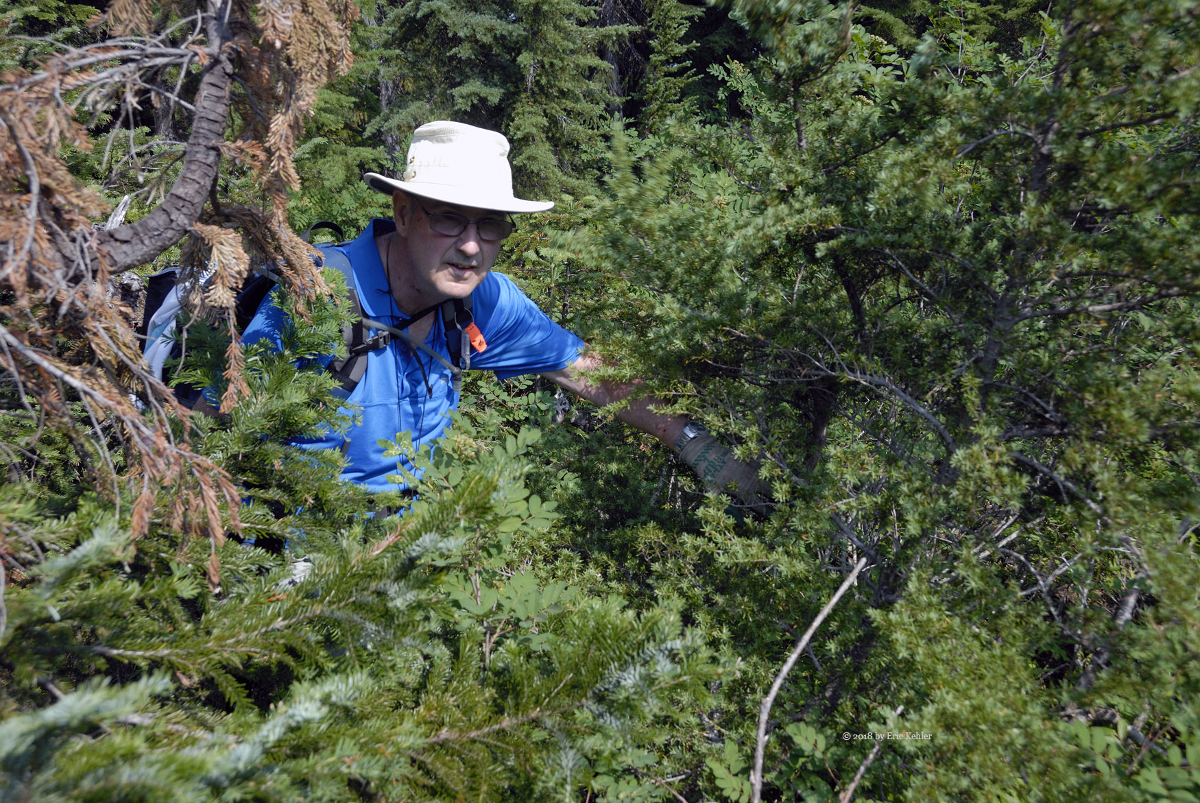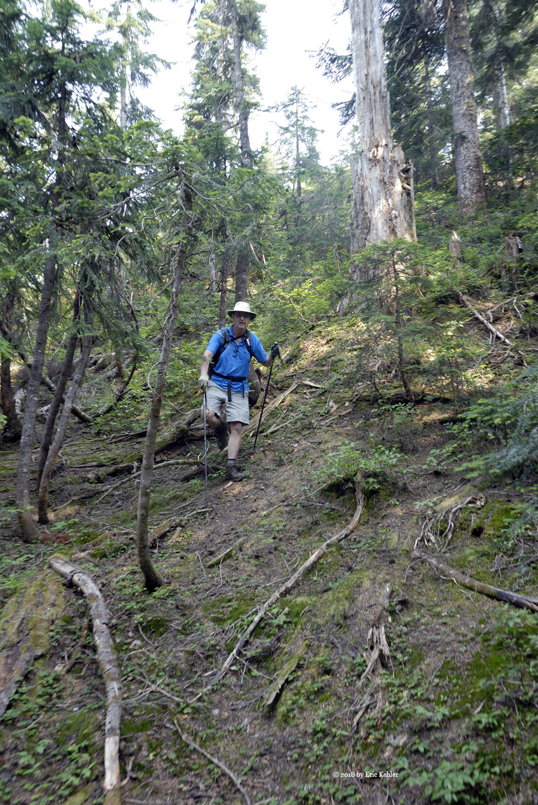 A short way along the road it opened up and the area would have been a good spot to park. Well I wasn’t sure what to expect so I guess parking where I did added about 500m to the hike. But the walk along the road went quickly and was quite easy. When we arrived at start of my track we were standing at the top of a drop, so we continued along the road another 100m as it descended a bit, then we cut across a small meadow for the forested ridge that we would be following. So far it was going quite well. The first bit of the route was through mature trees with little undergrowth but even here the dead branches were a bit of a nuisance. Then we broke out of the trees into more open areas with thick clumps of black huckleberry which we had to push through. It was slow going as we made our way up the ridge alternating between the trees and the clumps. The smoke in the air didn’t help either.