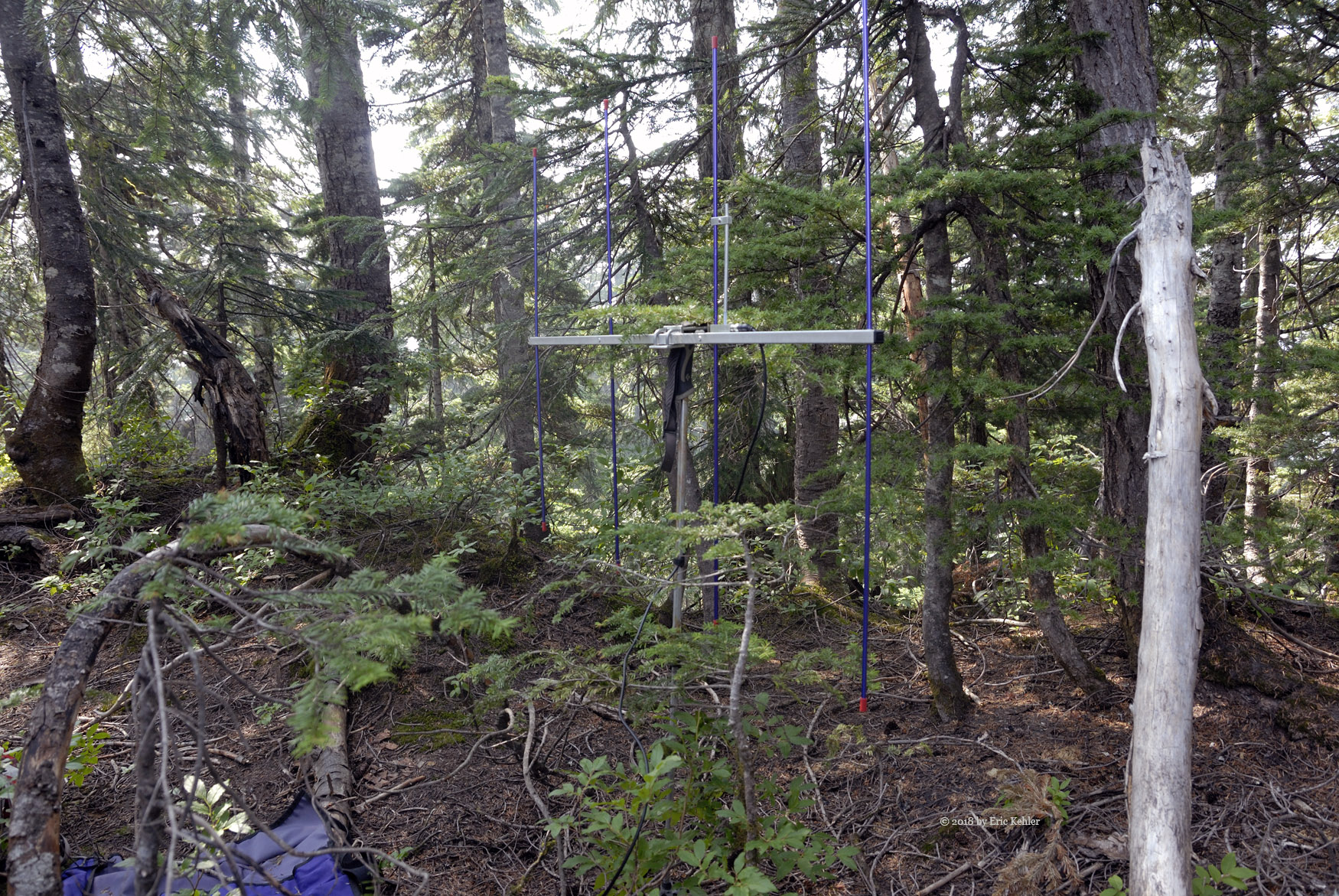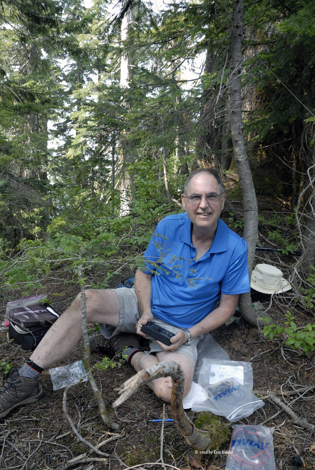 So as we continued upwards, time was ticking by quickly and our progress seemed interminably slow. As we got closer to the summit area the trees thickened and we were able to spend more time squeezing between them instead of fighting the shrubs so things were looking up. However, looking a bit further on the steepness of the ridge increased dramatically. Now we were fighting the slope instead. We took a good breather and then started up the next section of the steep slope, it ended on the top ridge. We eventually arrived at the top of the ridge but it was somewhat west of the marked summit. The area was within the SOTA activation zone but it seemed to be about 100m west of the map’s location. I scouted out the area but in the direction of the marked summit the ground dropped quite some distance. I continued to walk the area and look over to the marked summit but I didn’t see much of a rise beyond the dip. It looked like the location was off a bit, even if there was another rise it would only be a meter or two higher. So we decided to stay where we were and eat some lunch. Once we had rested I set up my yagi and Ralph got his HF antenna strung into the trees. Then we were both busy putting out calls. I managed to get 5 in the log including one summit to summit with a chap on Moose Bench in the Olympic Peninsula, around 195km distant. Ralph logged 6 CW (Morse code) contacts.