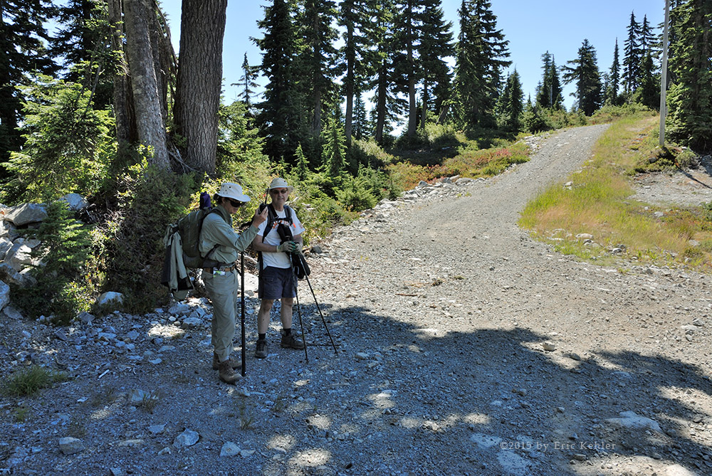 Saturday Morning came and my fellow club members Ralph and Brett arrived at my door ready to take on the task of activating the summit of Mt. Strachan. The day was clear and sunny which of course meant it would be a hot day on the slope. Sure enough the hike was a hot one made worse by the lack of shade along the road which served as our trail. Even the summit had very little shade due to the stunted trees that were growing there. So we were in the blazing sun for most of the day.