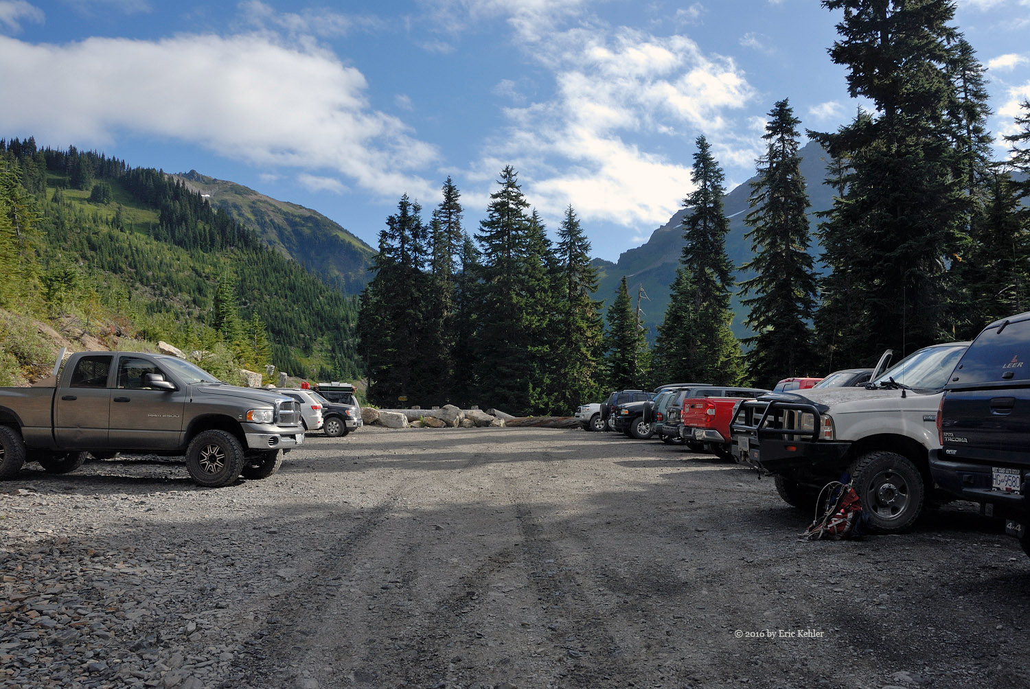 Our drive to the start of the Chipmunk FSR went smoothly and we made good time in the light traffic though I did comment that it seemed heavier than I thought it would be at this hour. Once on the FSR we made good speed along the section of road that parallels the Chilliwack River but when we turned off it to the longer section running up Chipmunk Creek the road was in a very rough state. The potholes were numerous and deep and the cross-ditches were deep, wide and rough! It was slow driving and extremely jarring. I really was amazed that so many drive this road and even some cars! They must leave a few pieces behind as they make their way along.