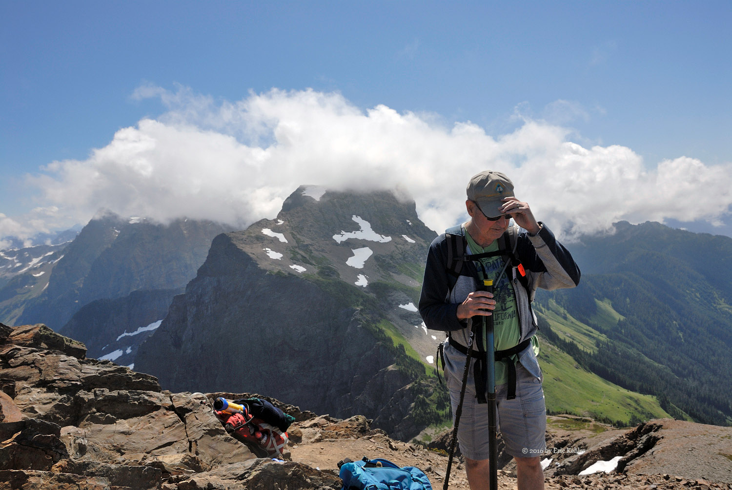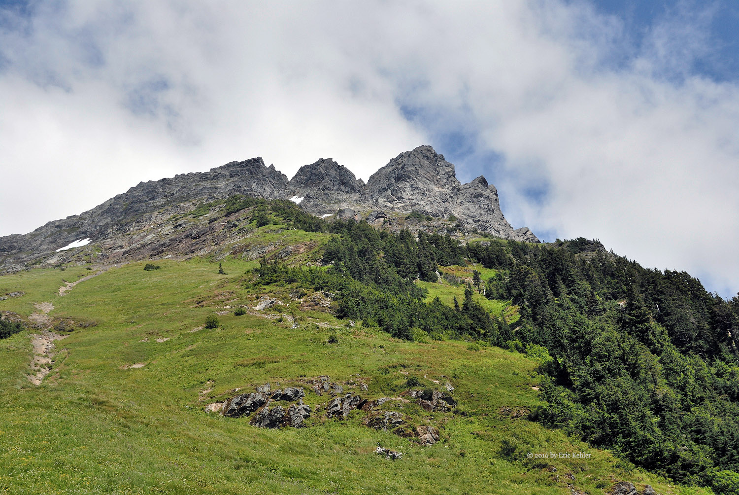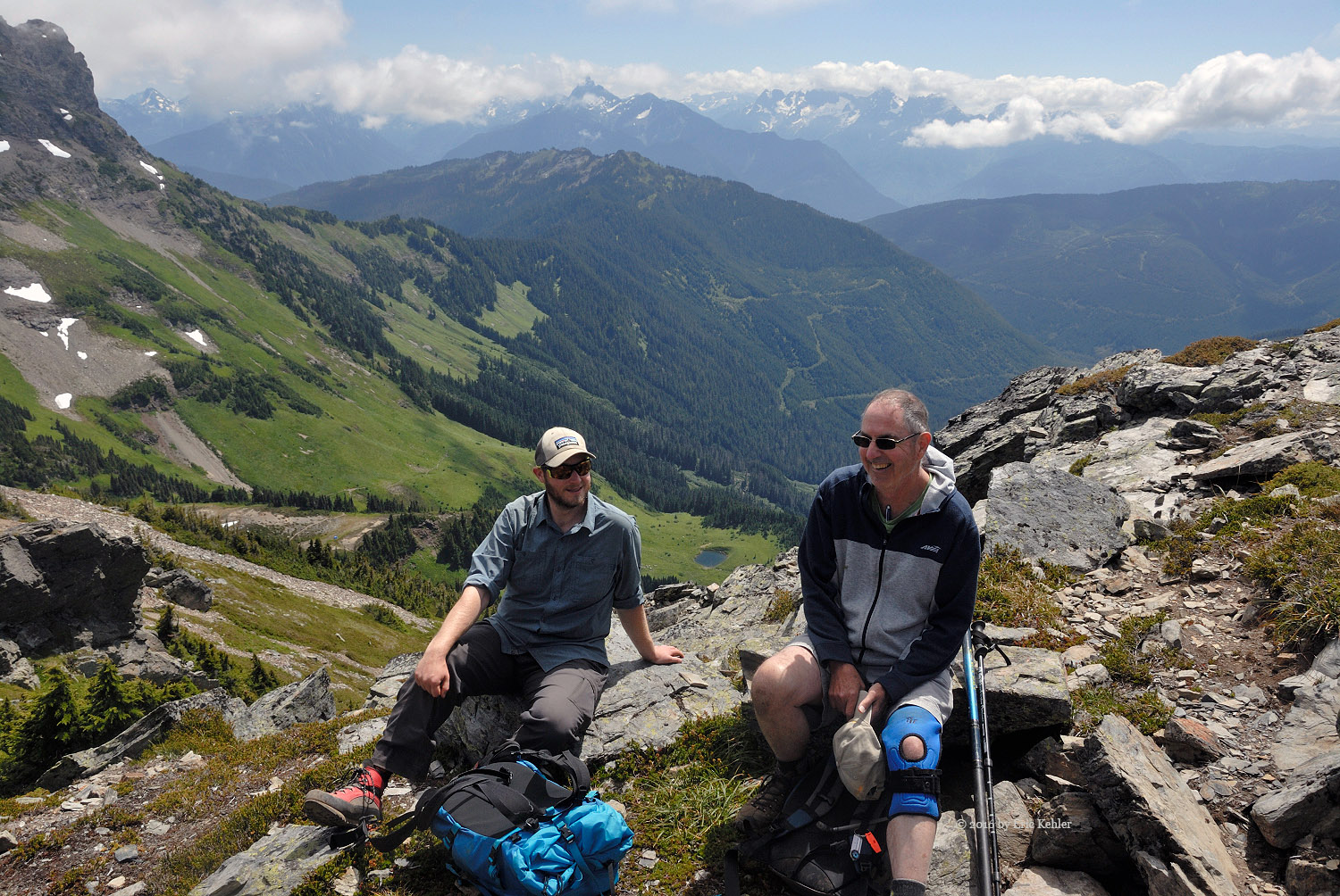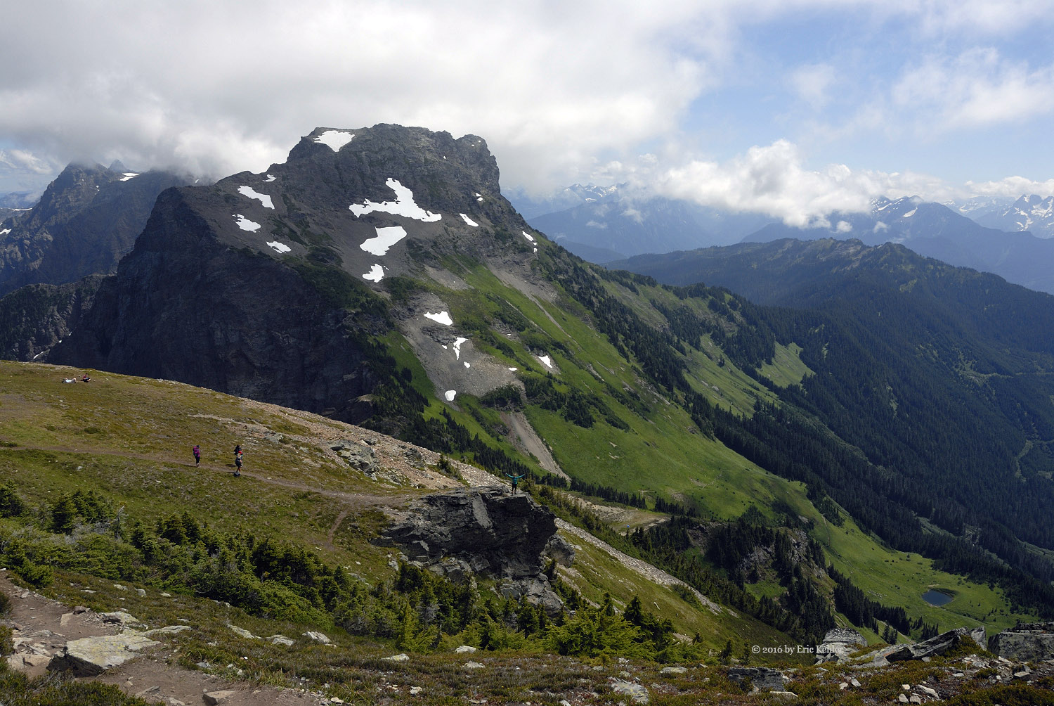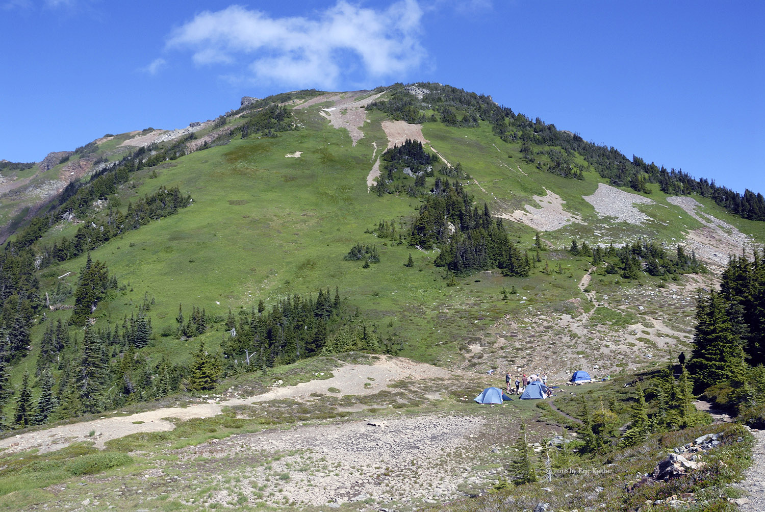 The trail then starts a steep climb to gain some elevation before turning right into a small treed section before emerging on a wide slope which had a narrow trail cut through an immense field of wild flowers. Today we mostly enjoyed white with a sprinkling of blue. We took a short rest before starting up the slope to the next level area at its top. A couple of hikers passed us but soon we had made it past some others that were taking it easy. We were actually making very good time and I was finding my energy level staying decent. The cooler temperature I’m sure had a lot to do with it. We reached the main col between Cheam and Lady to find a number of tents set up with the occupants stirring between them. The small pond that is normally here was dried up so the area was a nice spot for the tents.