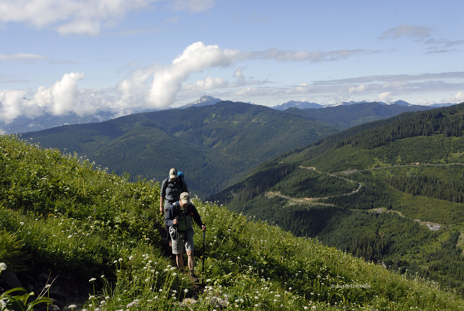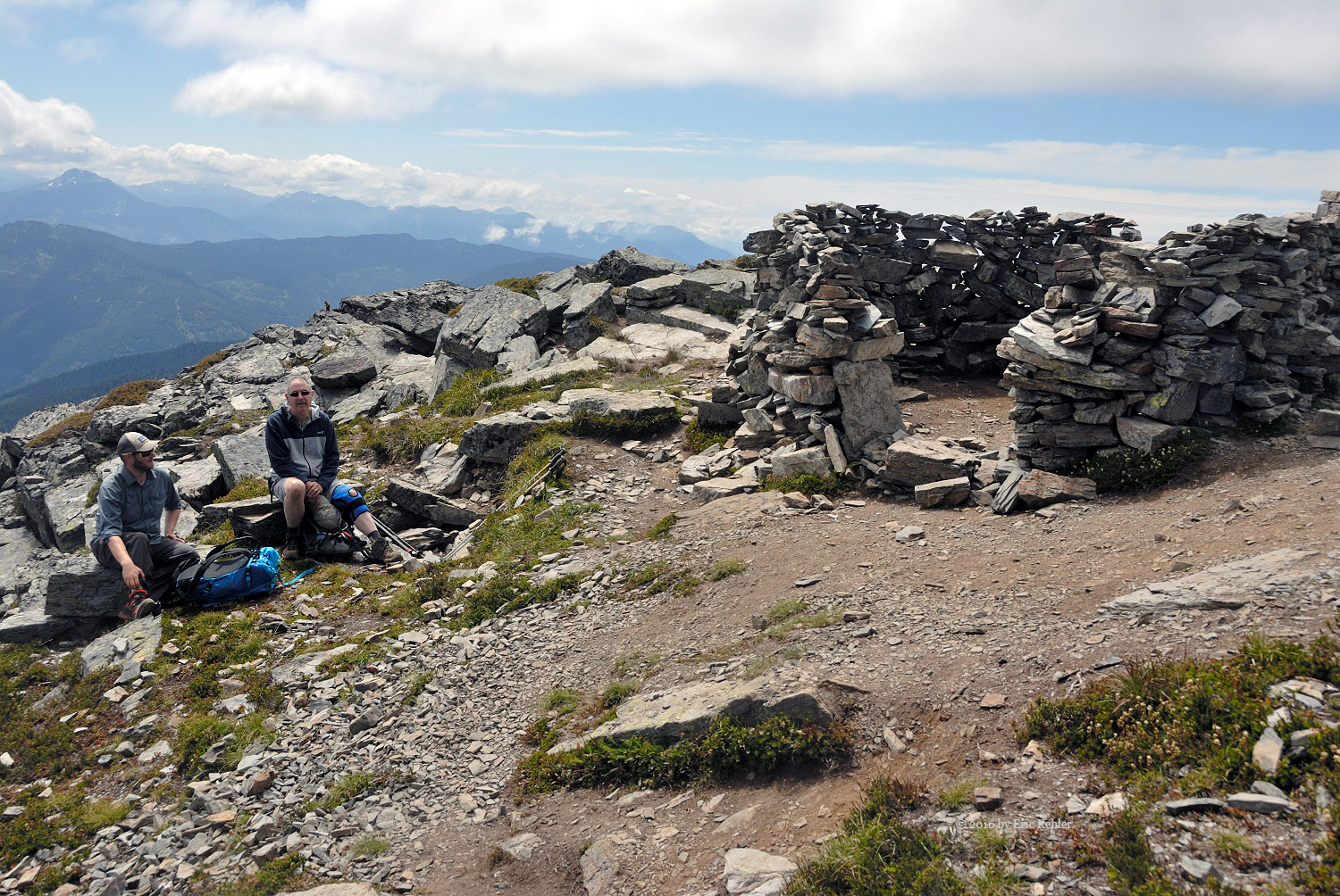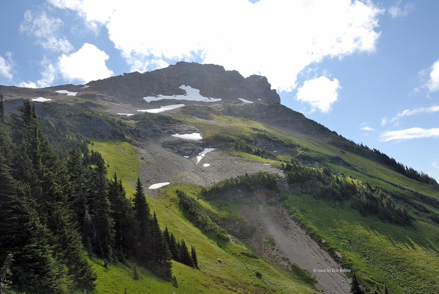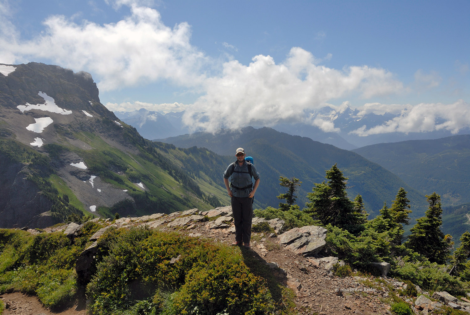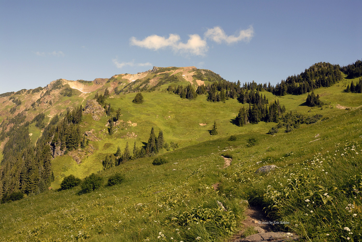 The trail then starts a steep climb to gain some elevation before turning right into a small treed section before emerging on a wide slope which had a narrow trail cut through an immense field of wild flowers. Today we mostly enjoyed white with a sprinkling of blue. We took a short rest before starting up the slope to the next level area at its top. A couple of hikers passed us but soon we had made it past some others that were taking it easy. We were actually making very good time and I was finding my energy level staying decent. The cooler temperature I’m sure had a lot to do with it. We reached the main col between Cheam and Lady to find a number of tents set up with the occupants stirring between them. The small pond that is normally here was dried up so the area was a nice spot for the tents.
