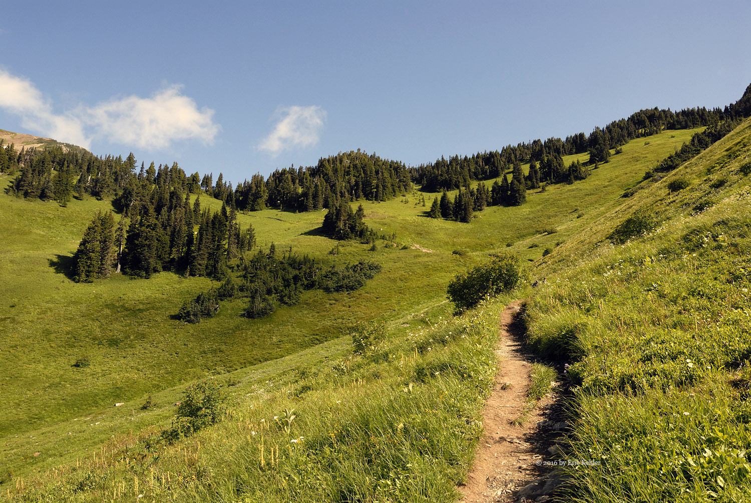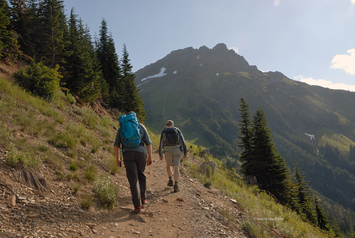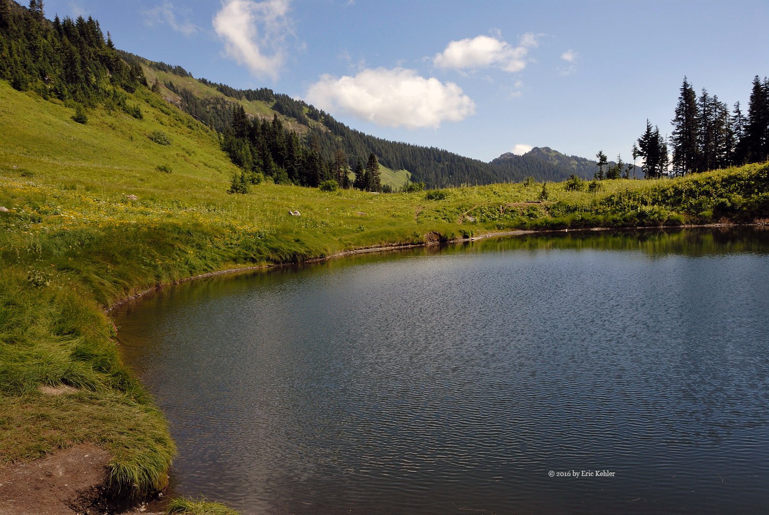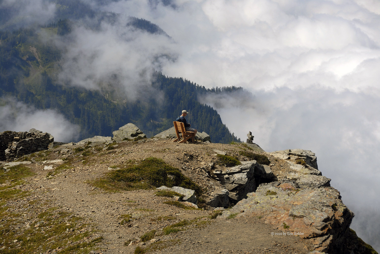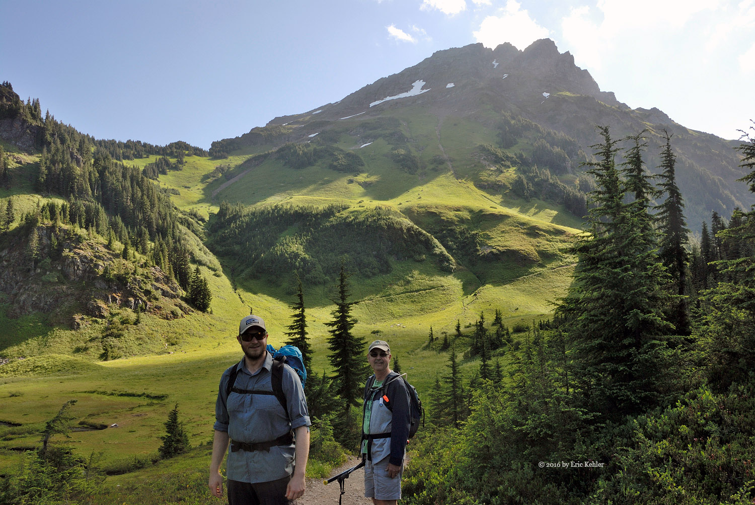 The trail then starts a steep climb to gain some elevation before turning right into a small treed section before emerging on a wide slope which had a narrow trail cut through an immense field of wild flowers. Today we mostly enjoyed white with a sprinkling of blue. We took a short rest before starting up the slope to the next level area at its top. A couple of hikers passed us but soon we had made it past some others that were taking it easy. We were actually making very good time and I was finding my energy level staying decent. The cooler temperature I’m sure had a lot to do with it. We reached the main col between Cheam and Lady to find a number of tents set up with the occupants stirring between them. The small pond that is normally here was dried up so the area was a nice spot for the tents.