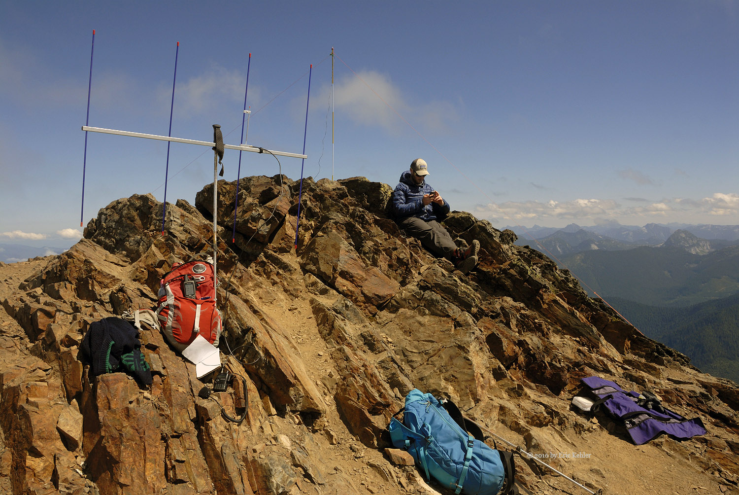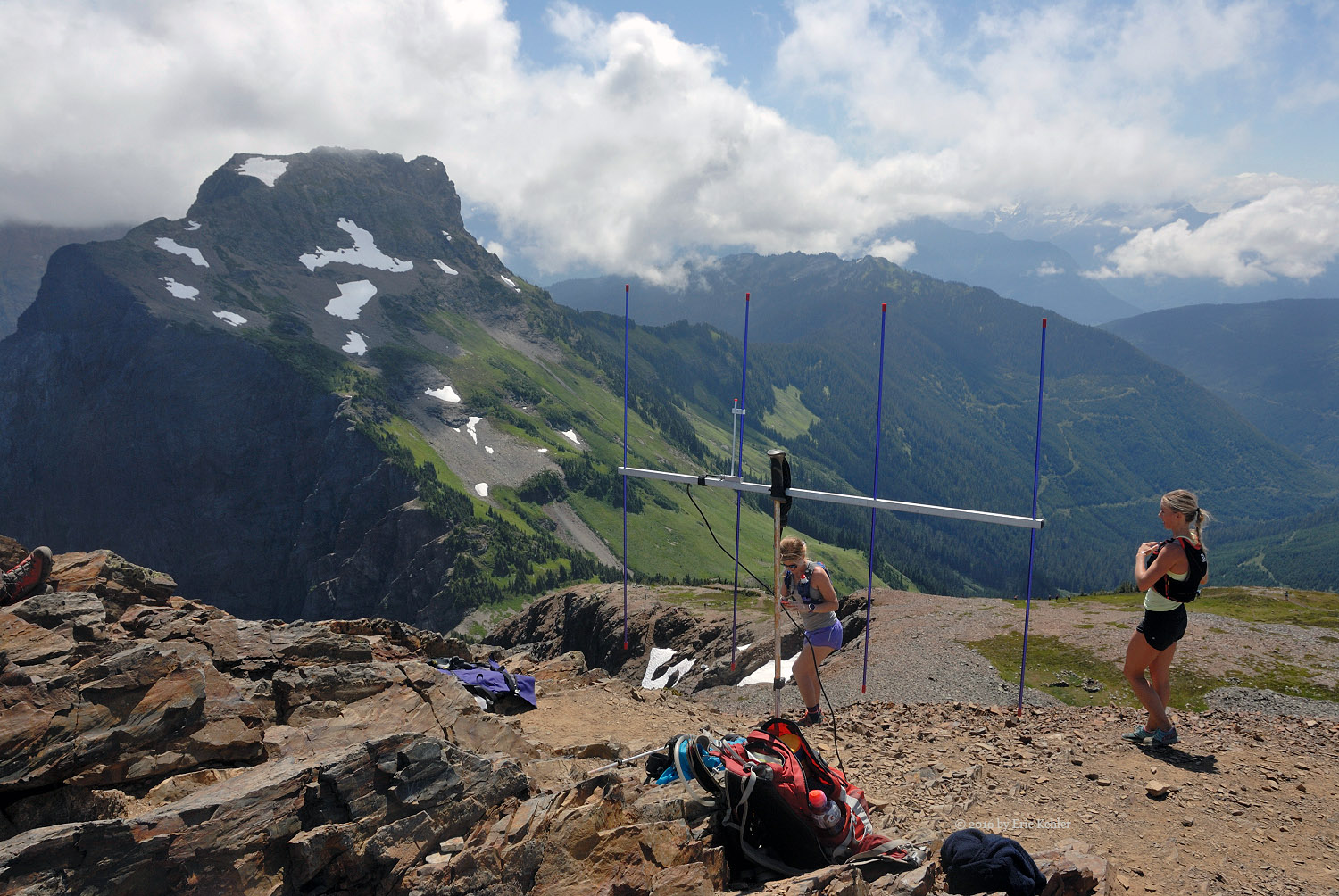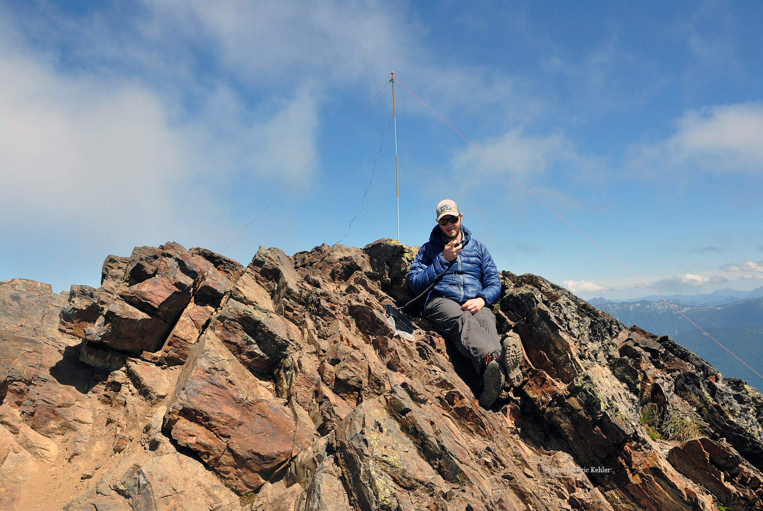 After a short rest we continued up the steep set of switchbacks as the trail made the final push for the summit. We found one spot about three quarters of the way up which was a lovely resting area and so we took some time to regain our strength before pushing the final stretch for the summit. As we got close to the top ridge I noticed that the trail had shifted away from a scramble over loose shale next to a steep drop to a more leisurely incline far back from the edge and which led to a lower section of the top ridge line of Cheam. We took the new route and soon reached the ridge and a lovely view of the Fraser Valley below – at least that which we could see through the clouds which were far below us. A brief rest and then we made a push for the summit not that much farther along. It was just before noon so our hike took a bit more than 2.5 hours, good time for us. Once John and I reached the summit we stopped to eat a few bites and wait for Ralph to finish the final section. Ralph immediately put out a call on the repeater and had club member Ken respond then he switched to simplex and Ralph had the first contact in the log. John started setting up his 20m inverted V antenna and I my 2m yagi. Ralph decided to setup a bit down the ridge to where there was some rocks he could use to support his mast. John quite successfully lashed his short pole to a boulder and had his antenna on the air in no time. He made three more contacts before the stations ran out. I was able to rustle up 10 on 2m, one on Bowen Island another on Camano Island down in the states. We had a lot of interest from the other hikers as they watched us make some contacts and chat with stations some distance away. John’s Kansas contact was particularly intriguing to them.