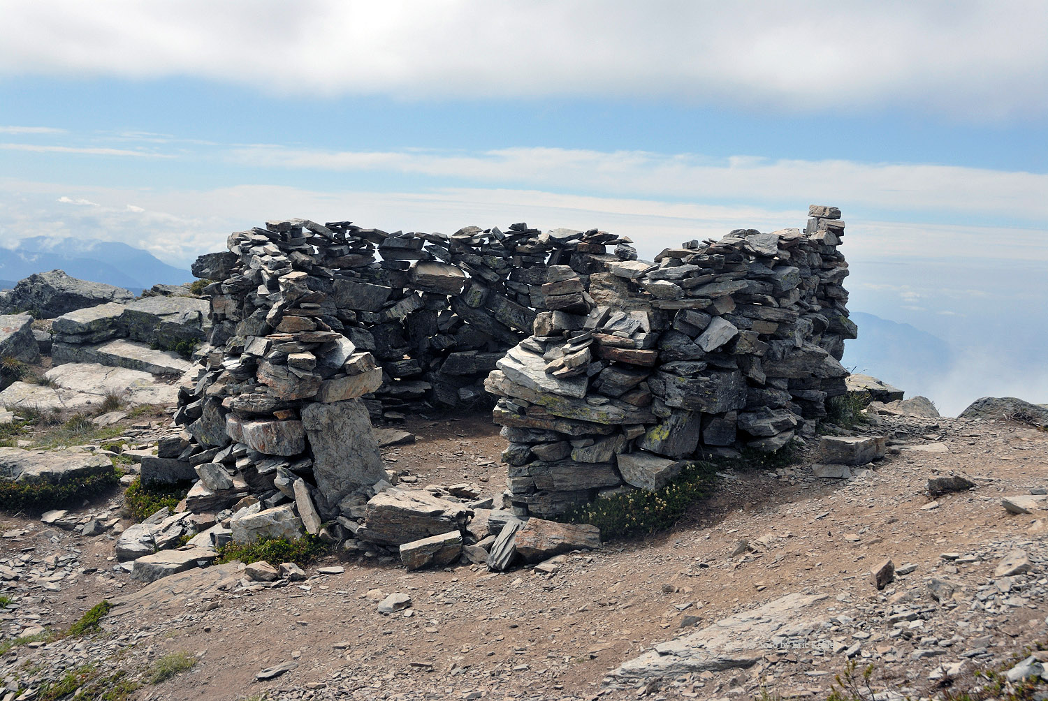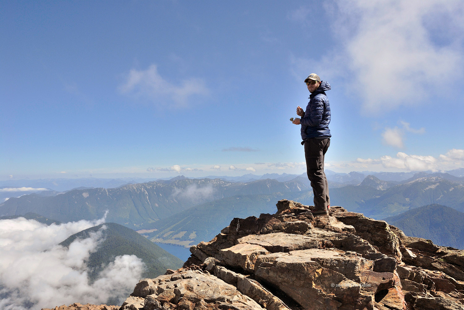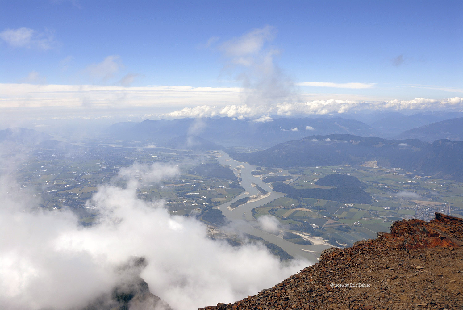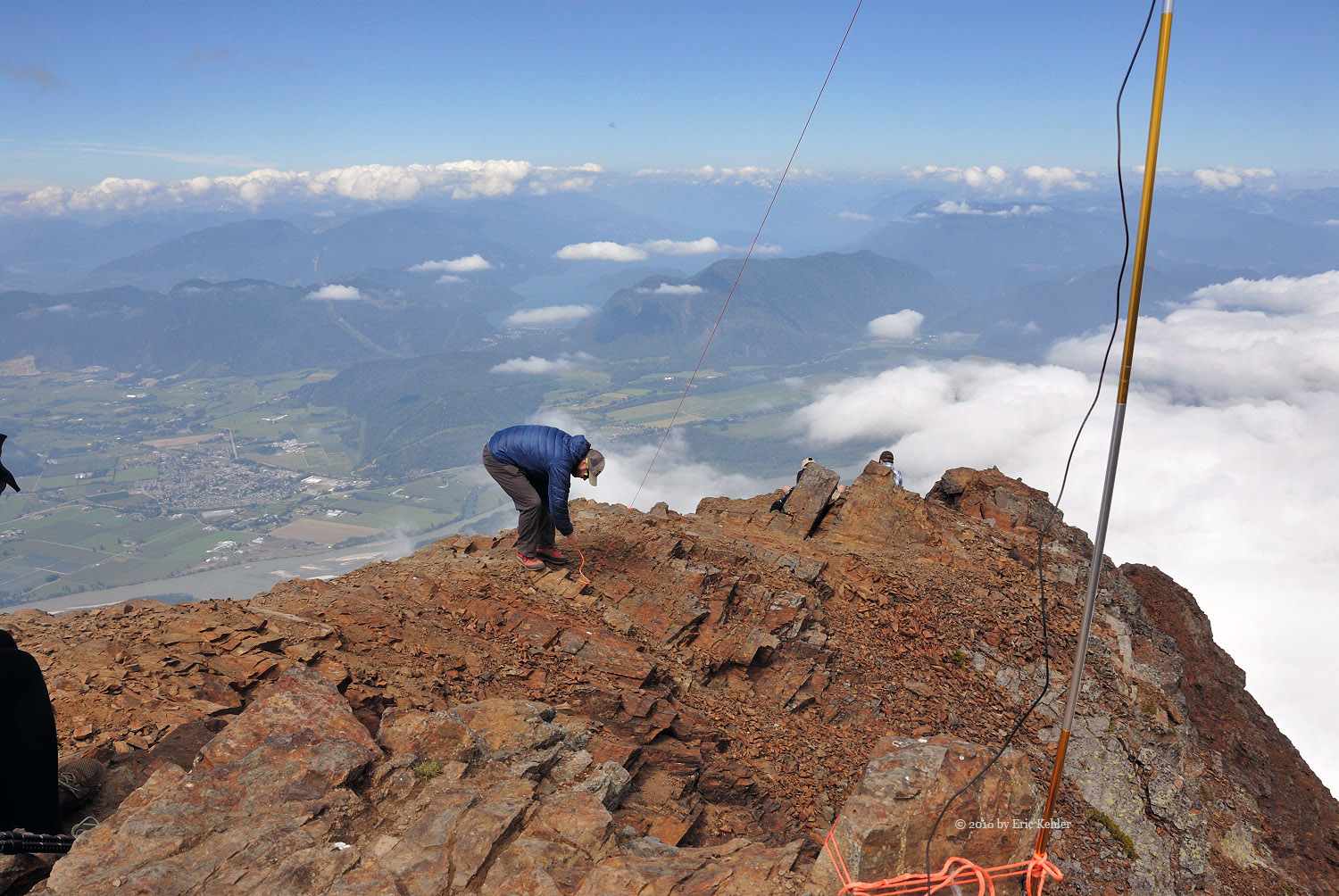 After a short rest we continued up the steep set of switchbacks as the trail made the final push for the summit. We found one spot about three quarters of the way up which was a lovely resting area and so we took some time to regain our strength before pushing the final stretch for the summit. As we got close to the top ridge I noticed that the trail had shifted away from a scramble over loose shale next to a steep drop to a more leisurely incline far back from the edge and which led to a lower section of the top ridge line of Cheam. We took the new route and soon reached the ridge and a lovely view of the Fraser Valley below – at least that which we could see through the clouds which were far below us. A brief rest and then we made a push for the summit not that much farther along. It was just before noon so our hike took a bit more than 2.5 hours, good time for us. Once John and I reached the summit we stopped to eat a few bites and wait for Ralph to finish the final section. Ralph immediately put out a call on the repeater and had club member Ken respond then he switched to simplex and Ralph had the first contact in the log. John started setting up his 20m inverted V antenna and I my 2m yagi. Ralph decided to setup a bit down the ridge to where there was some rocks he could use to support his mast. John quite successfully lashed his short pole to a boulder and had his antenna on the air in no time. He made three more contacts before the stations ran out. I was able to rustle up 10 on 2m, one on Bowen Island another on Camano Island down in the states. We had a lot of interest from the other hikers as they watched us make some contacts and chat with stations some distance away. John’s Kansas contact was particularly intriguing to them.
