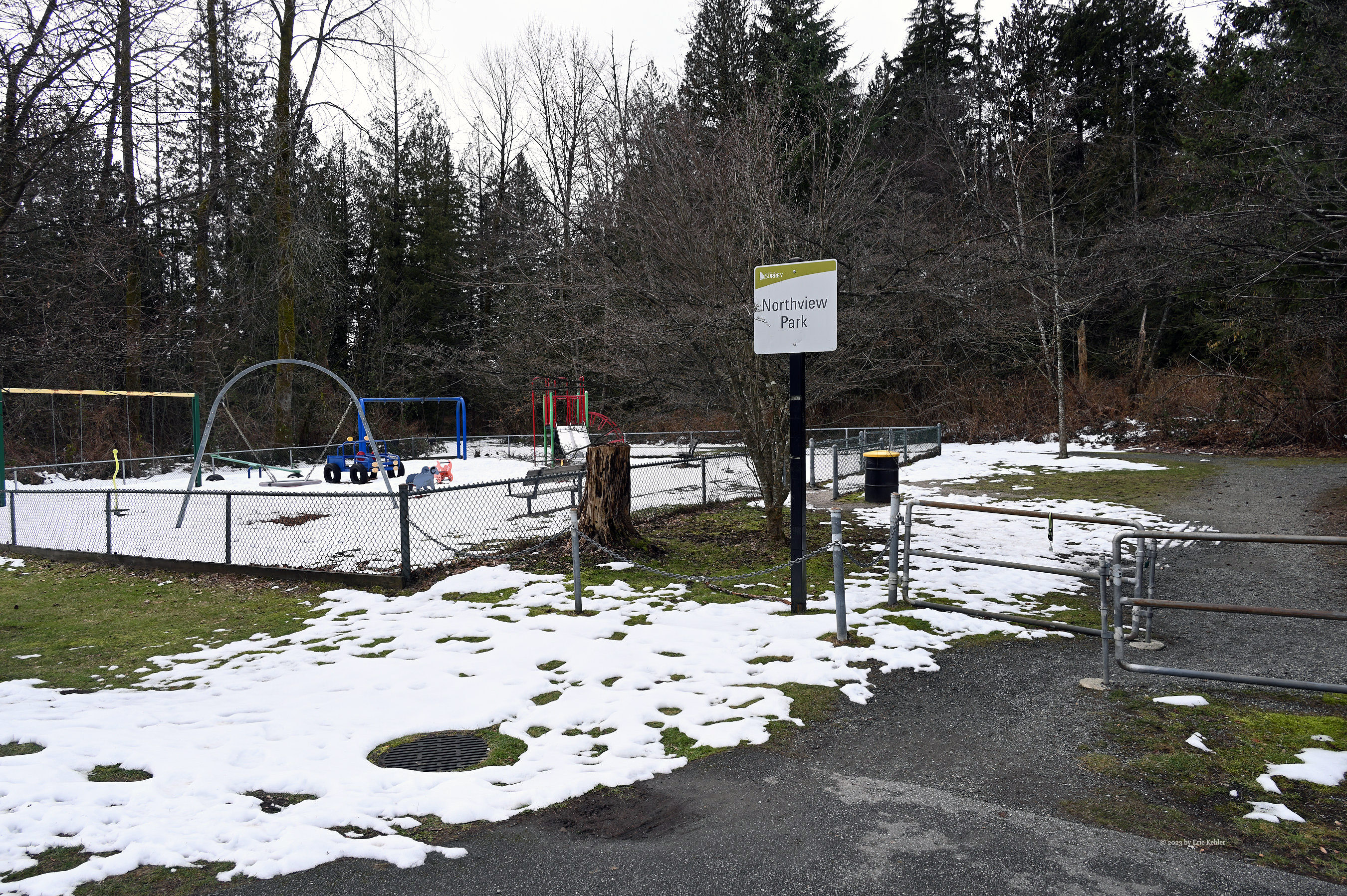 The day was proving to be a lovely warmish one with some sun periods and it would be ideal for getting out in the fresh air. I had hoped to do this park last Friday but the weather then looked questionable and I was worried about snow cover. When I arrived at the park on the Monday, there was still a lot of snow covering much of the open play area. Fortunately, next to the fenced play yard it was clear of snow and large enough for me to set up in. Likely it would have been covered last Friday. Before setting up I walked over the front part of the park grabbing a few photos and planning out my set up.