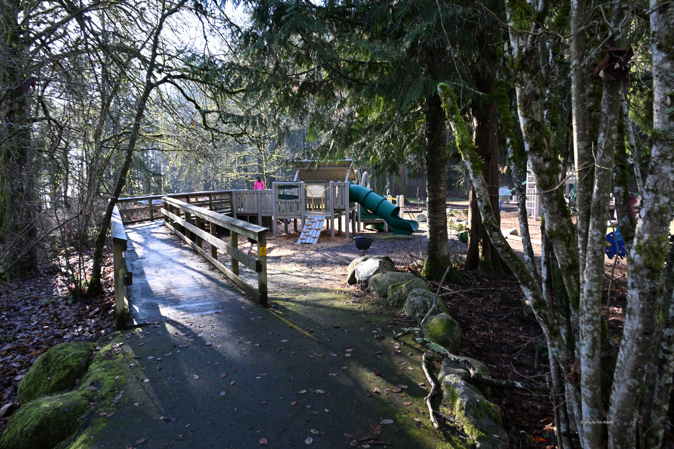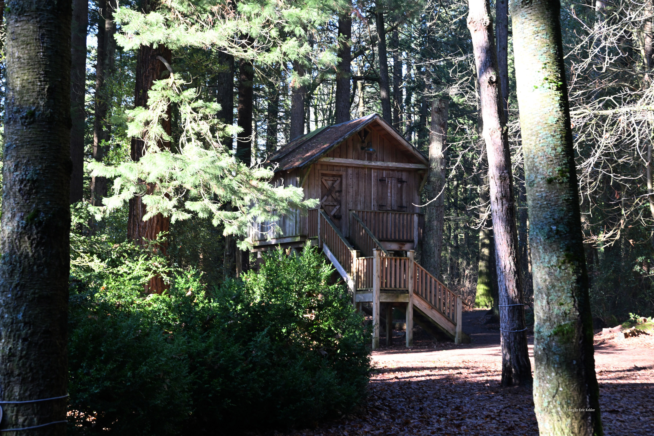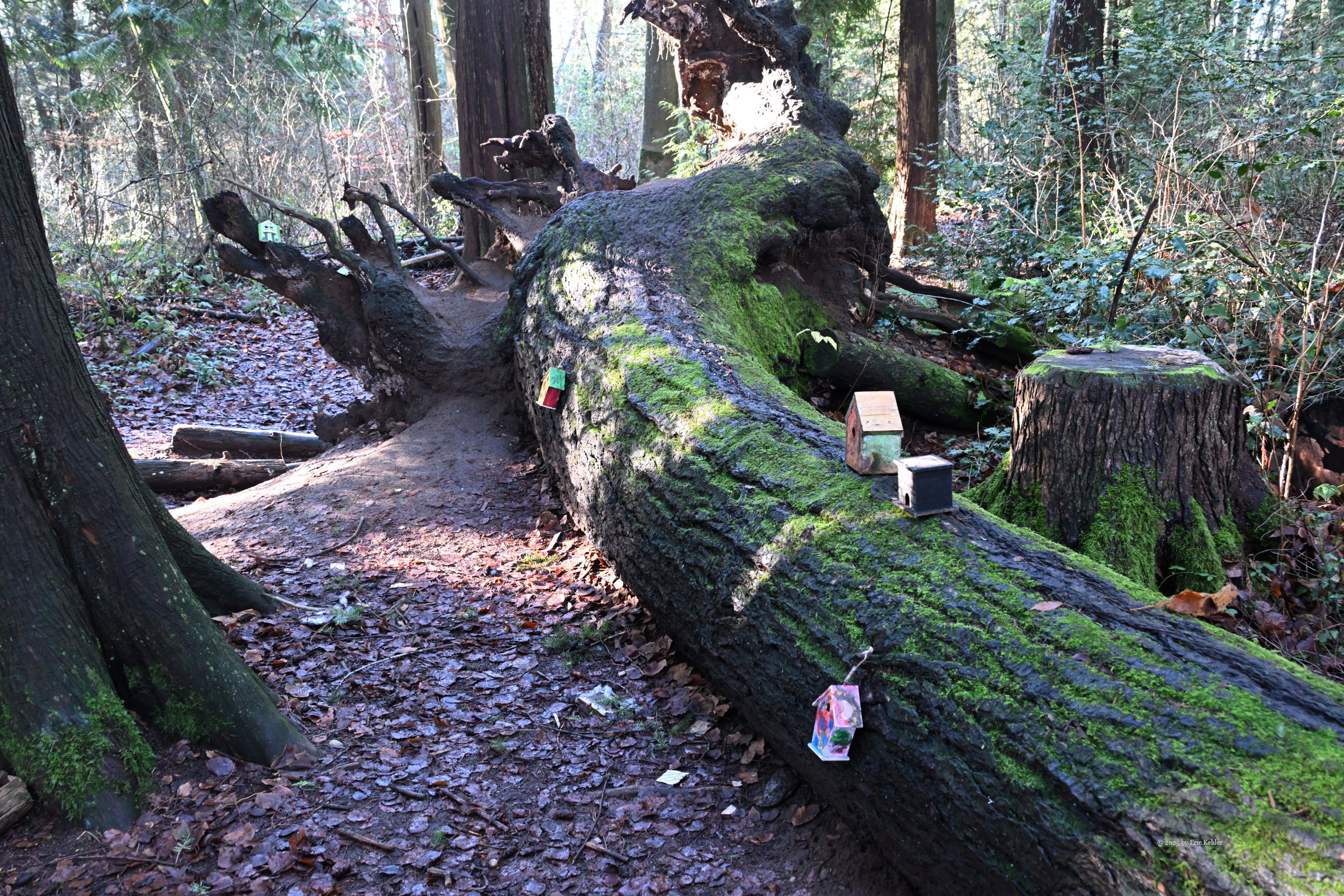 By now the sun had warmed the area enough that the early mists were gone and the air was not so bitter. It made for a nice invitation to take a walk through the park with my camera. I packed up my station and stowed it in my car and then set out to view other areas of the park. I wandered back past where I had operated continuing into the woods and stopped to take a few photos of the scenery. I tried a few different angles of the famous treehouse whose historical value was the reason the park is on the POTA list. The roof is rotting in one area and likely needs some attention before the interior gets wet. I then continued along the trail to the fairy village. Unfortunately, the fairies had gone south for the winter and there were only a couple of houses to be found. I thought that they might have gotten damaged in the windstorms but there were not enough broken pieces to account for them all. Rumours suggest that either the parks people clear them out periodically to make room for more or that well-wishers collect them for the winter and bring them back come spring. I do hope it is the latter as some of those homes were quite pretty and took a lot of work to make. Disappointed in not catching up with the fairies I continued my walk along the trails back to my car. I did pass by the upper tables and sure enough the ground was very soggy. Done with my operating and stroll through the park I returned to my car and set out on the short drive back home.