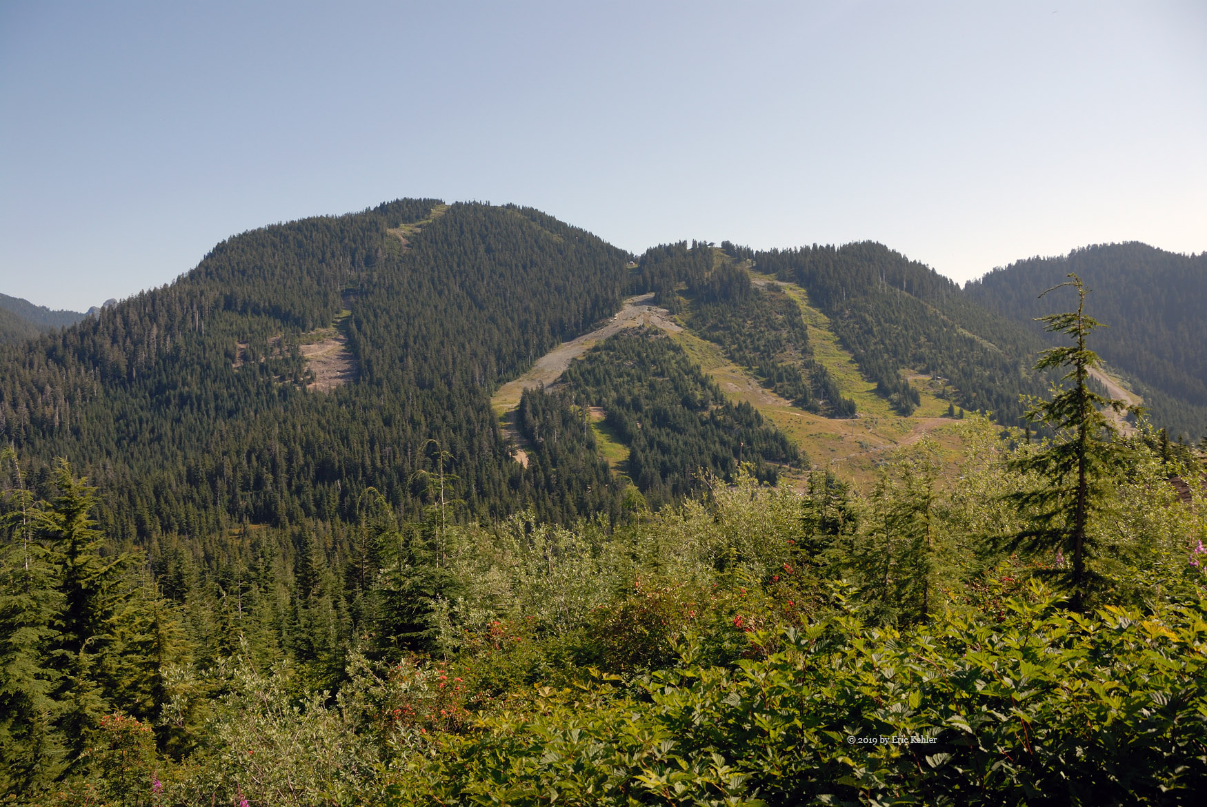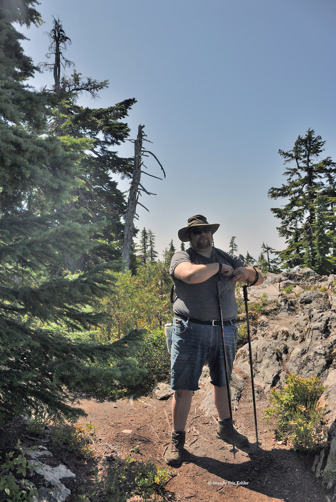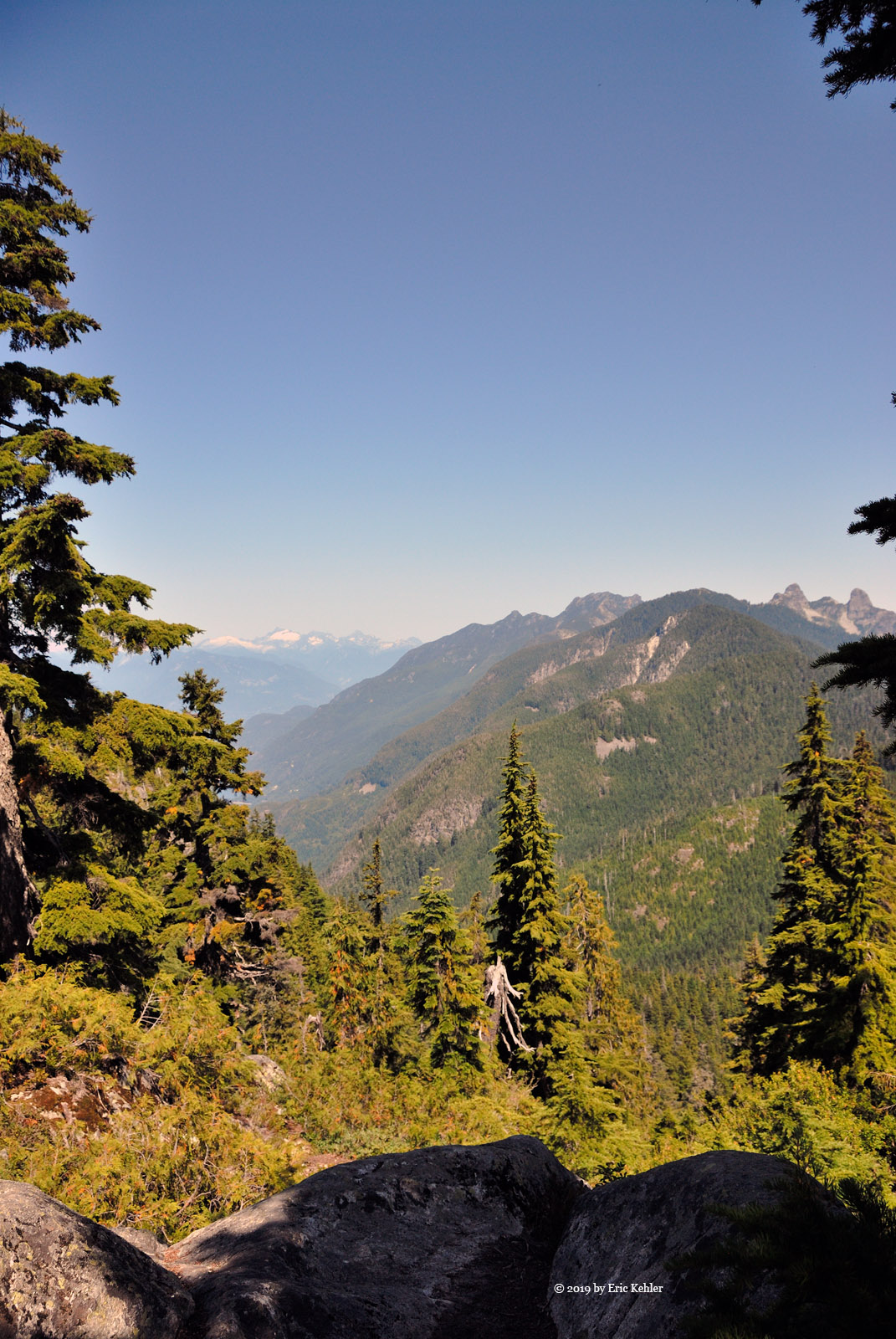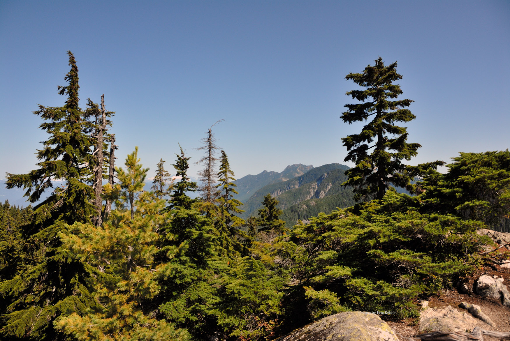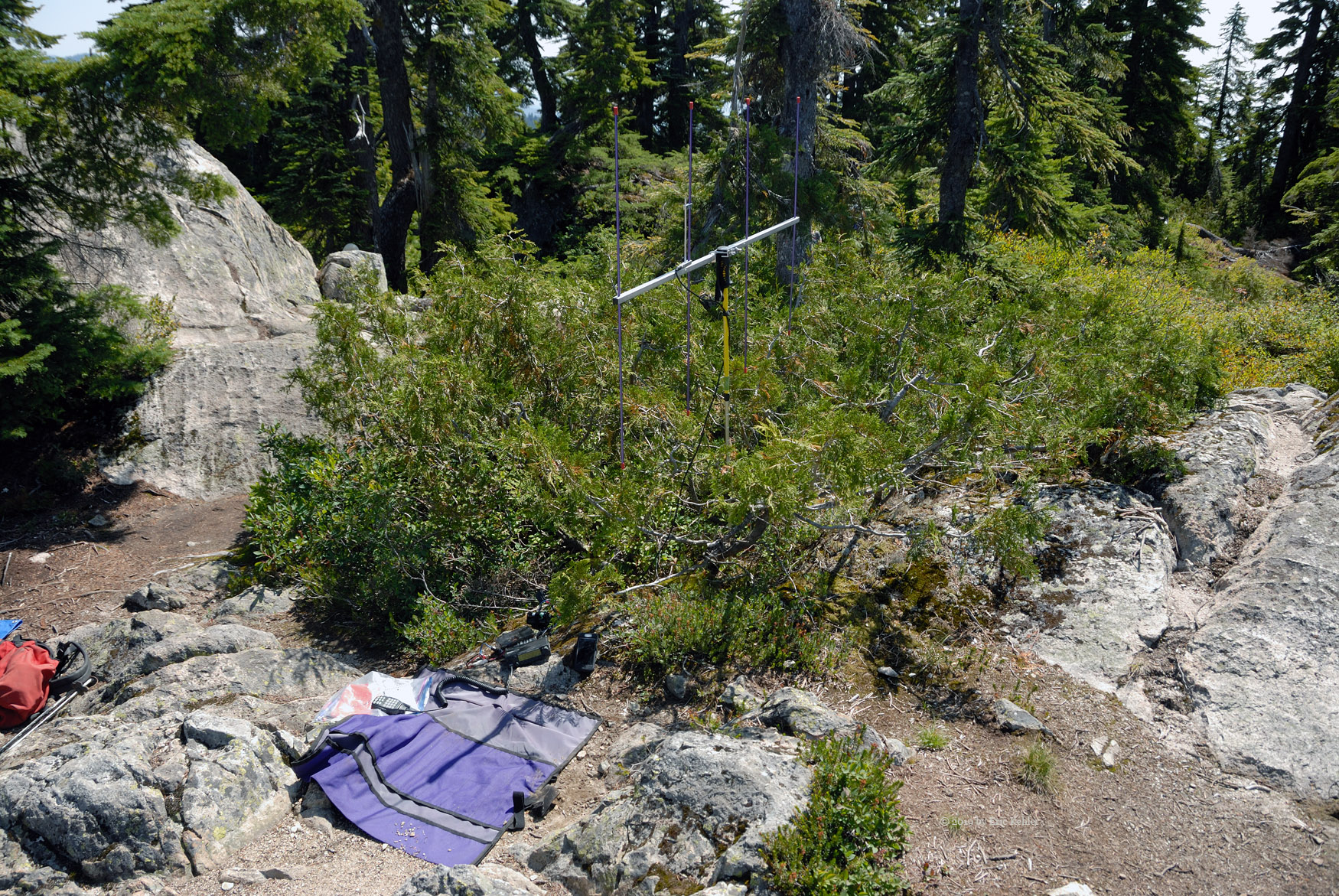 I took a few minutes to catch my breath and eat a few morsels before setting up for SOTA. I also took time to gather a few more photos of the views from the summit. It isn’t as open as the southern summit but the scenes are still quite rewarding. Done resting, I found a spot to anchor my antenna and then I assembled the yagi and put out my first call. I soon had several in the log. Previously I set my distance record on this summit with a Summit-to-summit contact with a chap east of Mt Rainier, 312km distant. I wasn’t expecting to beat that but I thought I could try for a new high in the number of contacts made on an activation. So, I took a bit more time working stations which continued coming in until I had 22 in the log. I took a rest to finish lunch and then called some more but only landed one additional contact. So I had 23 which was a new record for me.