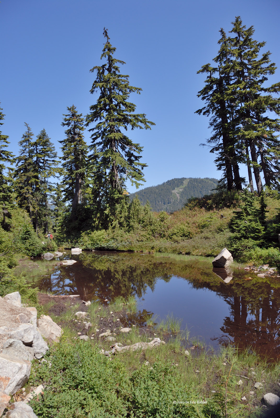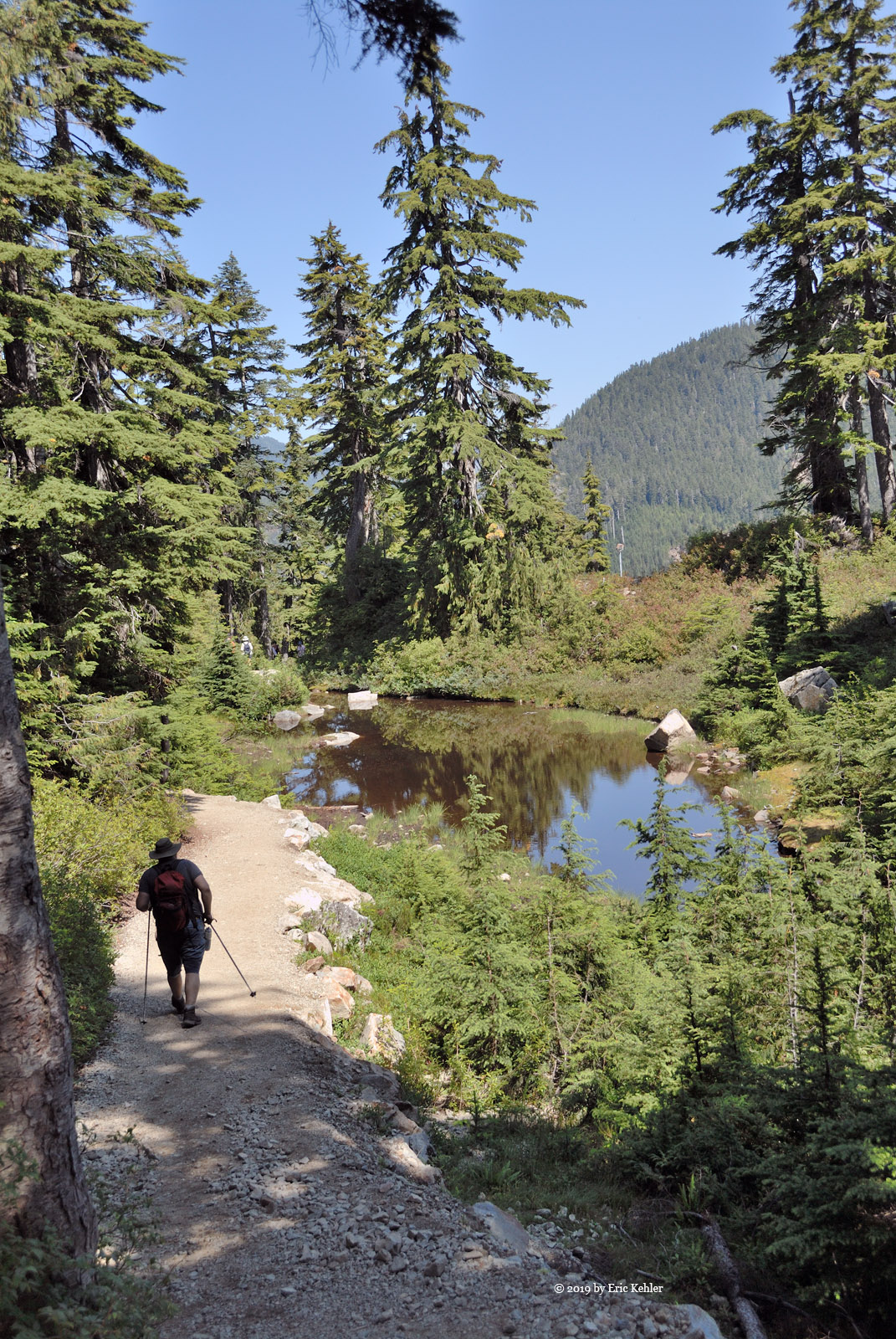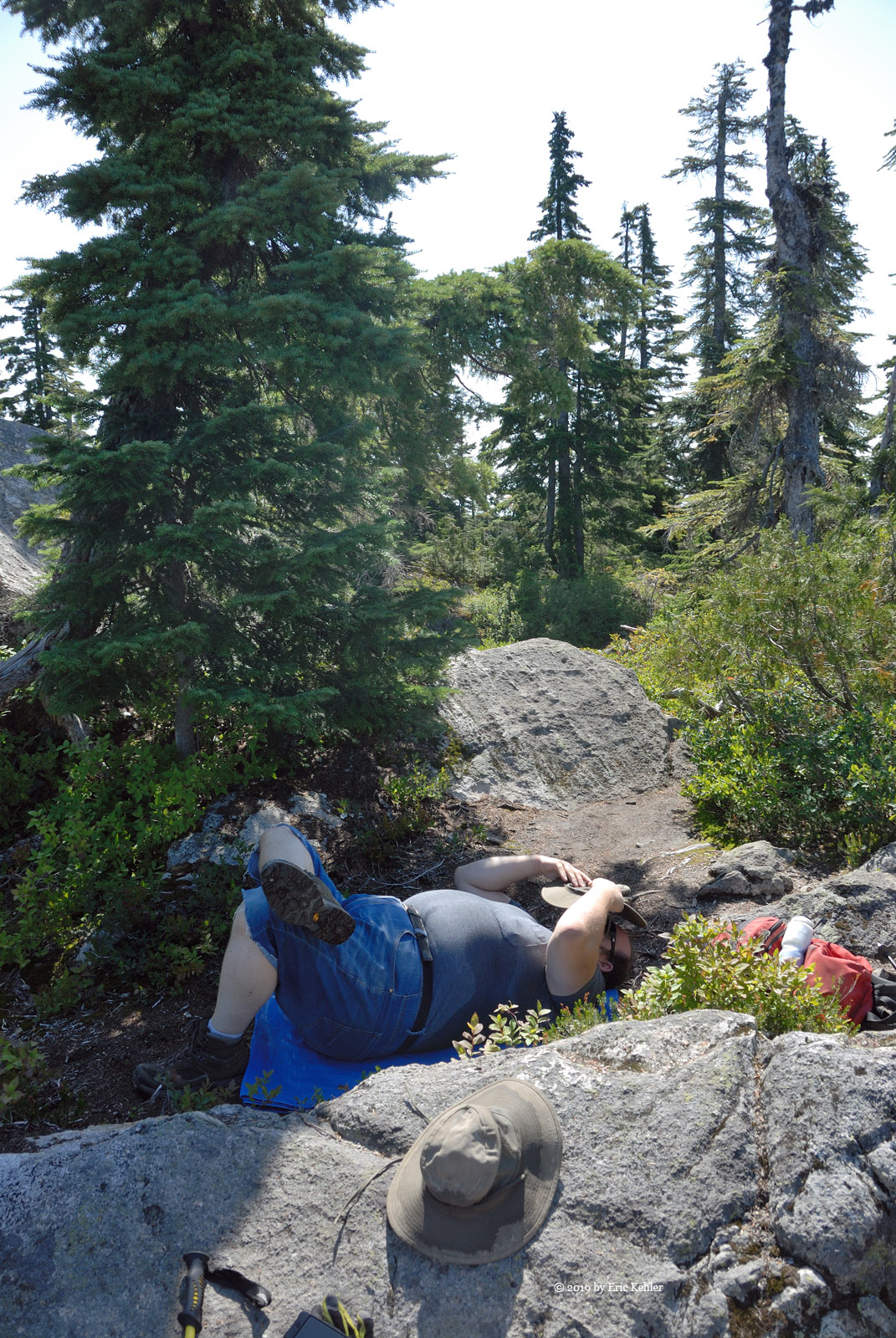 The rest of the drive went without excitement and we soon were in the parking area of Cypress Bowl. After some freshening up, we started on the trail at 10:45, it was getting hotter in the sun but the shaded areas were still pleasant. The trail is well maintained and quite wide but it is steep in several places and these really slowed Nick down. Fortunately, it being quite a short hike he was able to make reasonable time to the top ridge line. We took a short rest at Cabin Lake amongst the growing number of others who were also enjoying the scene. Then it was on to the north summit. This took only a few more minutes and we were finally at the summit. Nick immediately flaked out for a rest. It was well deserved as he had completed the ascent in about an hour and twenty minutes.