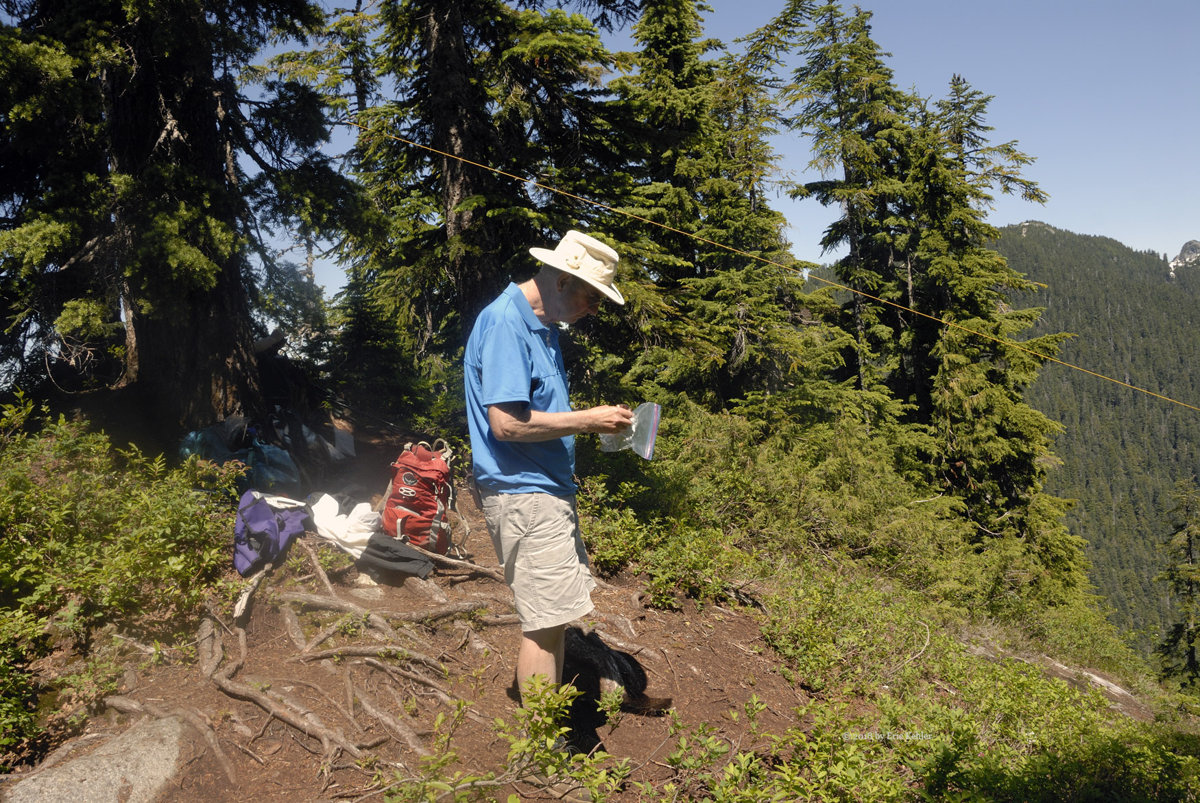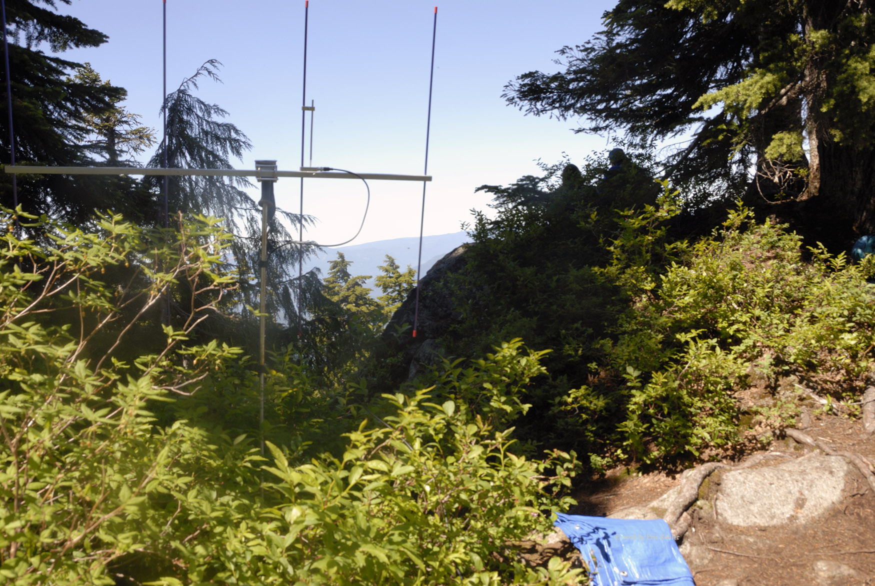 Once we were done eating we started scouting out a position to set up our radio gear for making some contacts. Ralph had his KX1 for CW on 20m, John set up his small transceiver on 40m in the voice mode and I used my hand-held with the 4 element yagi on 2m. Ralph was the first to make a contact but he struggled to pull in the needed 4 due to a very busy CW contest that was crowding the bands. I made a few contacts including with a chap driving the sea-to-sky highway right below us! I soon got my 4 contacts but John was having trouble with 40m as Ralph’s signal was over-powering his radio, so he had to wait for Ralph to be done. But then he managed to get two other stations both of which were on other summits. It took quite a while to get his 4th. John ended up using my 2m setup but with the yagi pointed due north – straight at the granite face of the Lions! That worked and he had his 4 contacts.