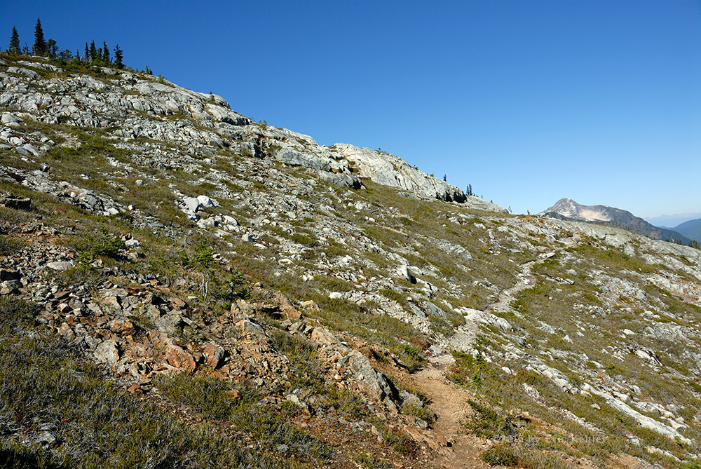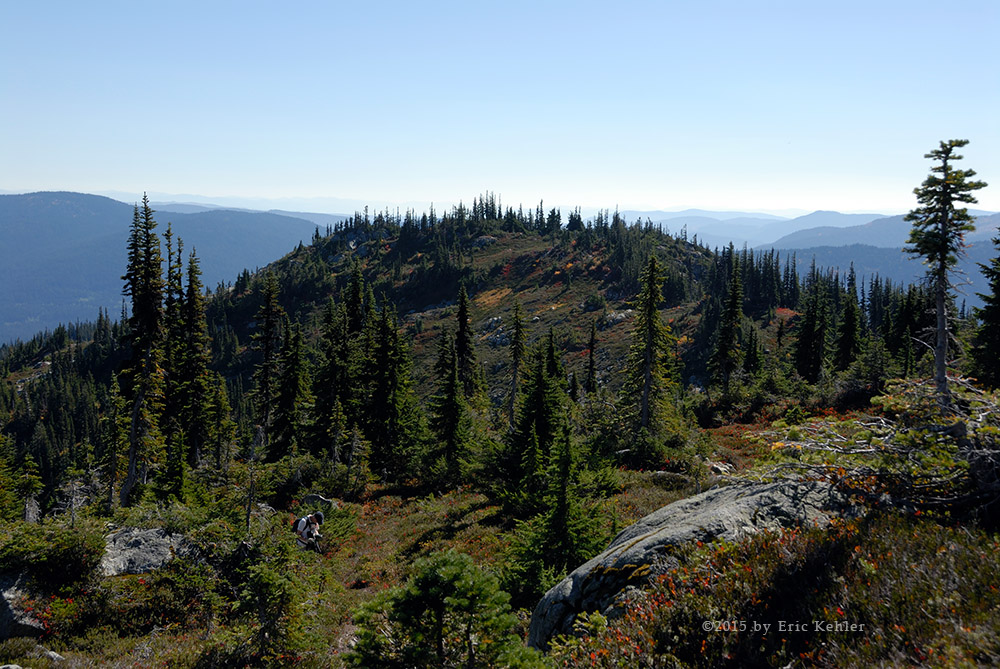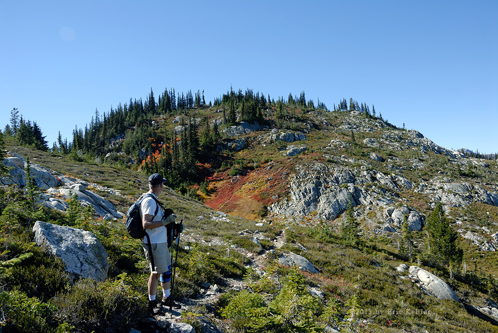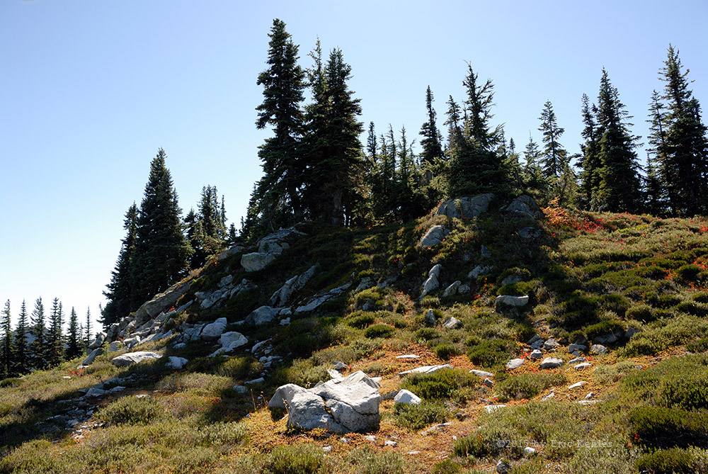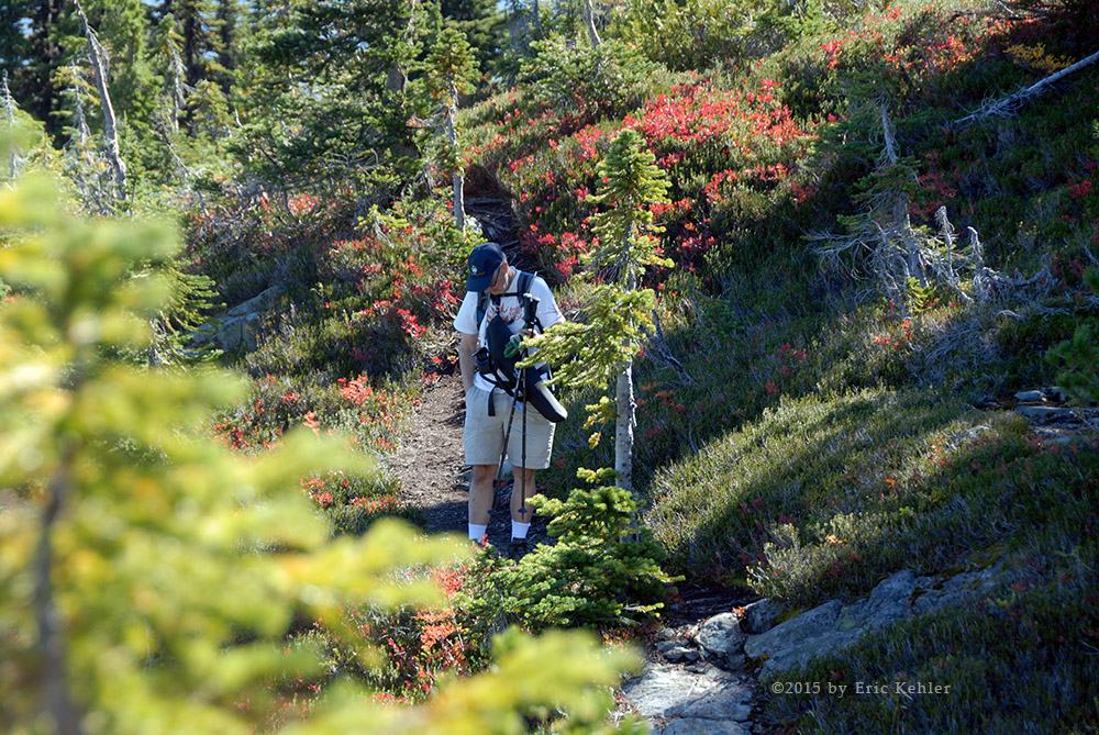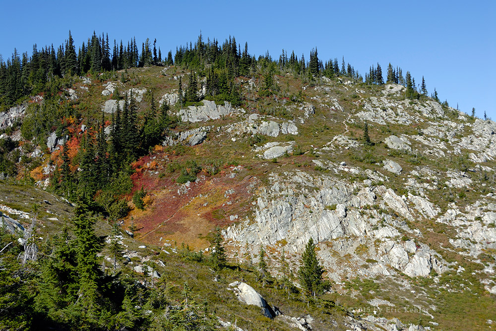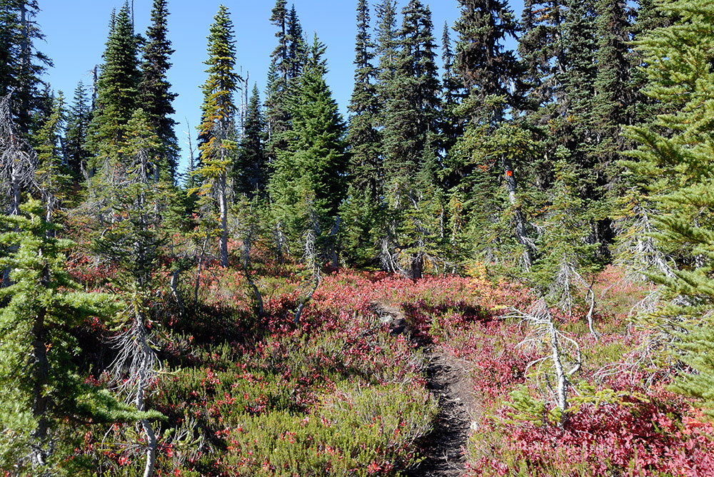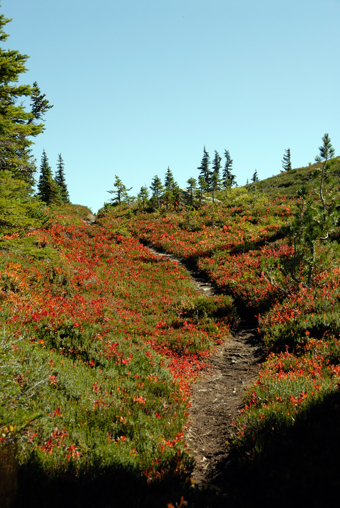 Once parked we quickly got our gear organized and then set off for the trail. Though the road was very rough we still preferred it to having to walk the 300m elevation gain section of the slope to the start of the trail proper. The initial section of the trail is fairly steep as it winds its way through an alpine forest. Fortunately the trees offered shade and kept us cool in the growing heat. The trail was well trodden and ease to follow, it was also well marked with new reflectors placed on trees. Soon we were up to the ridge line and the climb got much more gradual. The fall colours were starting up here with the blueberry leaves coloured bright red. The ash was yellow and with the deep green of the spruce, and a small hint of white wild flowers the slopes quite spectacular to view.