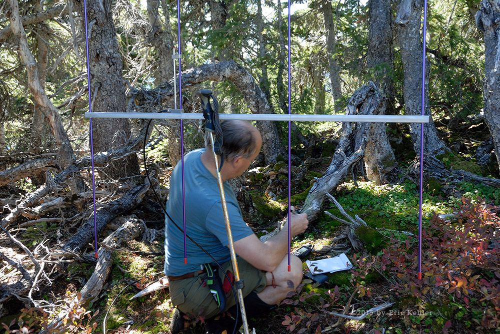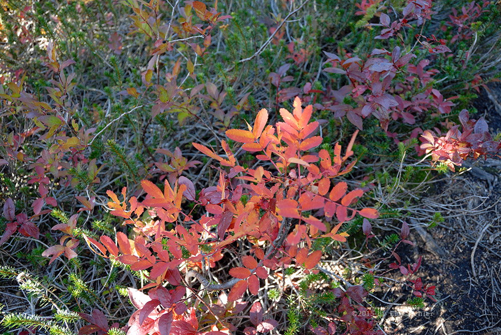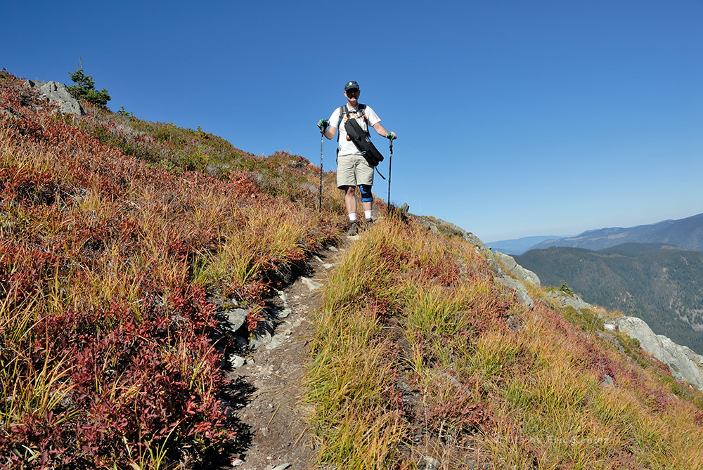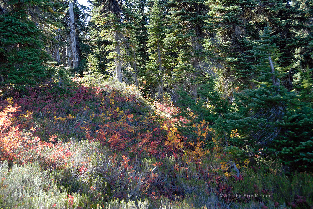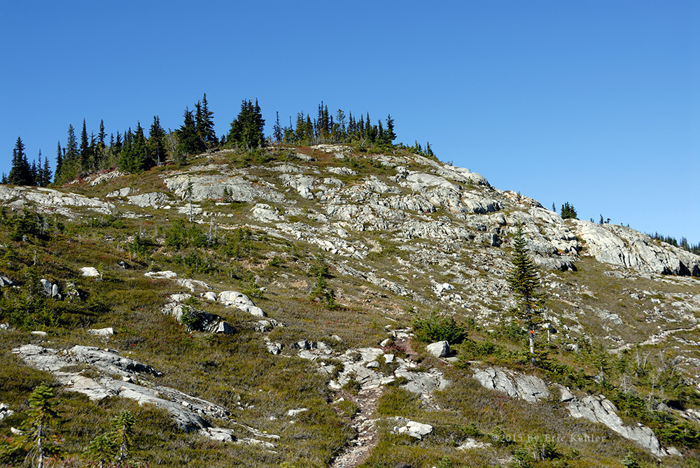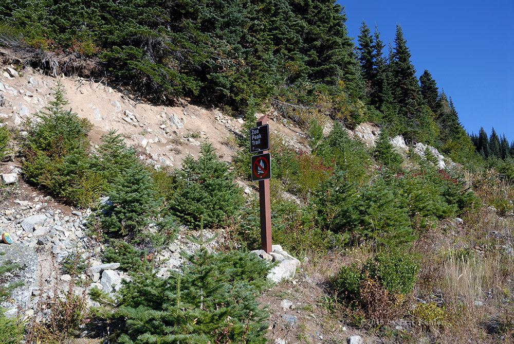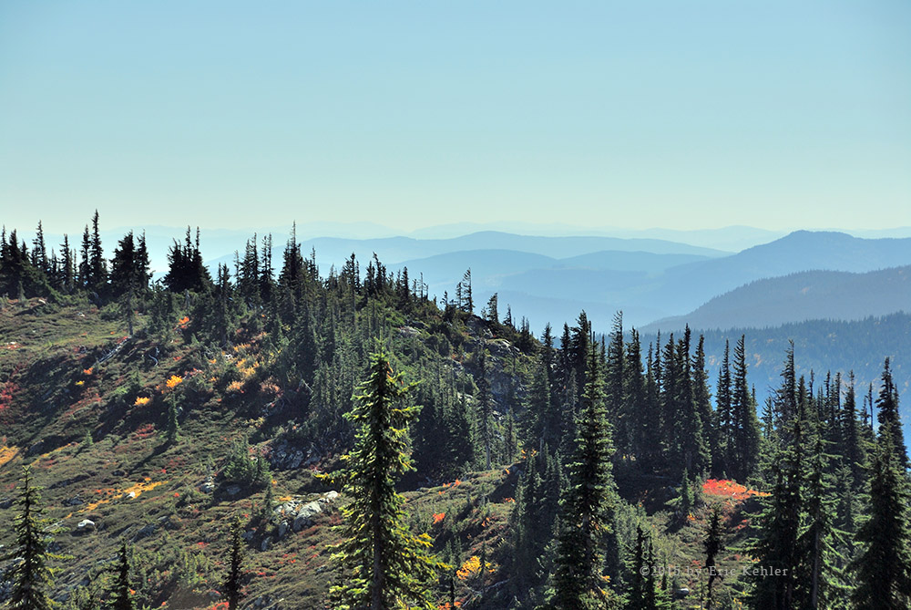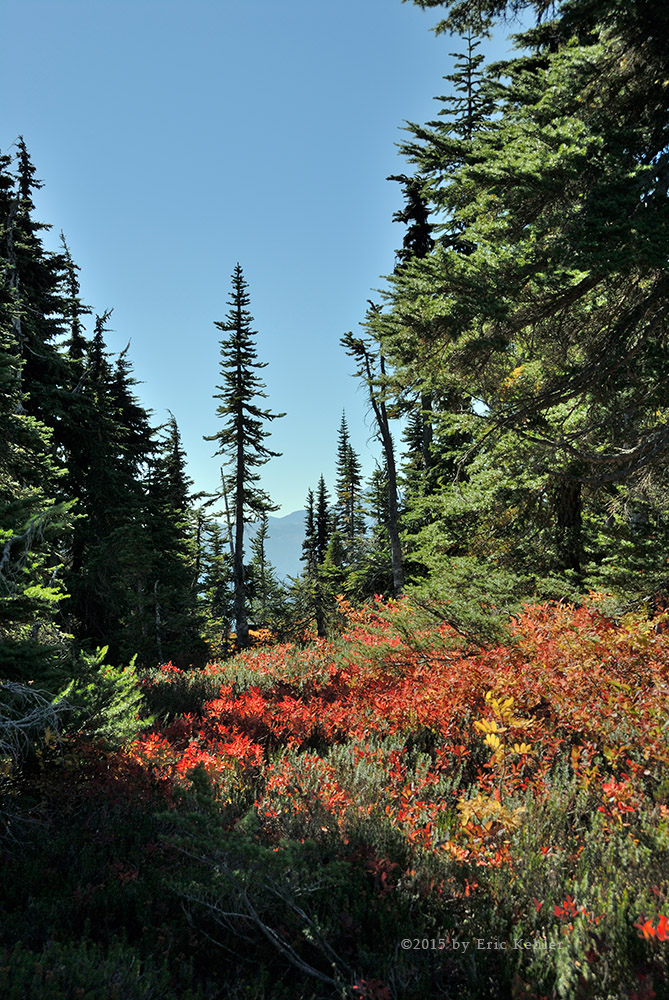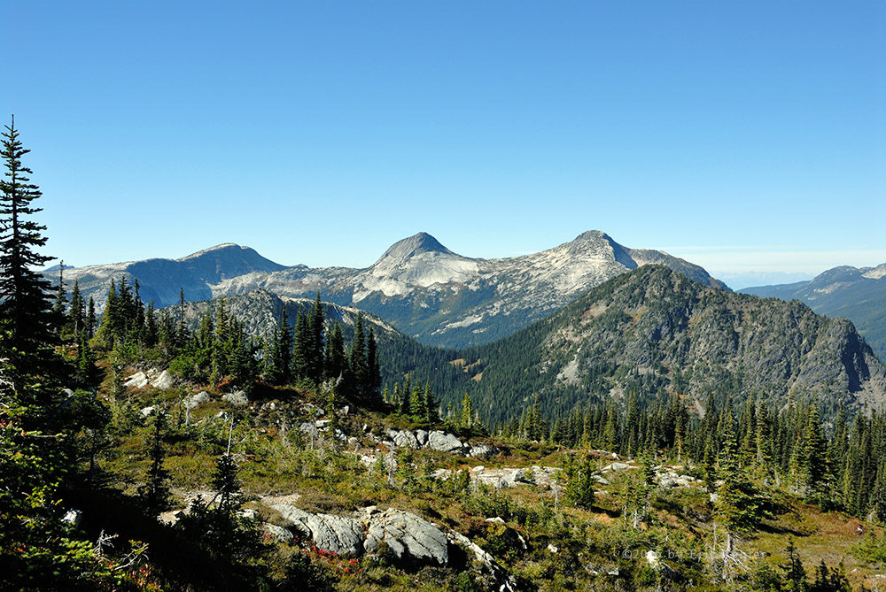 Once parked we quickly got our gear organized and then set off for the trail. Though the road was very rough we still preferred it to having to walk the 300m elevation gain section of the slope to the start of the trail proper. The initial section of the trail is fairly steep as it winds its way through an alpine forest. Fortunately the trees offered shade and kept us cool in the growing heat. The trail was well trodden and ease to follow, it was also well marked with new reflectors placed on trees. Soon we were up to the ridge line and the climb got much more gradual. The fall colours were starting up here with the blueberry leaves coloured bright red. The ash was yellow and with the deep green of the spruce, and a small hint of white wild flowers the slopes quite spectacular to view.
