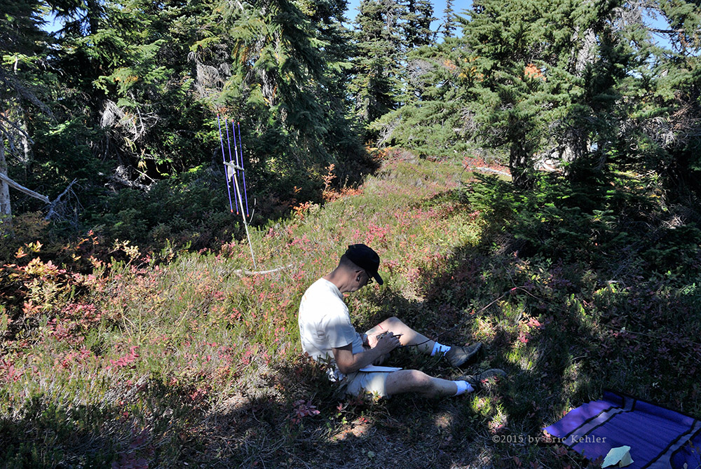 We continued our way along the trail as it followed the ridge to the summit of Zoa. At one point we met two hikers come back from the summit. The one chap almost walked into me, he was so involved in his conversation with his buddy that he really wasn’t watching the trail! We stopped and chatted for a while he does rock climbing and several other more challenging adventures in the hills. This hike was an easy check out hike for him. After a rest we continued along the trail and eventually reached a view of the peak and the what appear to be steep trail to the summit. Though it looked quite challenging from the distance the final climb wasn’t too bad and we were soon following the trail as it led past the actual summit for a better viewpoint on the shoulder. We left the trail and made for the actual summit. It was in a lovely settling with trees scattered around it giving us a shaded spot to set up and operate from for our Summits on the Air activation of the summit. First we unloaded and ate lunch to regain our strength after the hike. I got my 2m antenna assembled and put out a call to the Sumas Mountain repeater. I was able to reach it in a spotty fashion with contacts fading in and out. I tried a number of locations to see which would reach it more reliably eventually settling on a spot a few meters to the SE of the summit. I heard Carolyn (VA7CDA) make a call to me but I wasn’t able to respond for her to hear me. A bit later Bill (VE7WNO) called and him I was able to talk with. Over the next hour I managed two more simplex conversations including with a hiker doing a SOTA activation on a peak in the U.S.