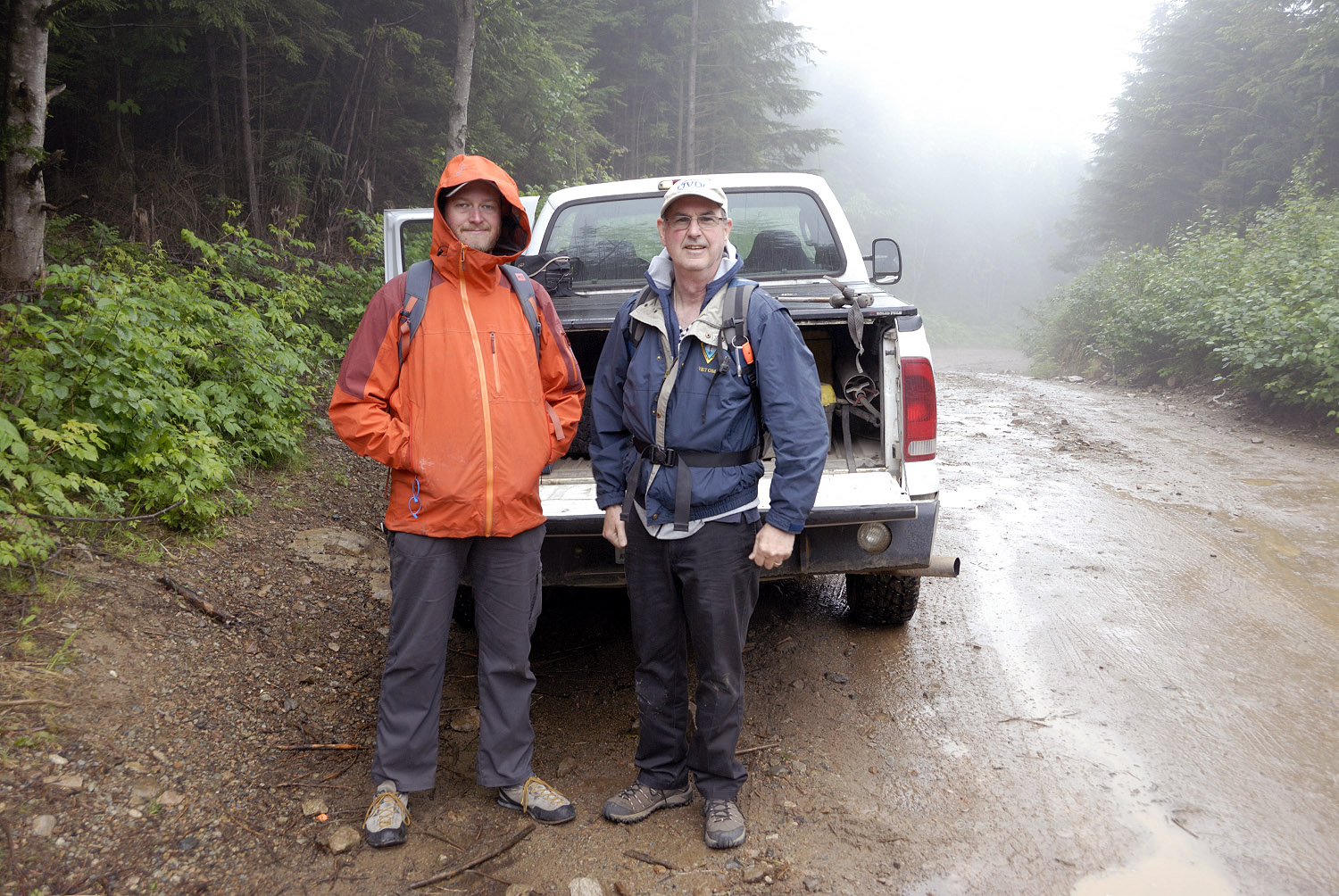 We had talked with John briefly two weeks earlier as we returned from our Mt. Lincoln hike. We knew him from the Sota organization but had never met until this morning. So this would be an added bonus for our adventure. John arrived a bit after our target departure time, he was coming from Vancouver and got a bit delayed en-route. But soon we were off to our coffee and fuel stops before the easy drive to Sumas Mountain and the logging road. As we climbed the center area of the mountain the weather worsened and soon we were covered in cloud and a constant fine drizzle. This continued through our drive and while we geared up and started out.
