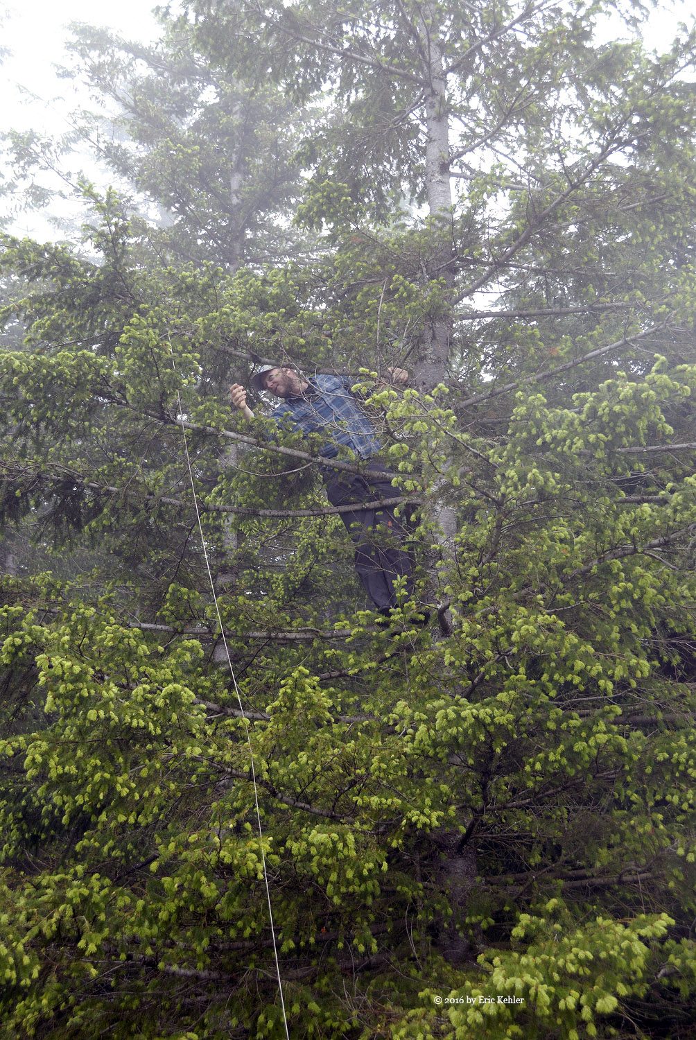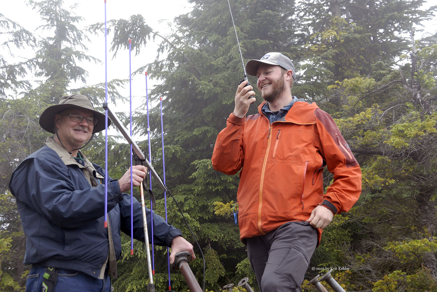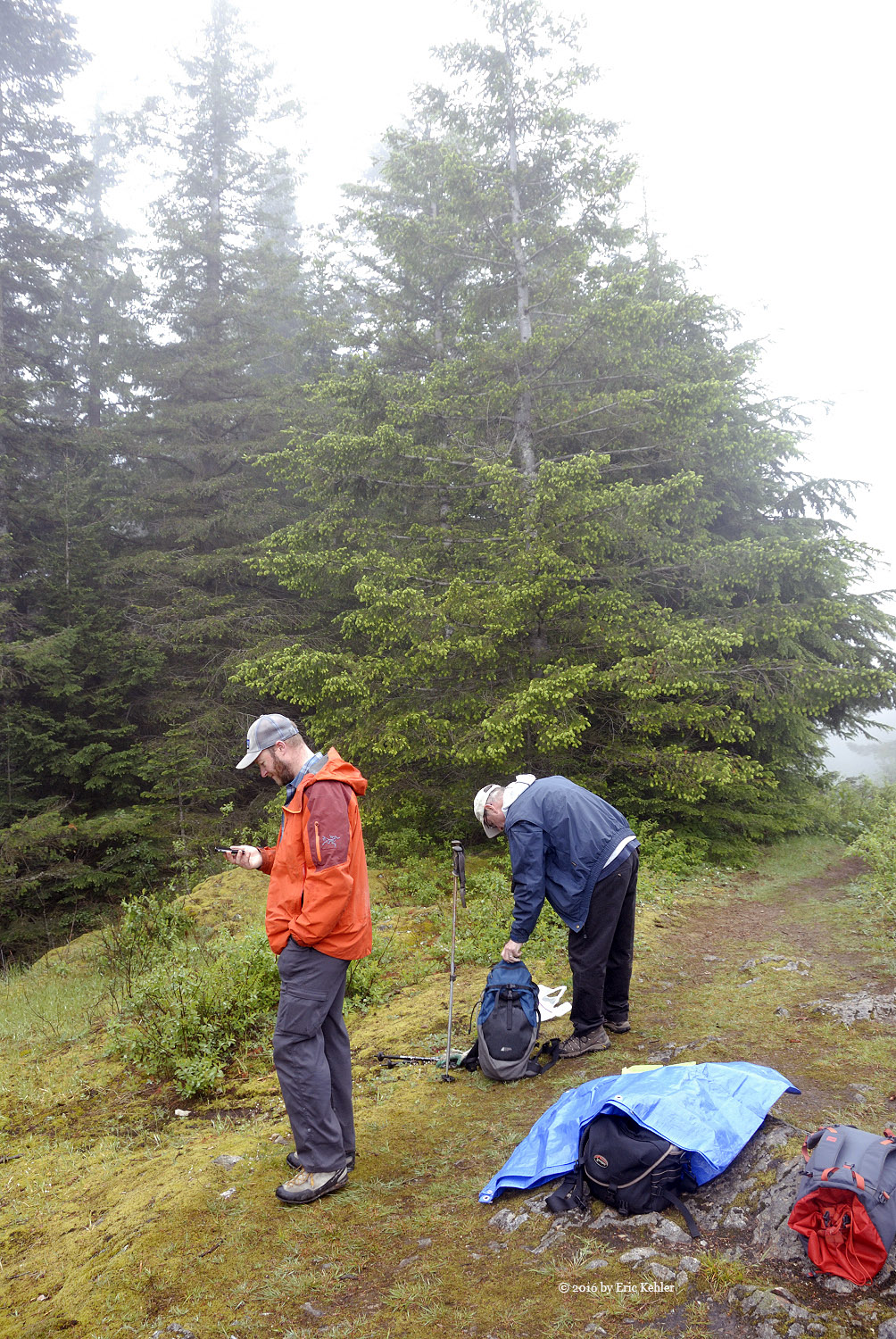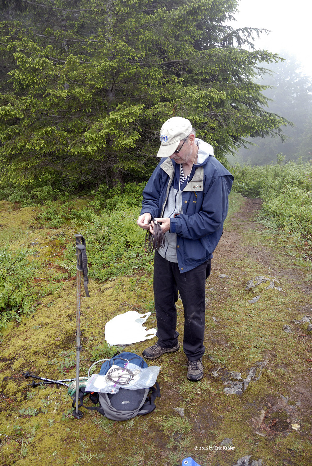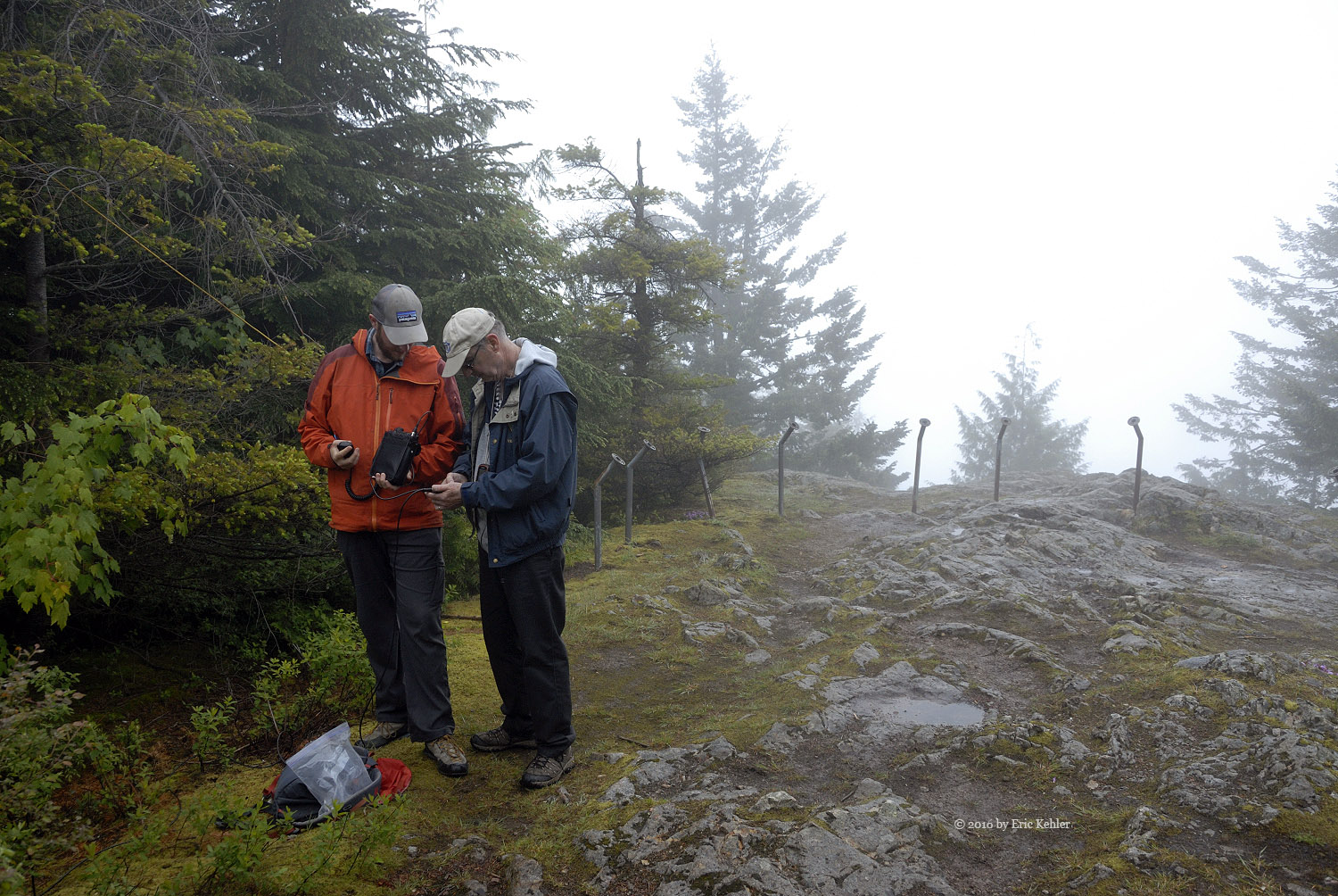 The walk up the road went quite quickly as we were quite engaged in hearing about some of the exciting hikes John had recently completed. They were beyond Ralph and my abilities but at least we can dream and enjoy the thoughts of the hike. The coolness of the day made for a better time as we didn’t need to stop and rest as often. Soon we reached a small side trail that we skipped on the way up last trip. We confirmed back then on the way down that it would skip past the towers and so today we followed it and soon were at the east lookout enjoying a sheet of cloud and absolutely no view. There was a group of 10 already on the spot resting and chatting. They became very interested in our activities as we started setting up our radio gear.