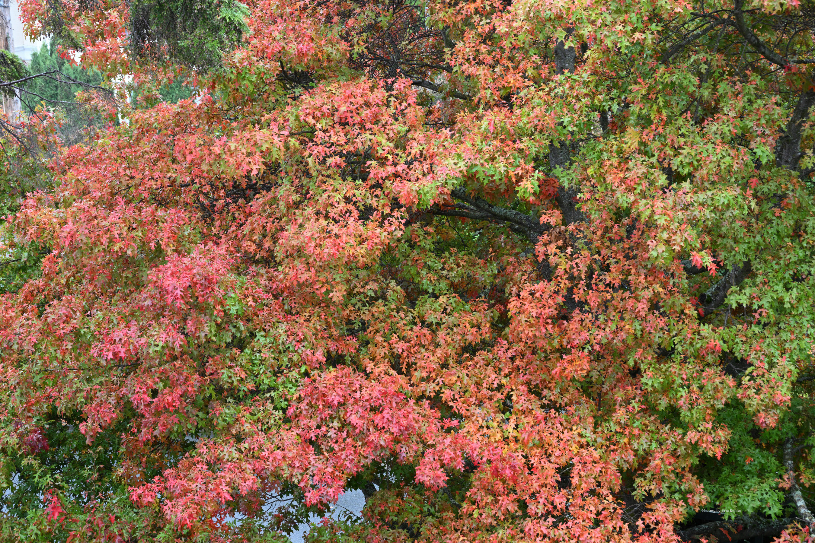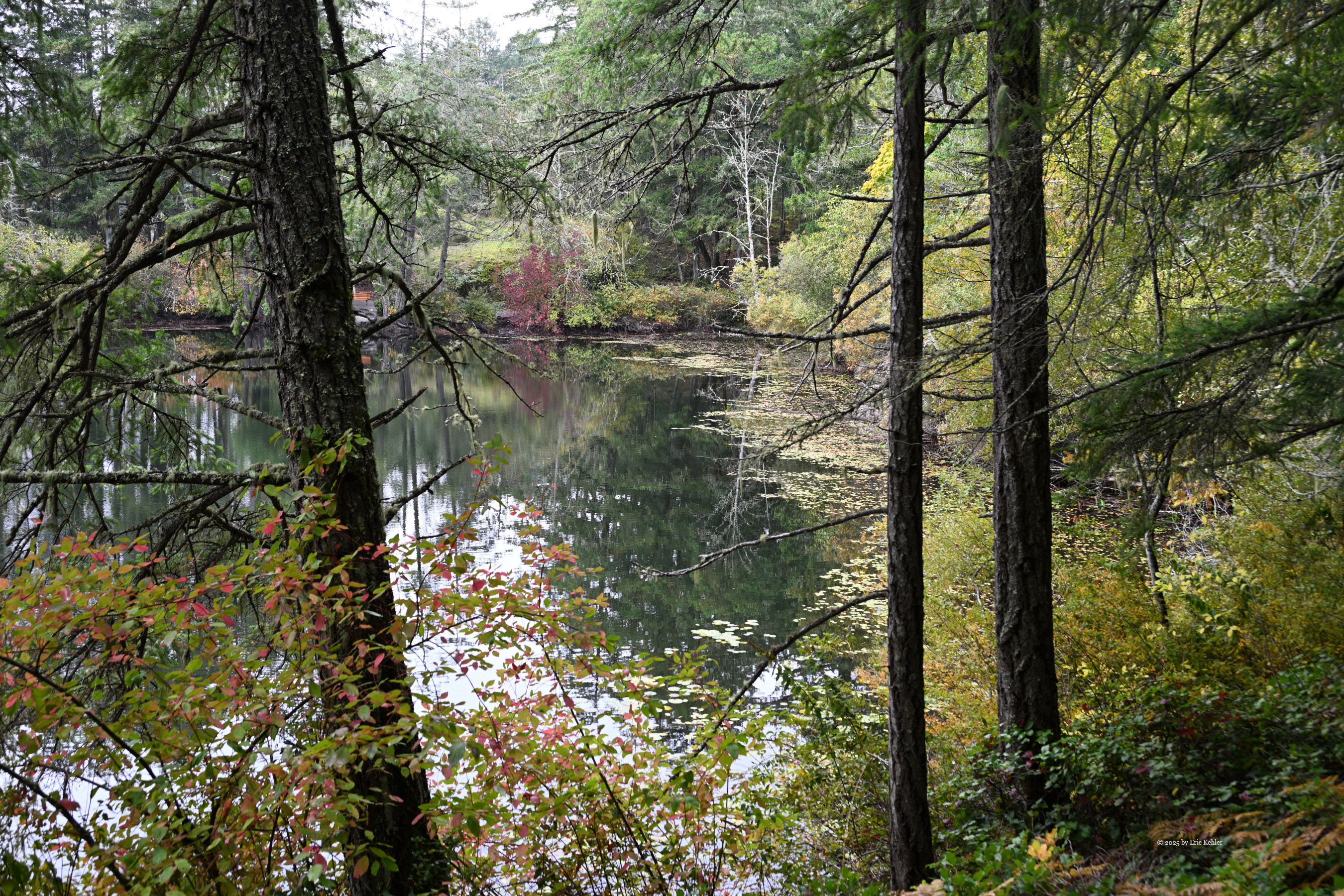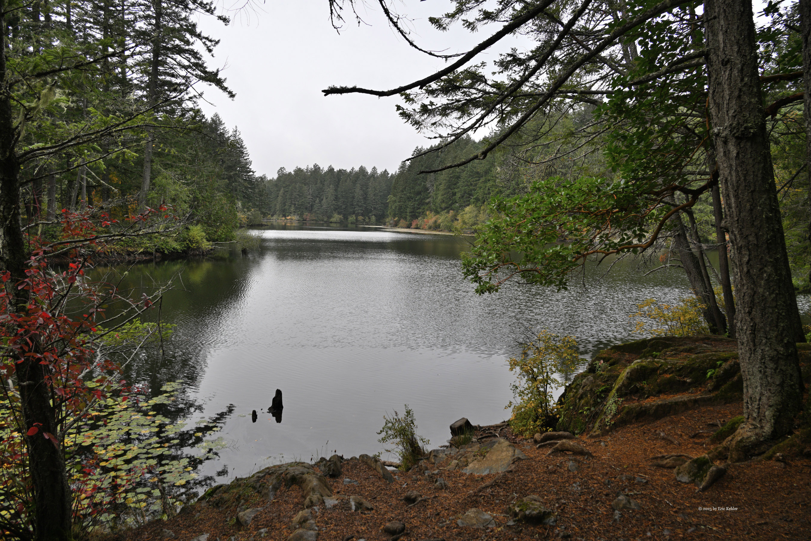 The trail around the main lake is 4.8km in length which would be a good length for the day’s adventure. The fall colours were out and they offered some pretty sights along the edge of the lake. The trail hugs the shore of the lake quite well but there are a number of spots where it climbs a few 10’s of meters above the water. Not an overly difficult walk and a few people were jogging it as they passed us. We stopped at several points along the route for me to take a few photos. It is a lovely time of year for colour, and the water adds to the dynamism of the scene. Even the dull misty weather made for some interesting vignettes of the Fall colours.