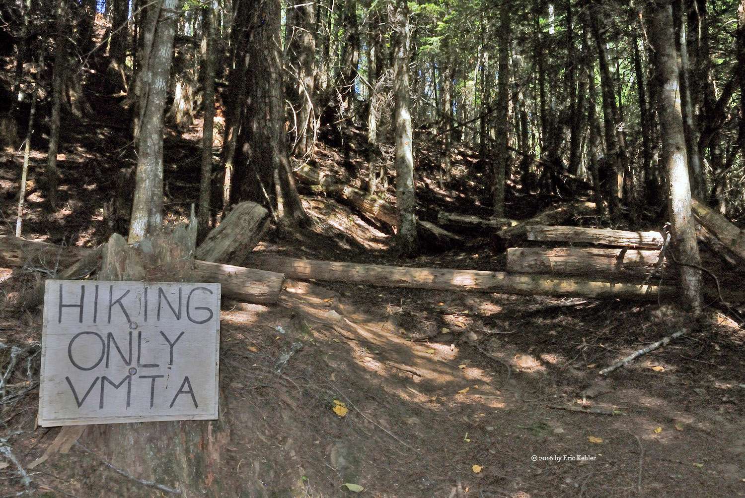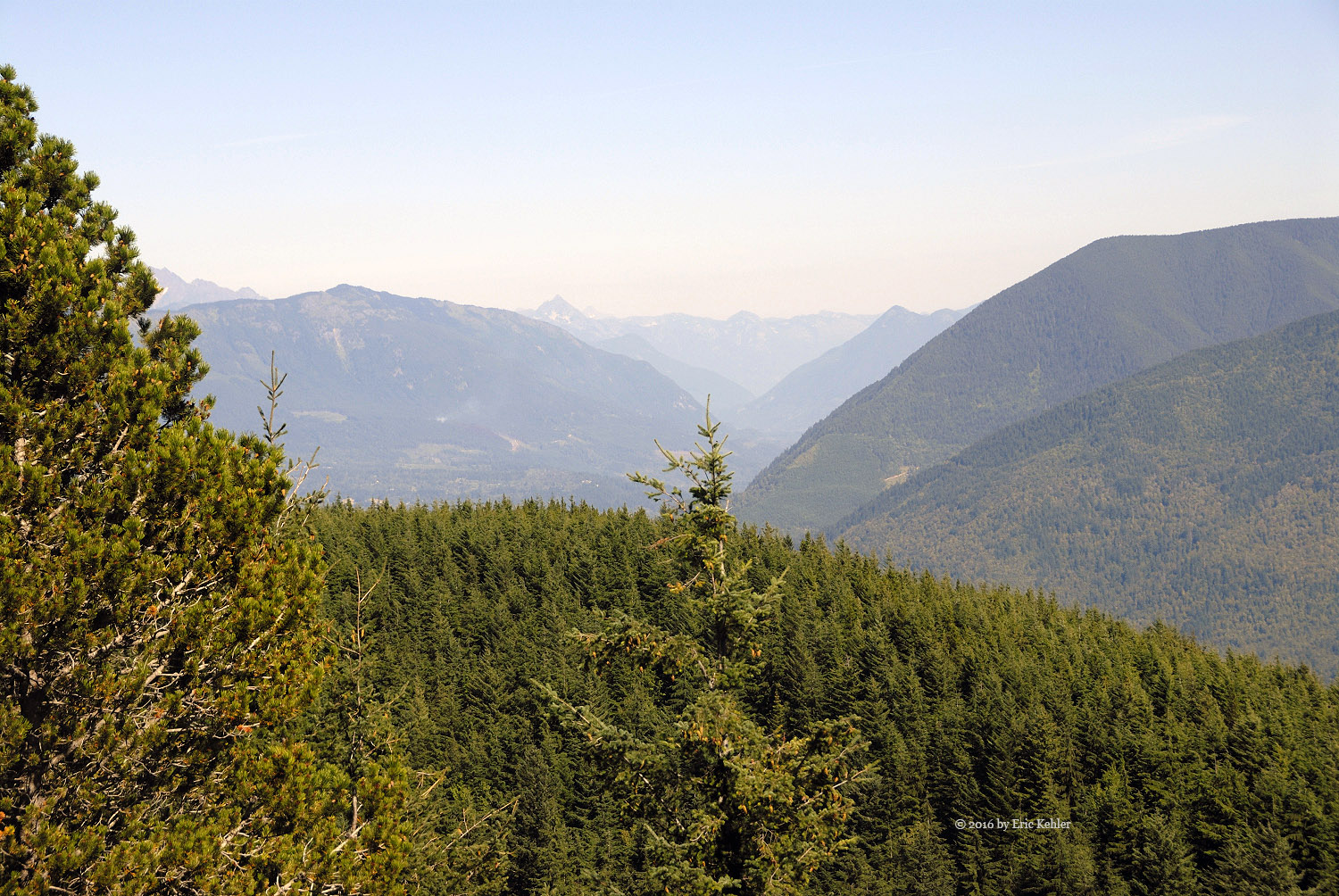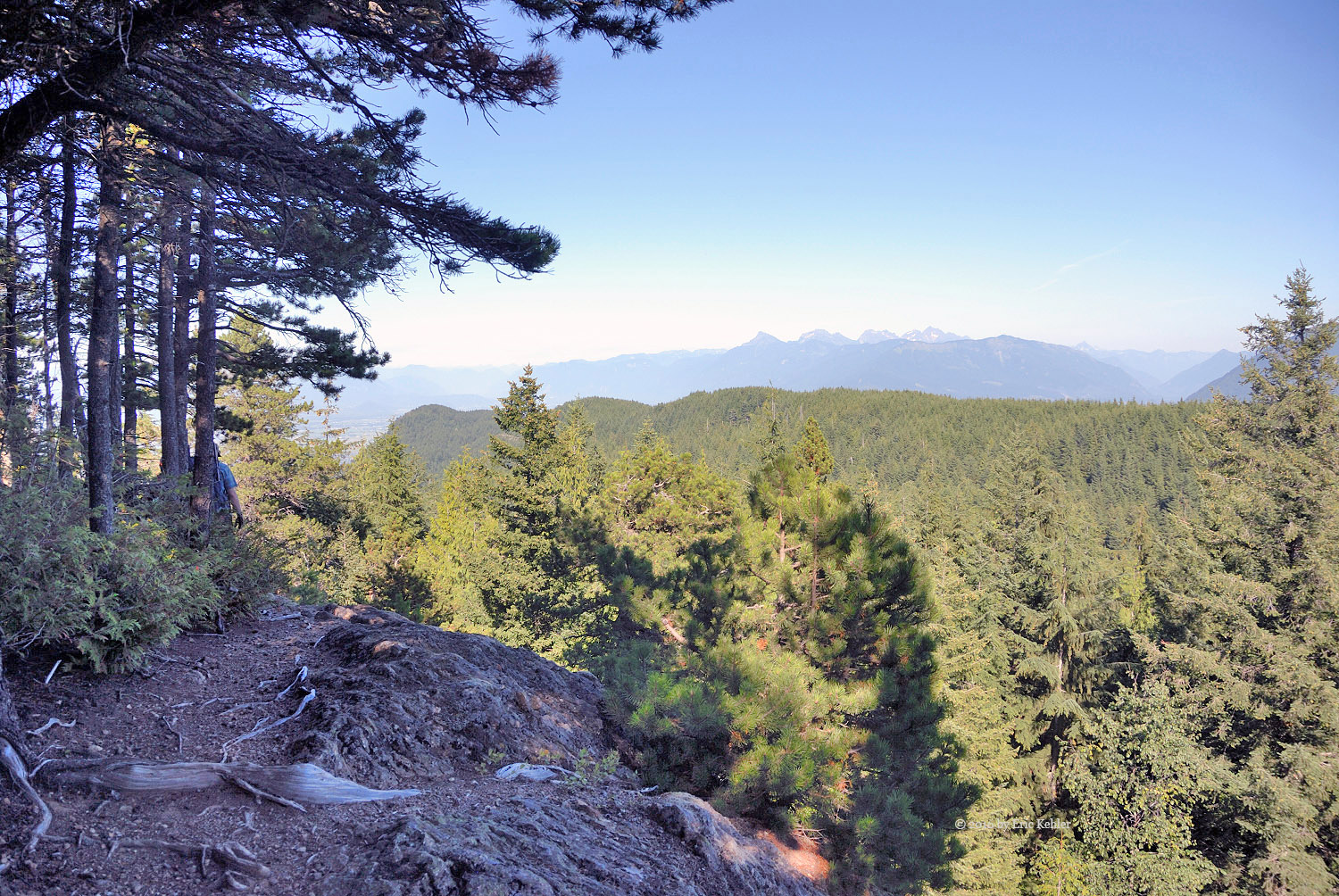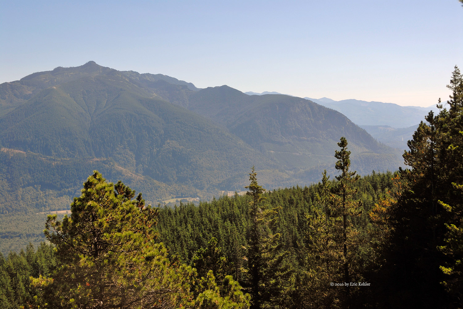 We got our gear on and started up the rest of the road carefully picking our way across the dugout. The trail continues along the road for a short ways to the official trailhead. Here there were steel cable covered logs and cables strung across the trail with signs stating it was a foot trail only. These guys are really serious up here. We made it past that barrier and started up the trail. It was a very pleasant hike as the trail was soft for the feet, well-marked and worn and the trees provided constant shade to keep the heat down. The three of us followed the trail easily and found it a very pleasant one to hike. It added a number of rises and dips to the slow elevation gain we were making. About half way there is a short side trail to a lovely viewpoint to the north. Here we stopped to enjoy the valley view and eat a few morsels before continuing to the summit.