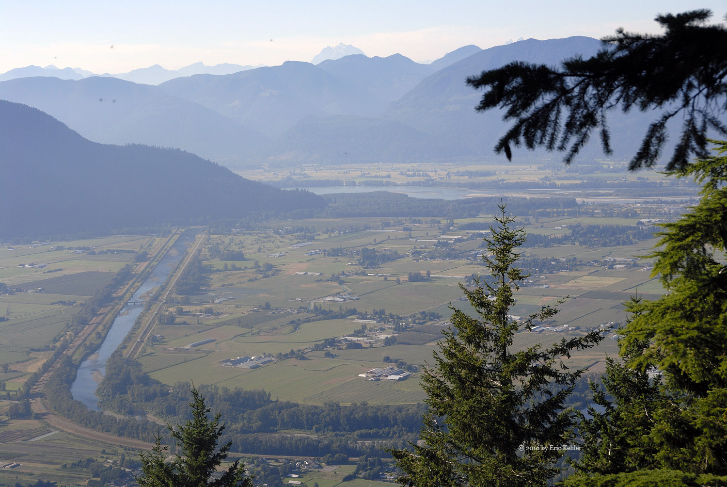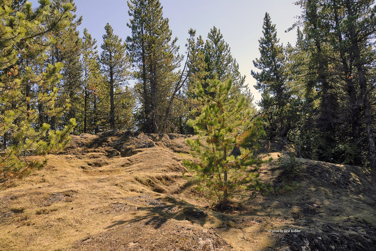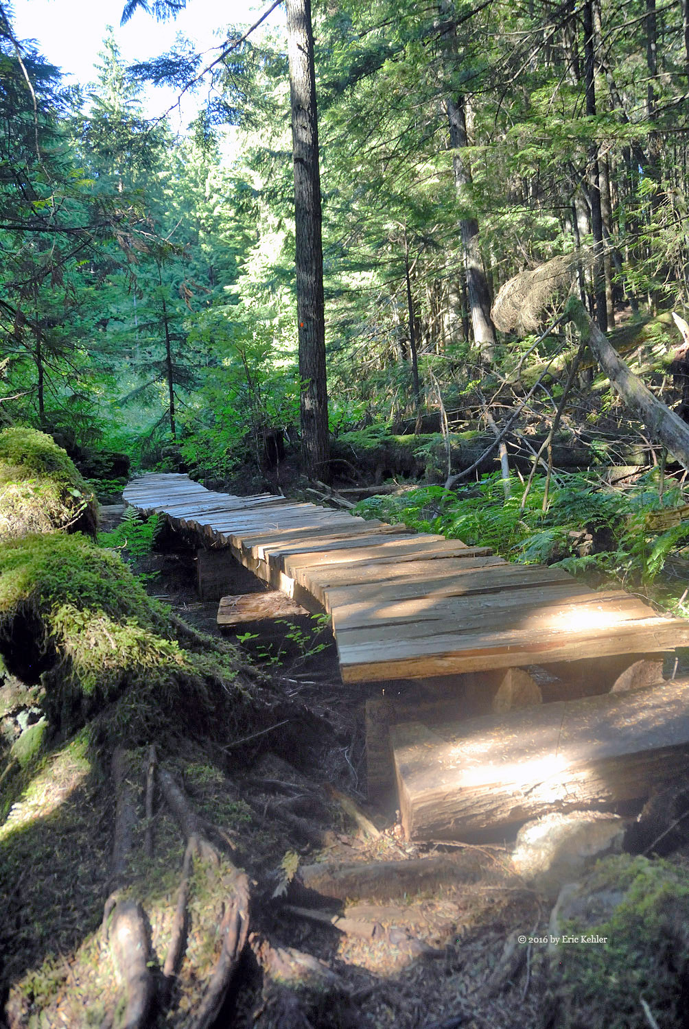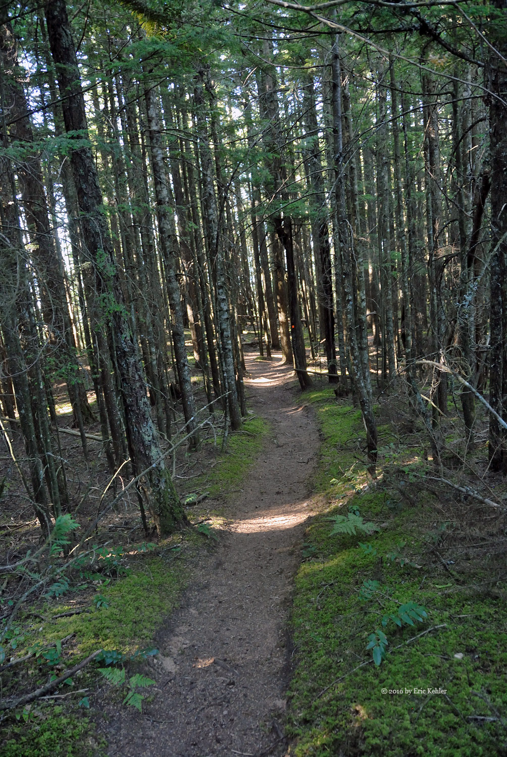 We got our gear on and started up the rest of the road carefully picking our way across the dugout. The trail continues along the road for a short ways to the official trailhead. Here there were steel cable covered logs and cables strung across the trail with signs stating it was a foot trail only. These guys are really serious up here. We made it past that barrier and started up the trail. It was a very pleasant hike as the trail was soft for the feet, well-marked and worn and the trees provided constant shade to keep the heat down. The three of us followed the trail easily and found it a very pleasant one to hike. It added a number of rises and dips to the slow elevation gain we were making. About half way there is a short side trail to a lovely viewpoint to the north. Here we stopped to enjoy the valley view and eat a few morsels before continuing to the summit.