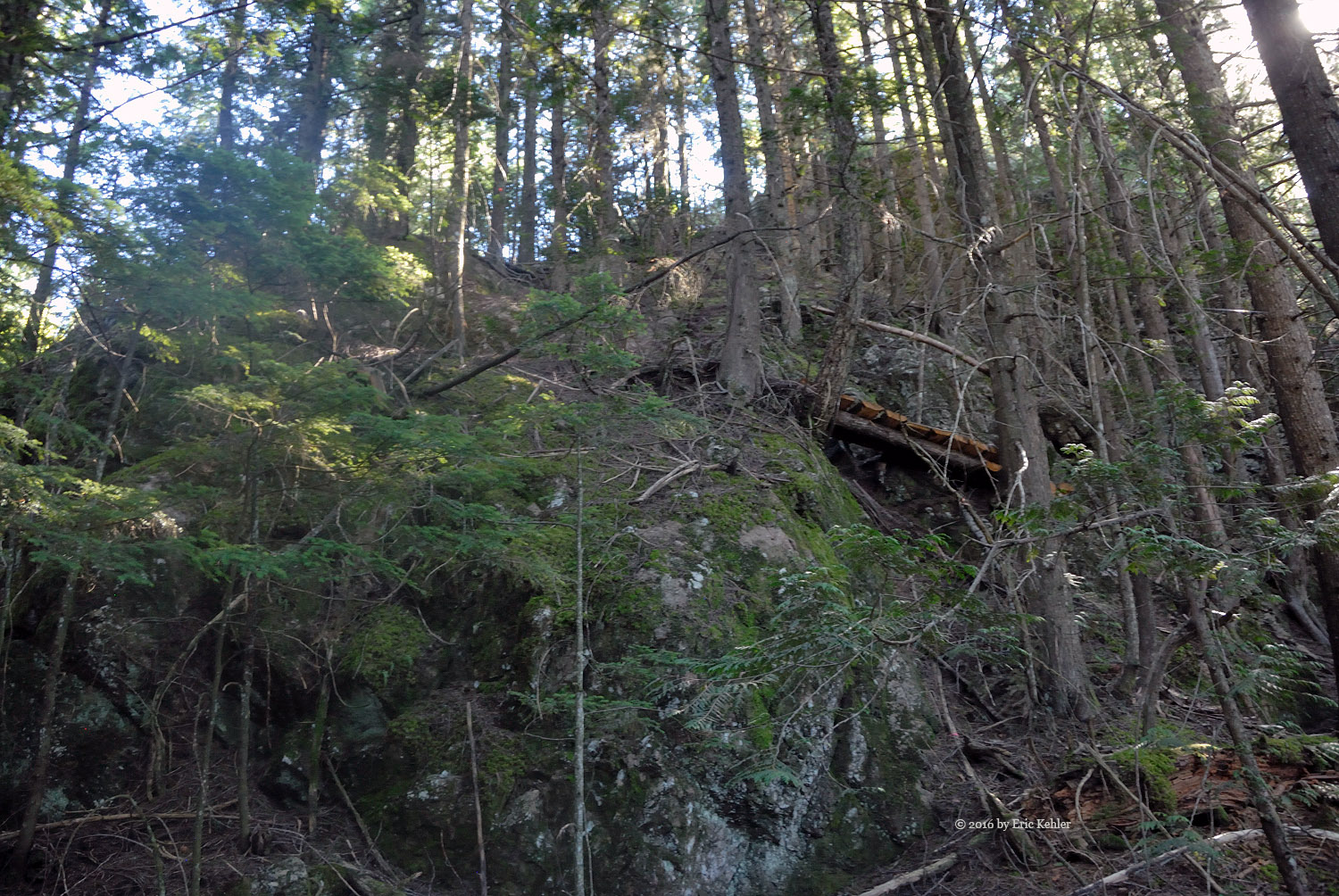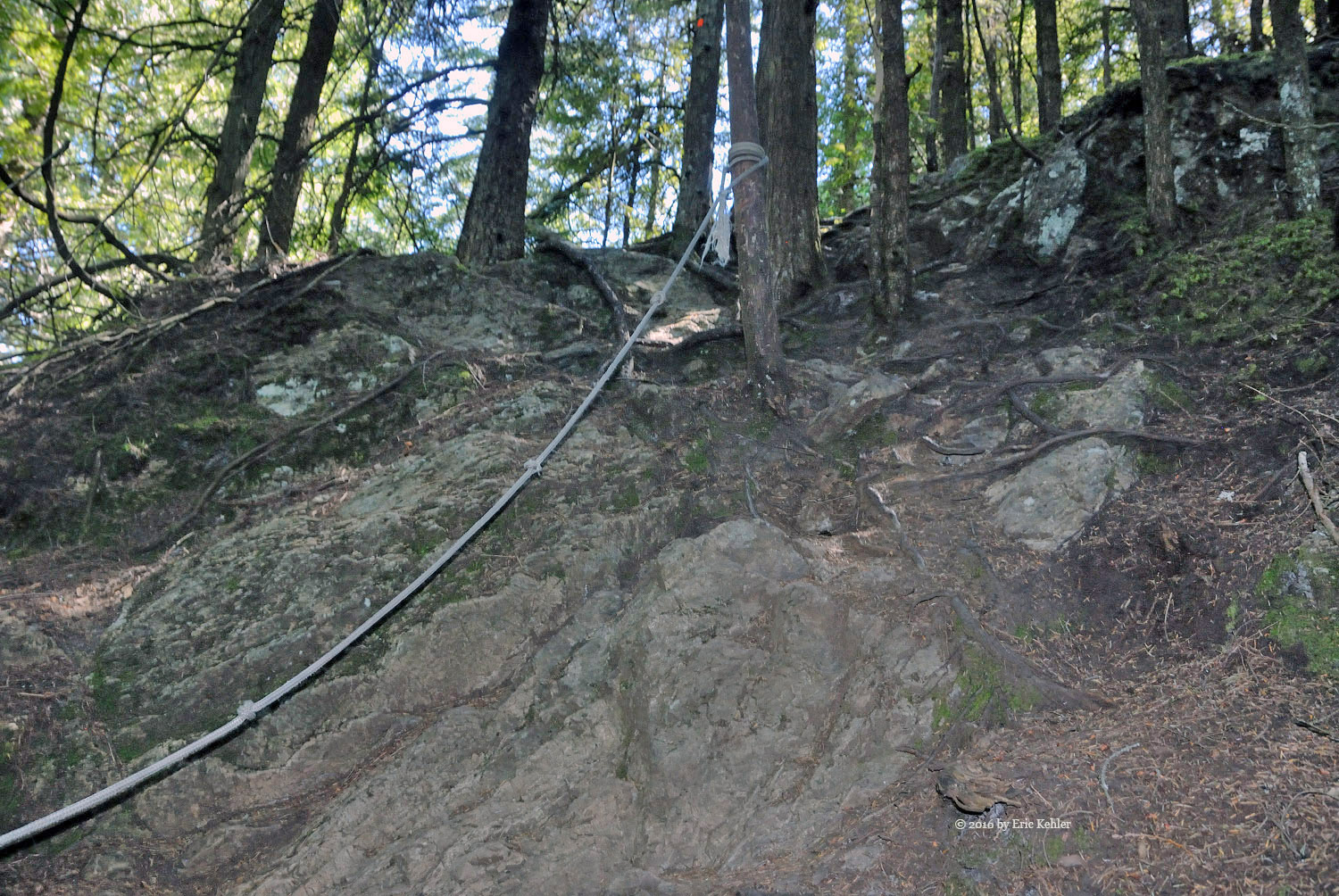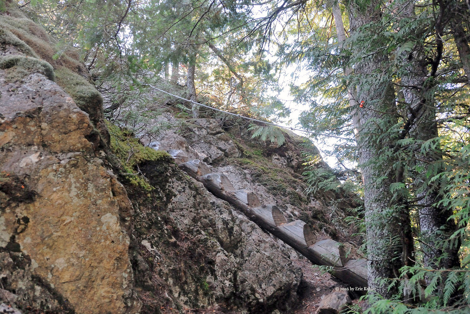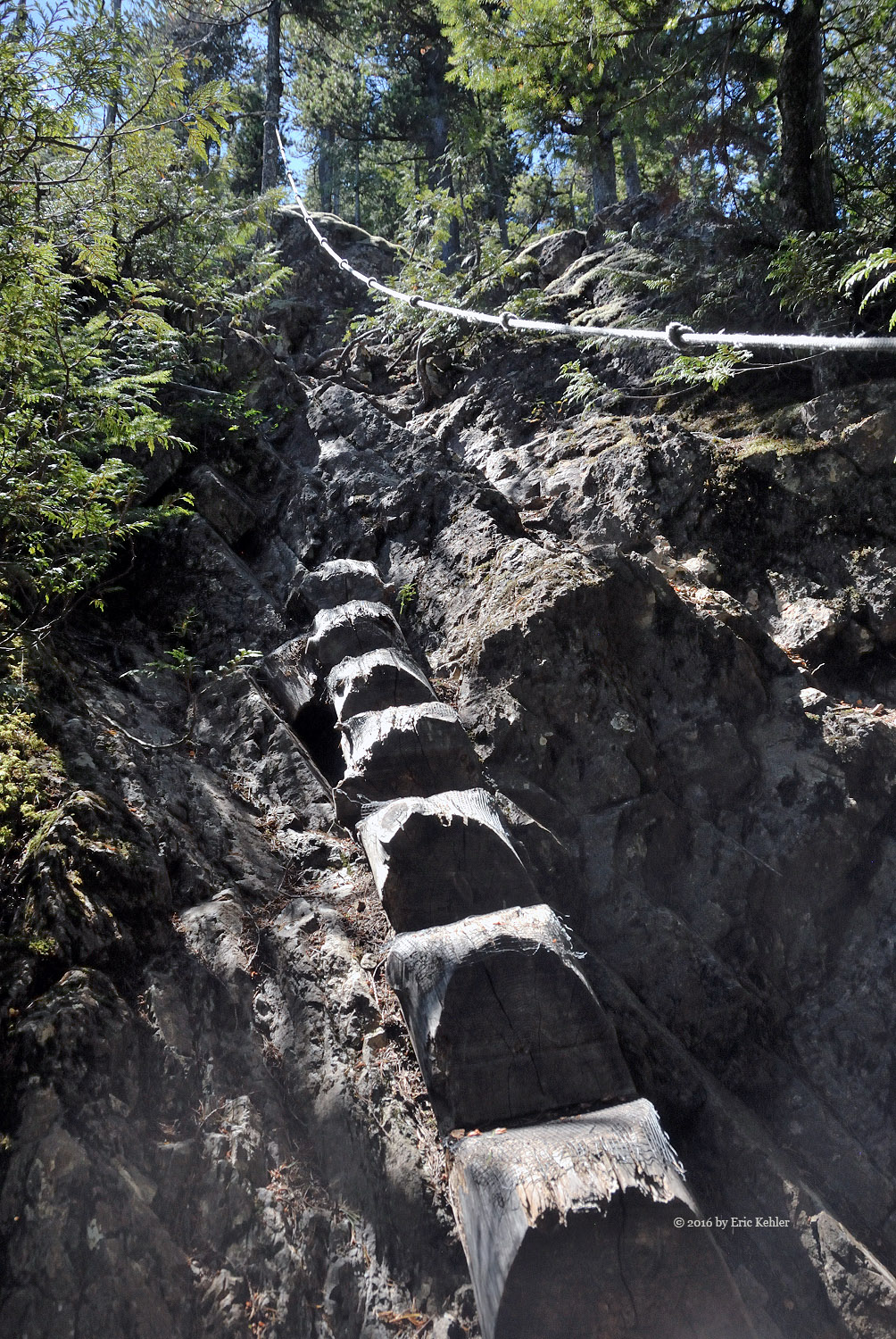The trail made its way around the east side of the lake before heading back towards the summit. There was a lovely wooden causeway built here which made walking across the marshy ground a breeze. There were a number of such improvements to the trail which made it easy to walk. Now the trail reached some more challenging slopes as we neared the summit. The trail actually takes one across a rock face via a nice bridge followed by a short rope section. It looked intimidating from below but was actually fairly easy. The final steep section was endowed with a notched tree and rope so one could climb it very simply. Now we wer on the top ridge and in the sun and heat!