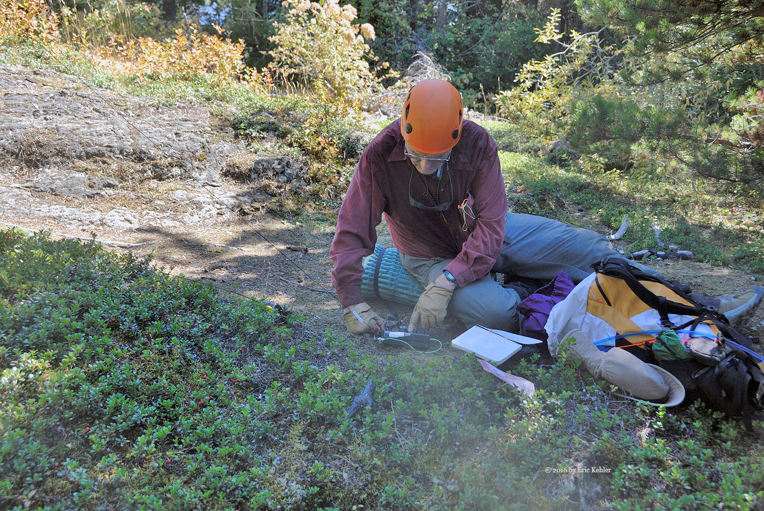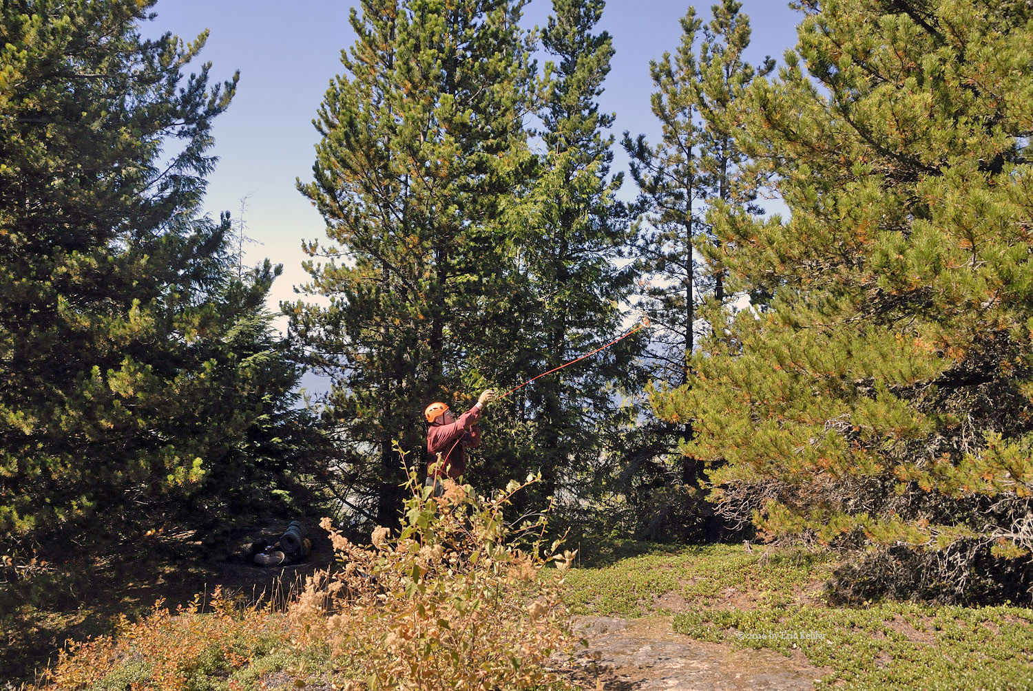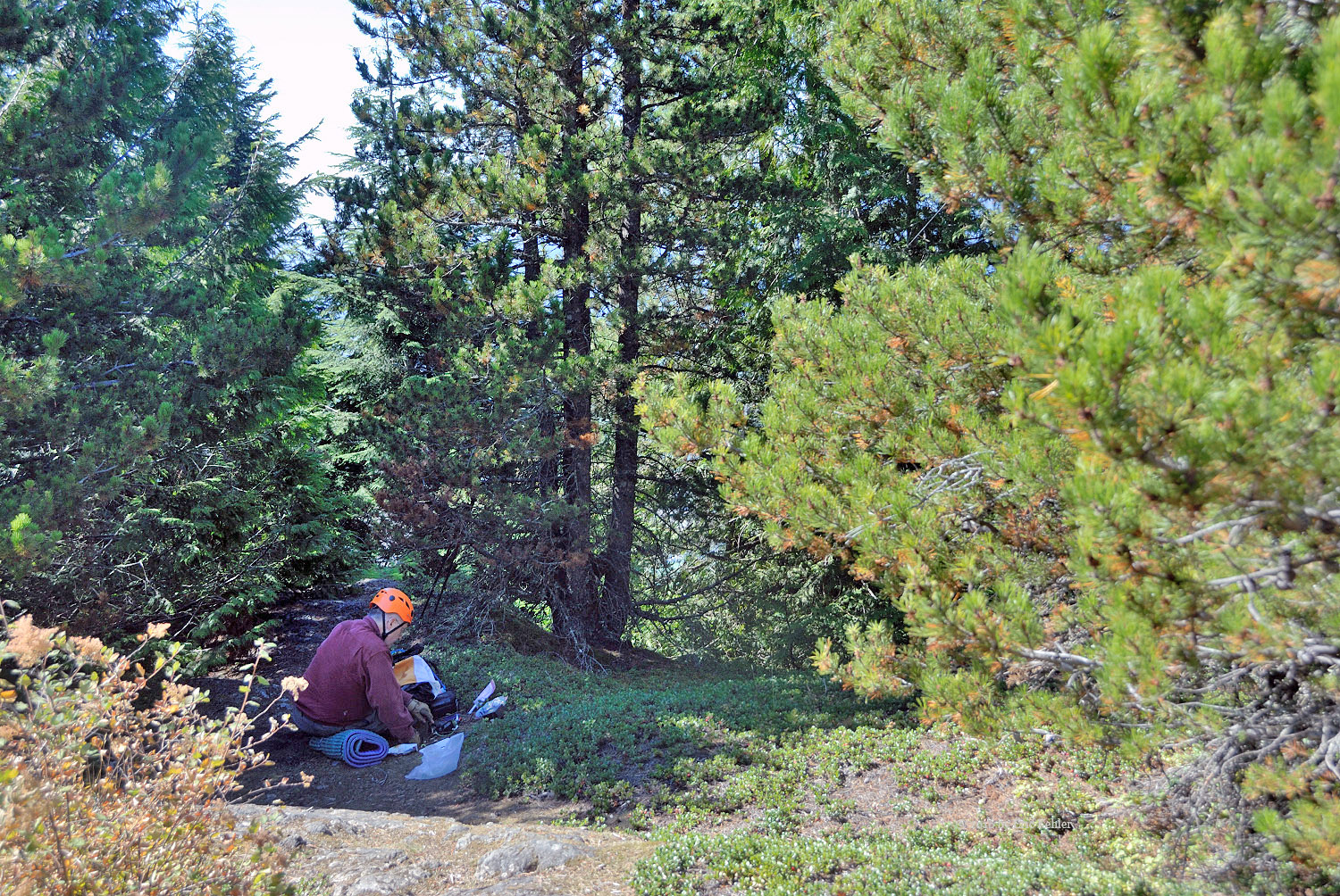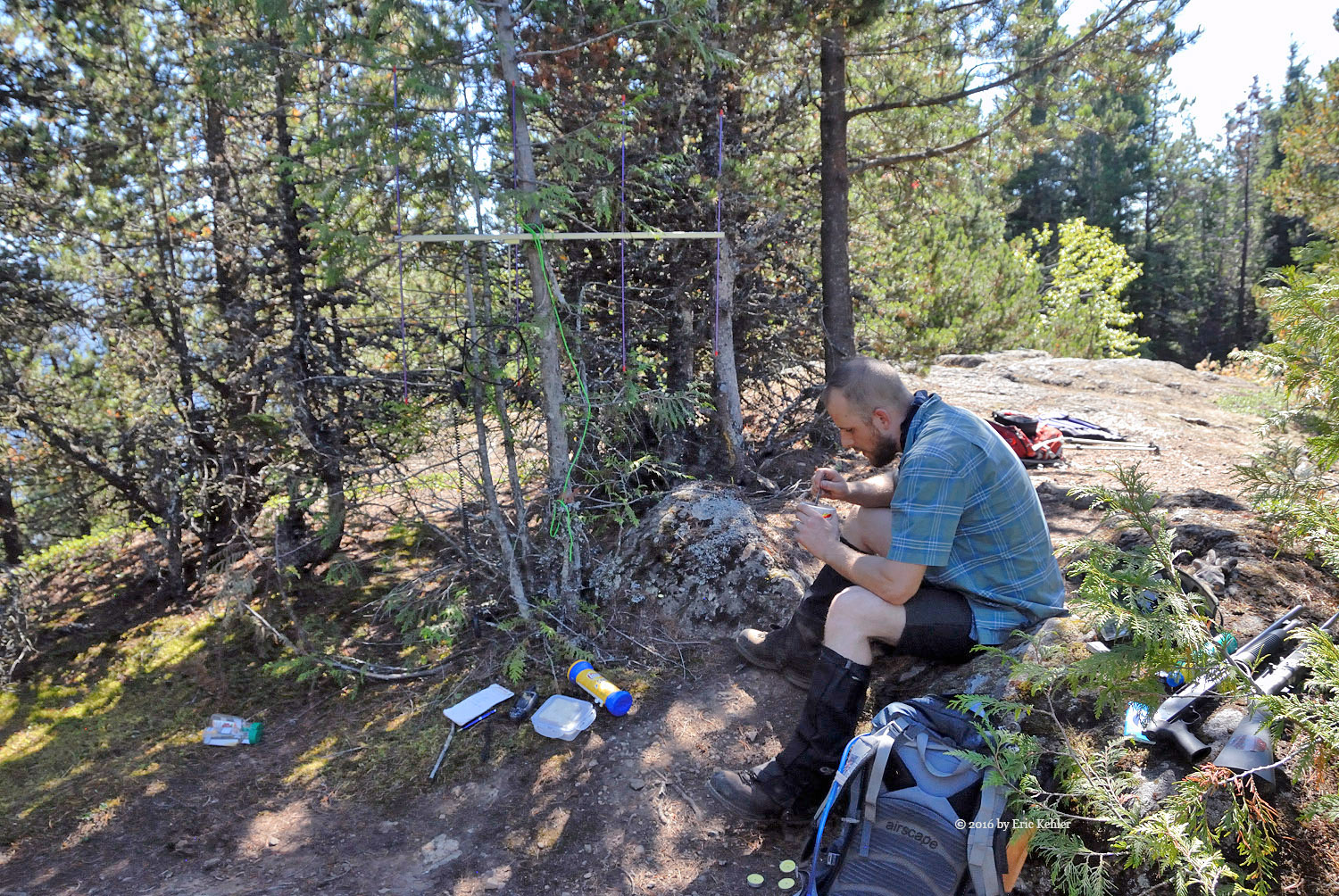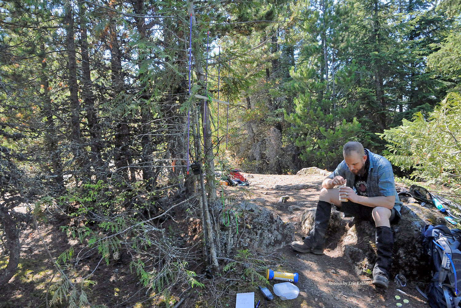 A short distance further and we were at the designated summit. I was able to put out a quick call to club member Ralph who had been waiting and calling me throughout the morning. We logged the first contact from the summit and the mountain became officially activated! It was 2:17! Much later than expected but the hike took longer than planned in the heat. I then set up my 2m yagi and proceeded to make 5 more contacts between mouthfuls of lunch. Bruce soon was also on the summit and getting his KX2 radio set up, he tossed a line in one of the convenient trees and pulled up his wire antenna. He soon was making a few Morse code contacts and getting his needed four contacts. The bands were not cooperating and it took some time to get them.